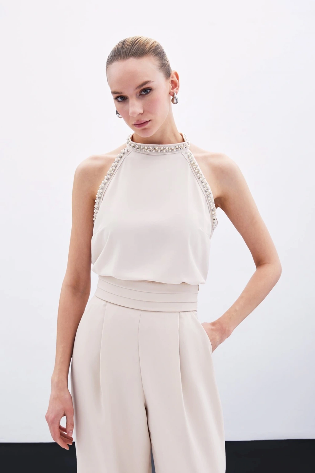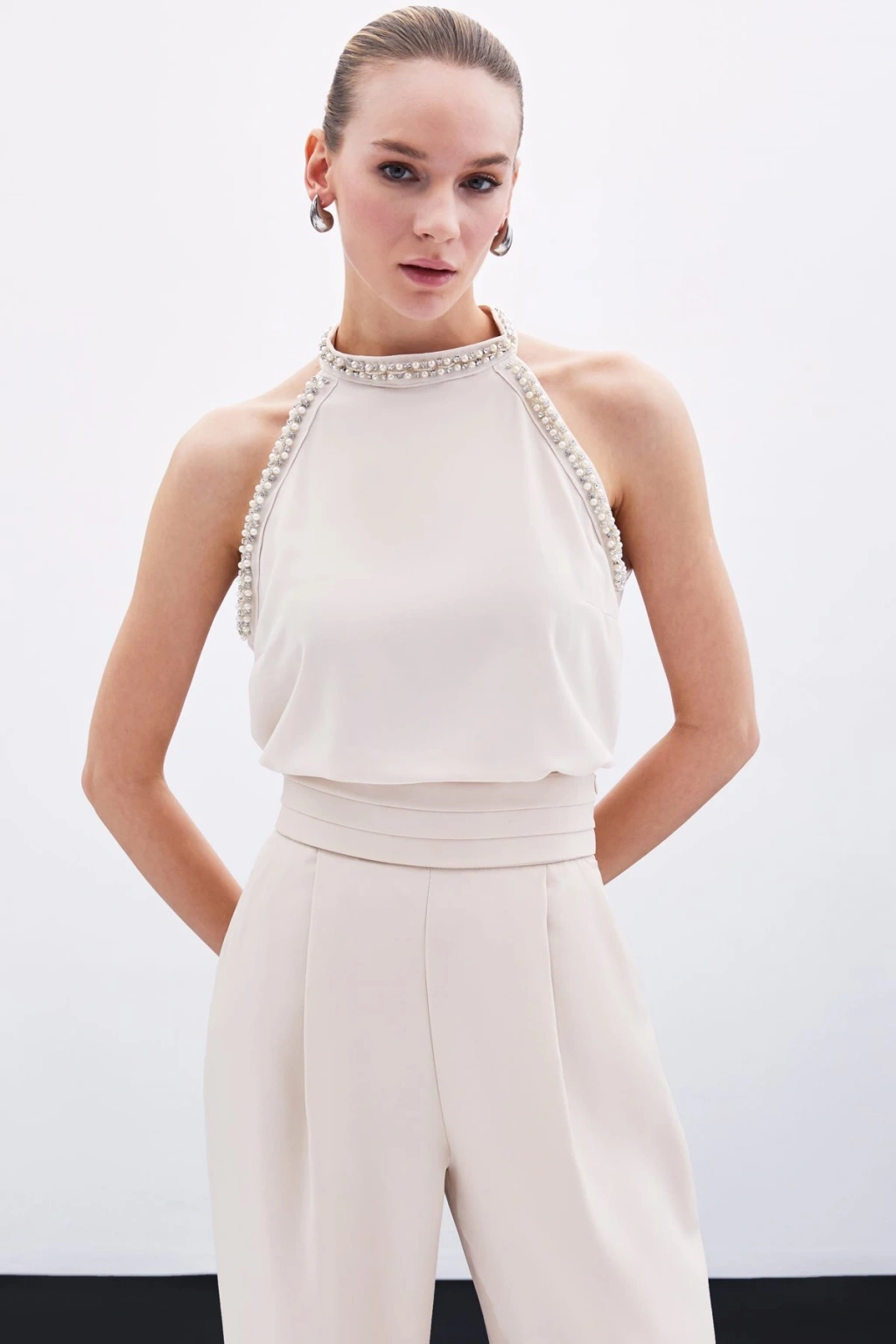 Aksesuar Detaylı Kolsuz Bluz - Bej