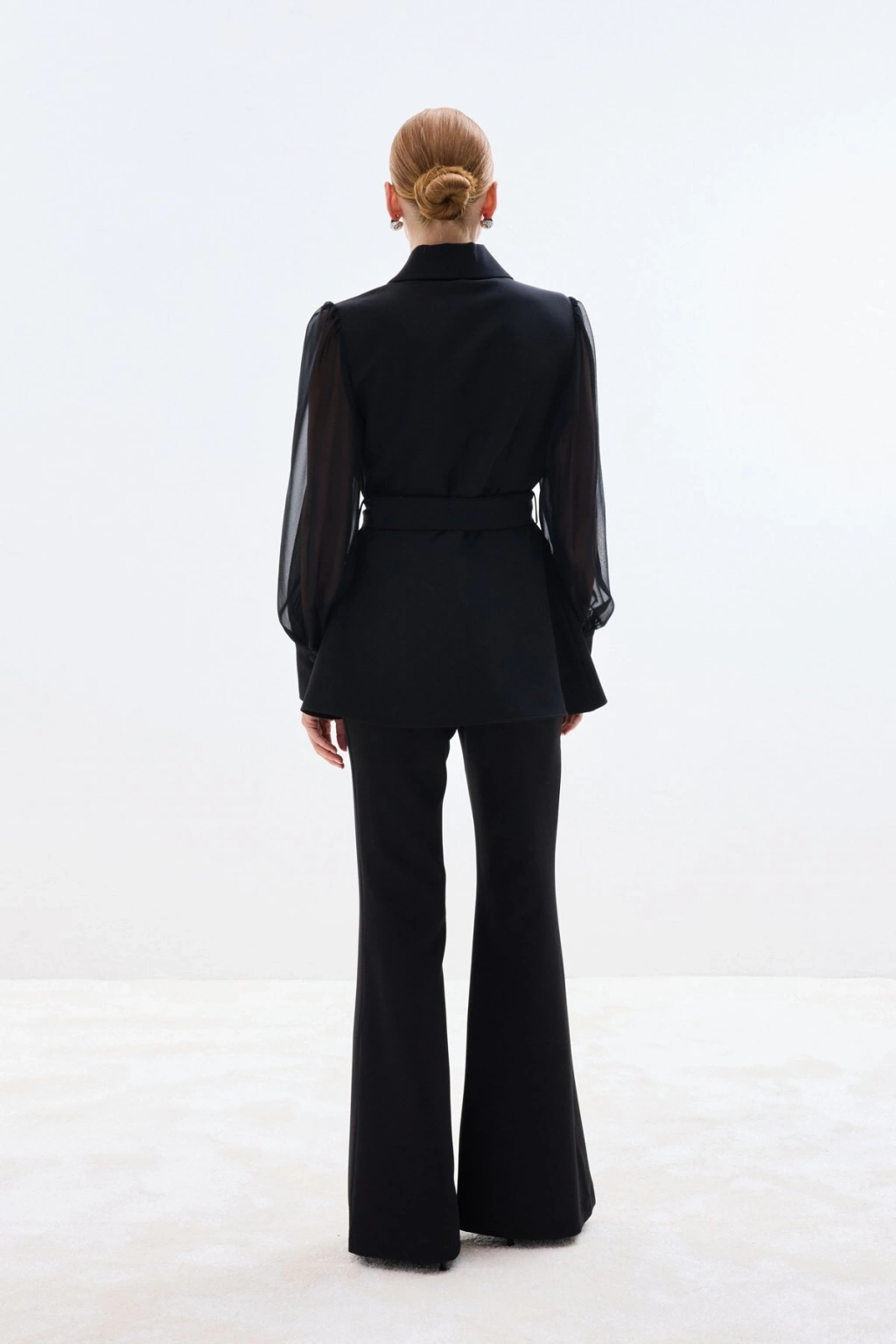 Anvelop Yaka Bağcıklı Tül Bluz Siyah