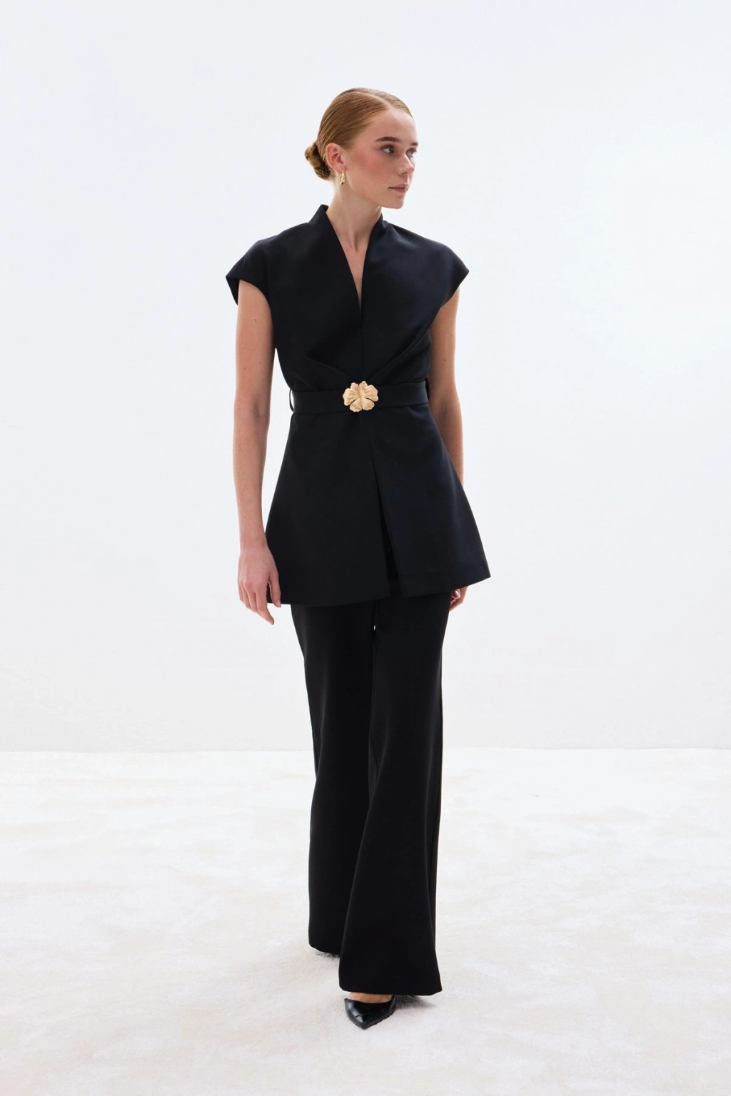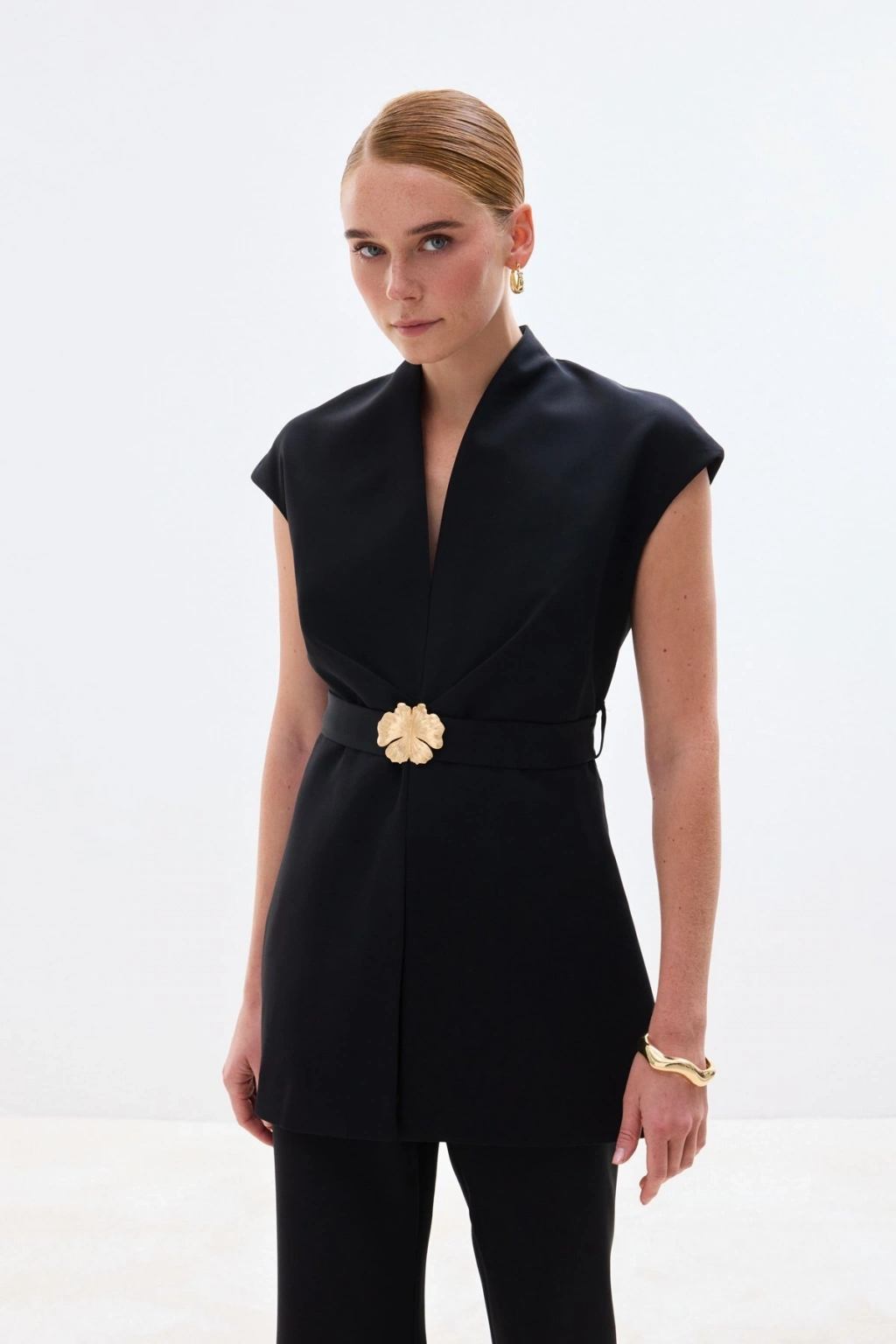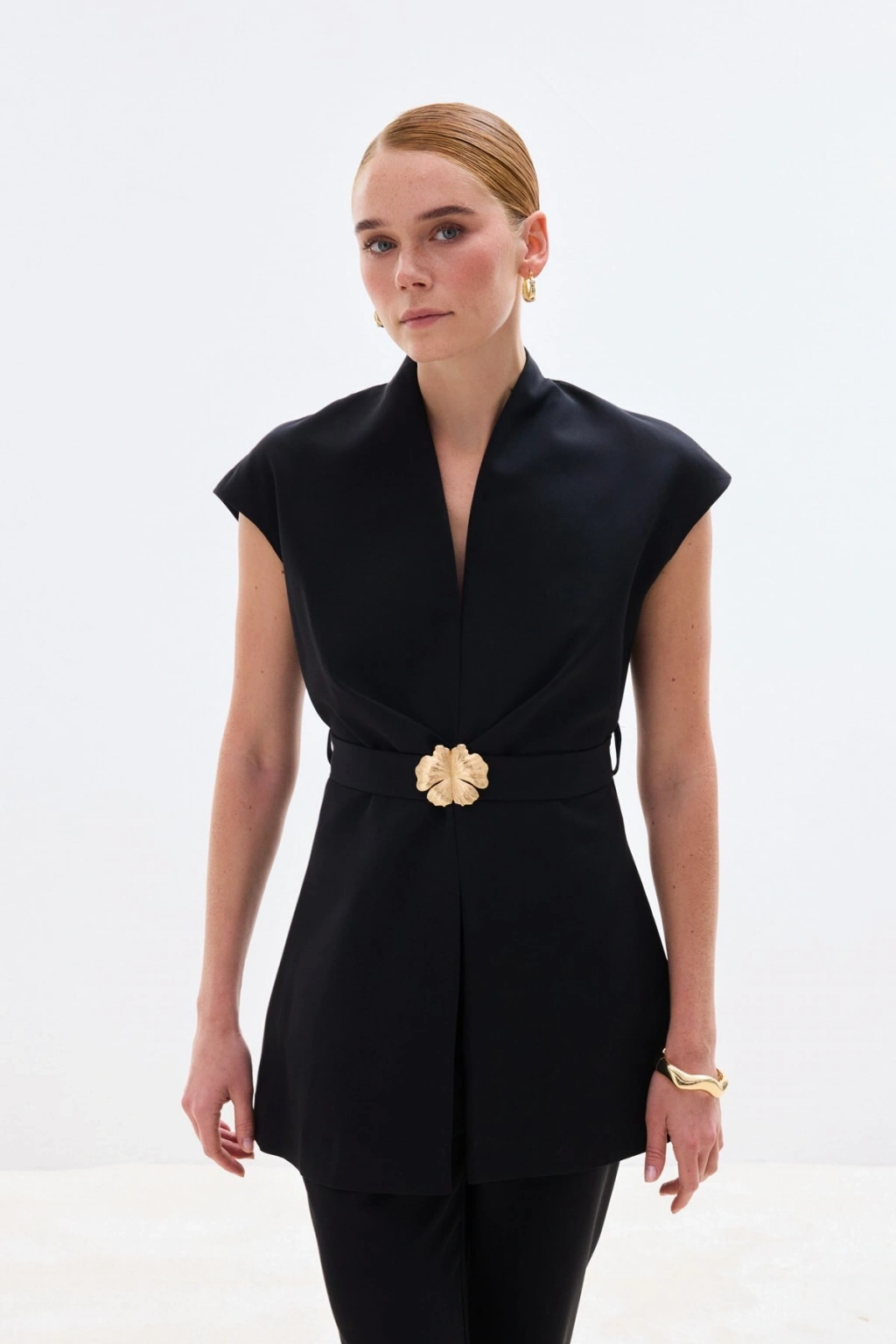 Aksesuar Kuşaklı Kolsuz Bluz - Siyah
