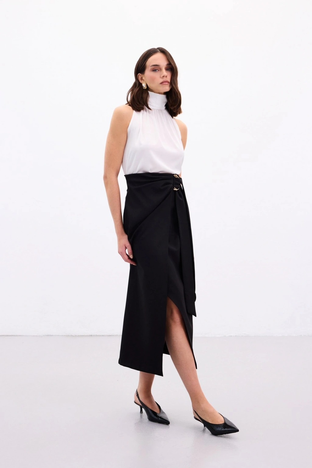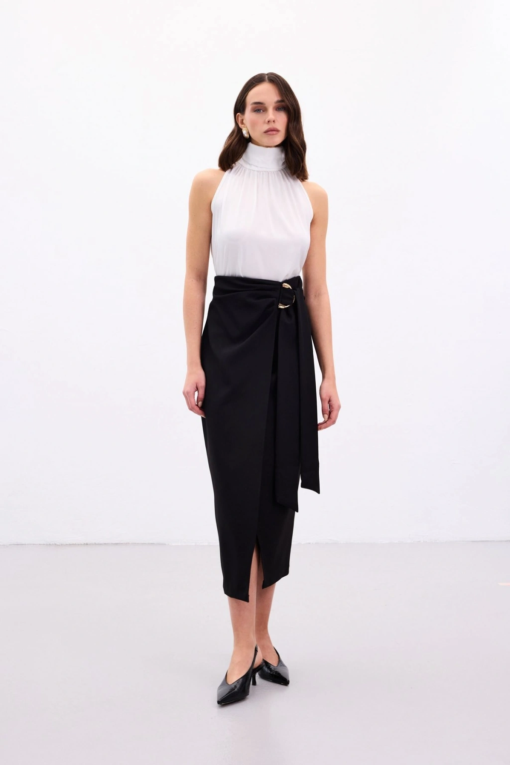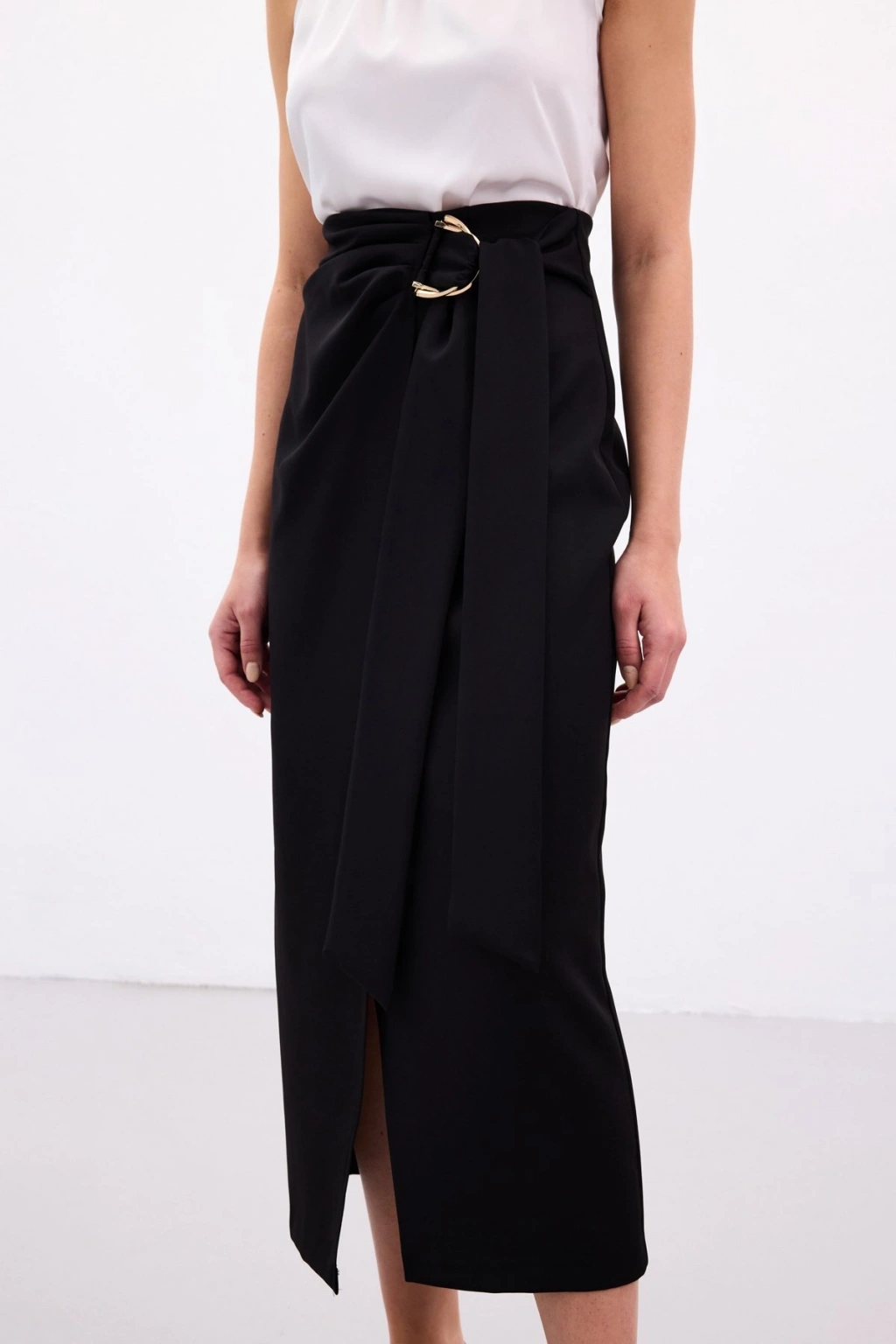 Aksesuar Kuşaklı Yırtmaçlı Etek - Siyah