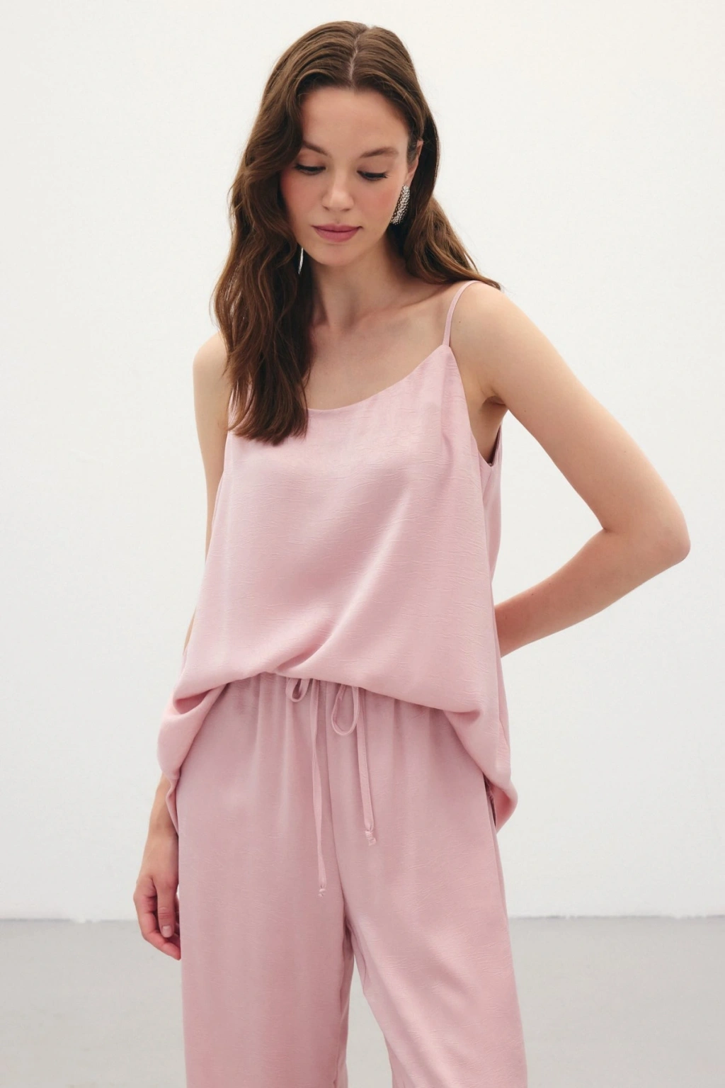 Askılı Saten Bluz - Pudra