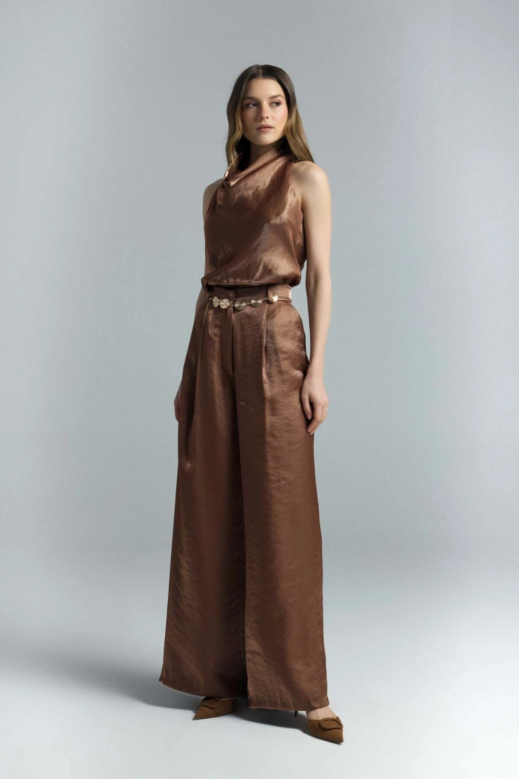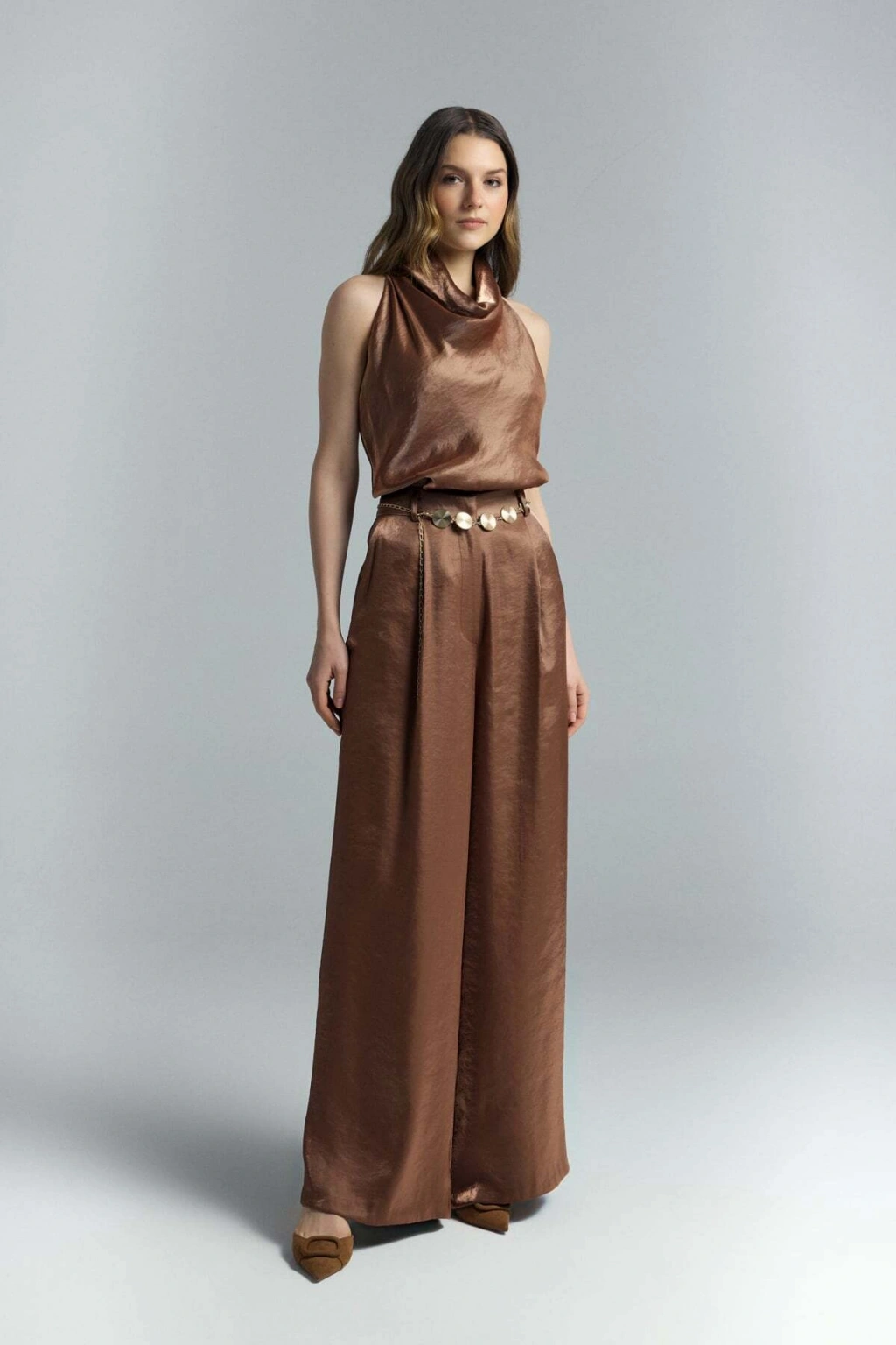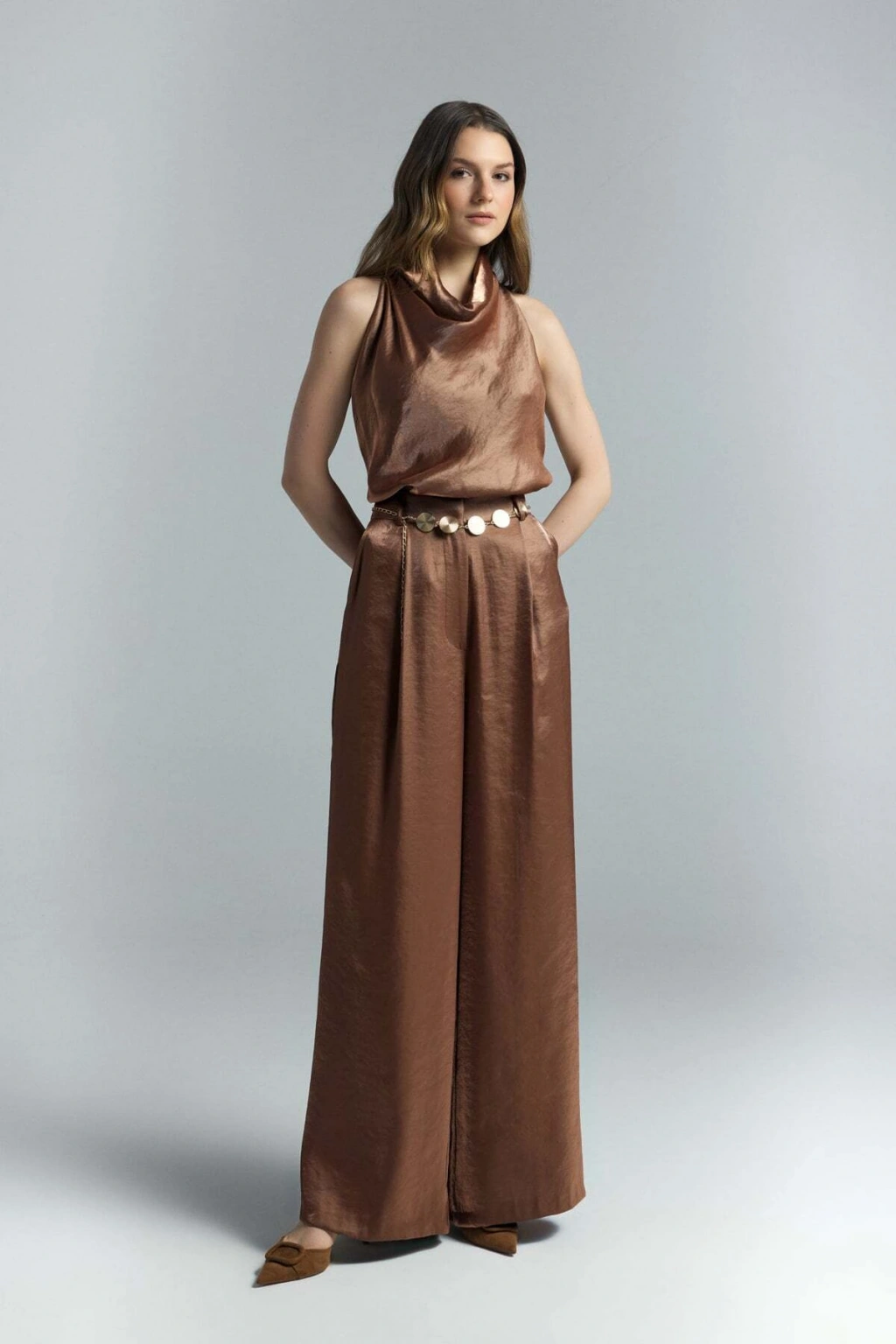 Kemer Detaylı Saten Pantolon - Taş