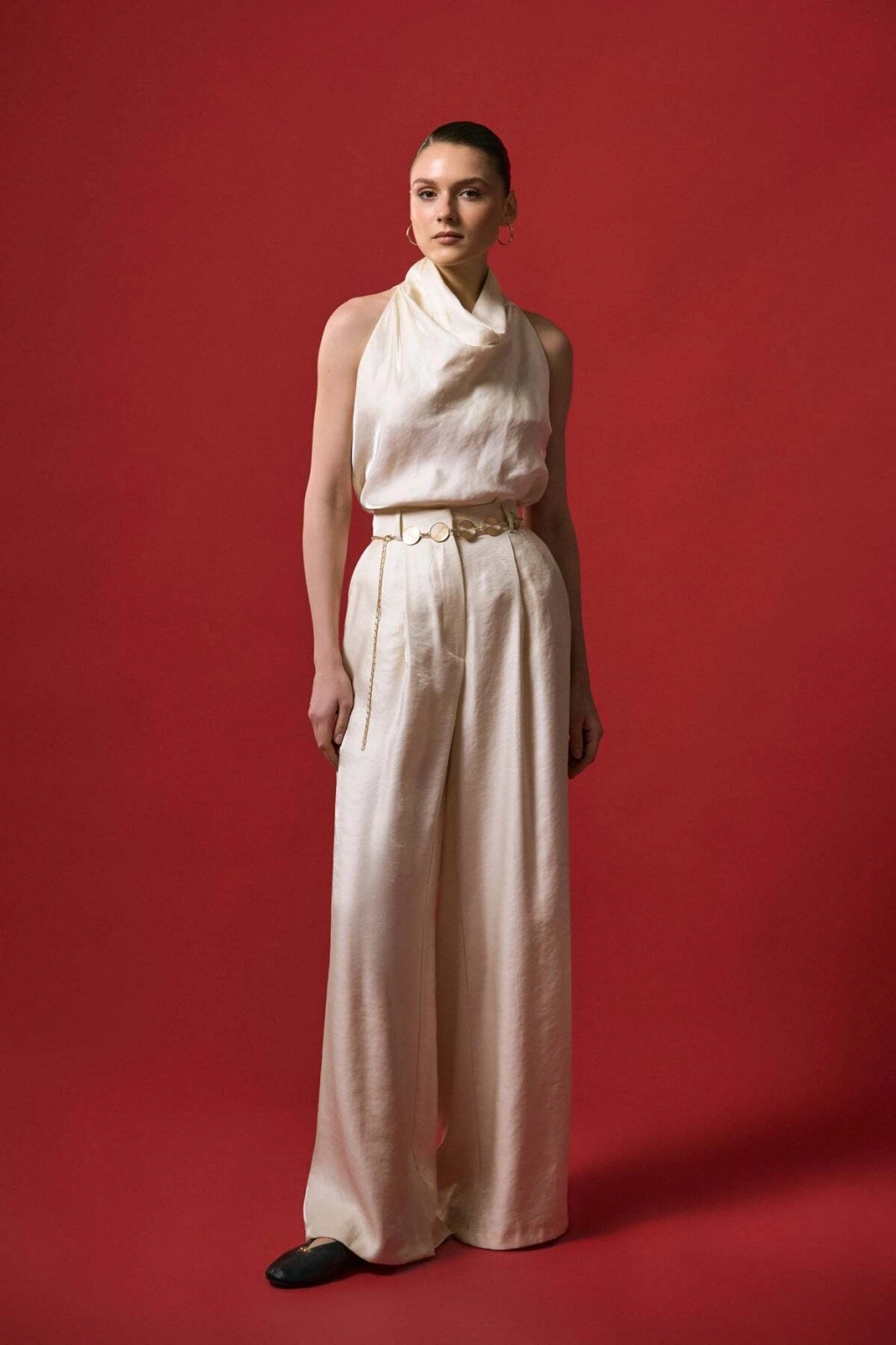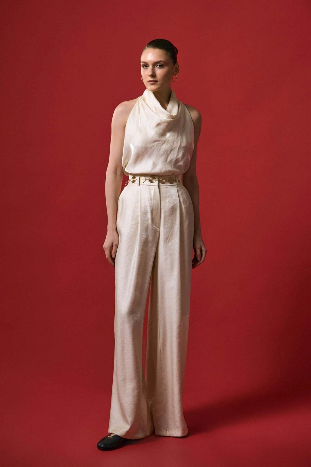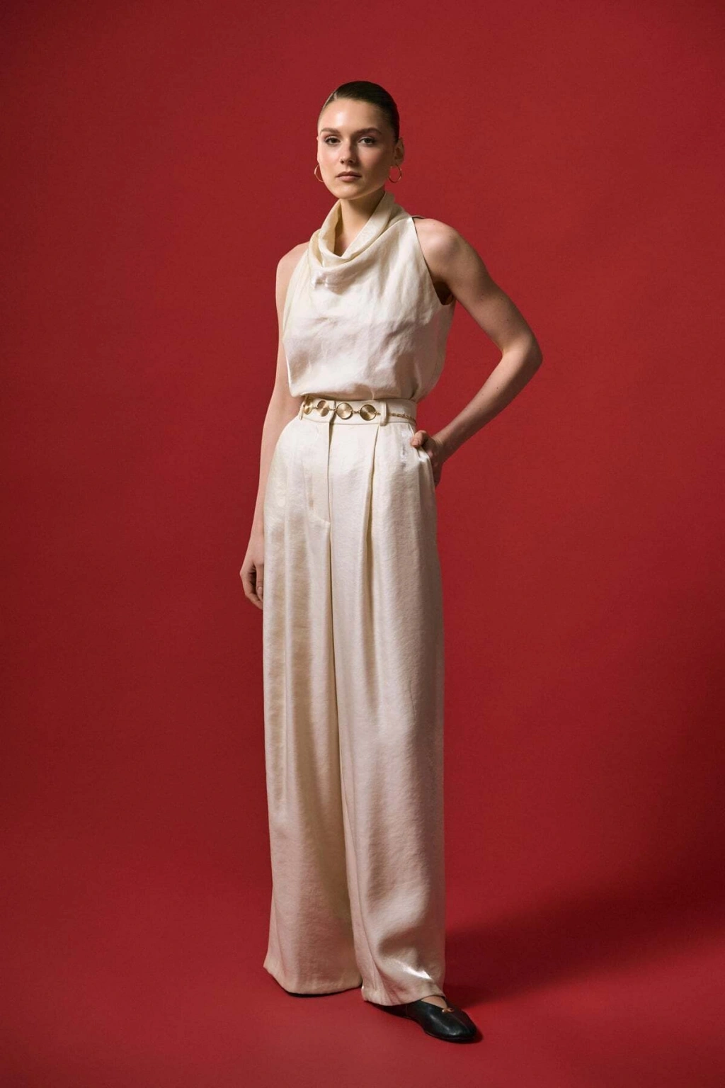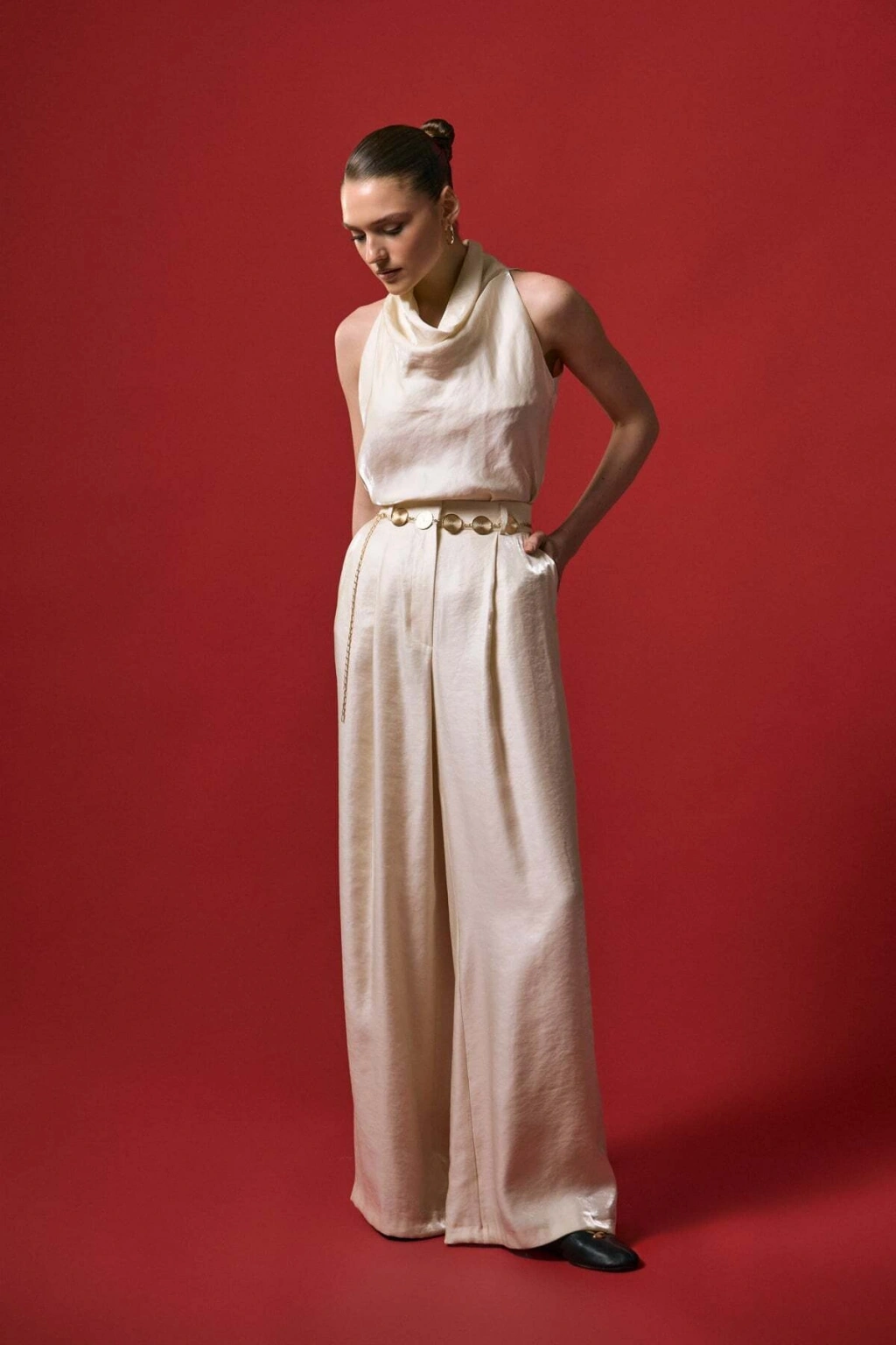 Kemer Detaylı Saten Pantolon - Taş