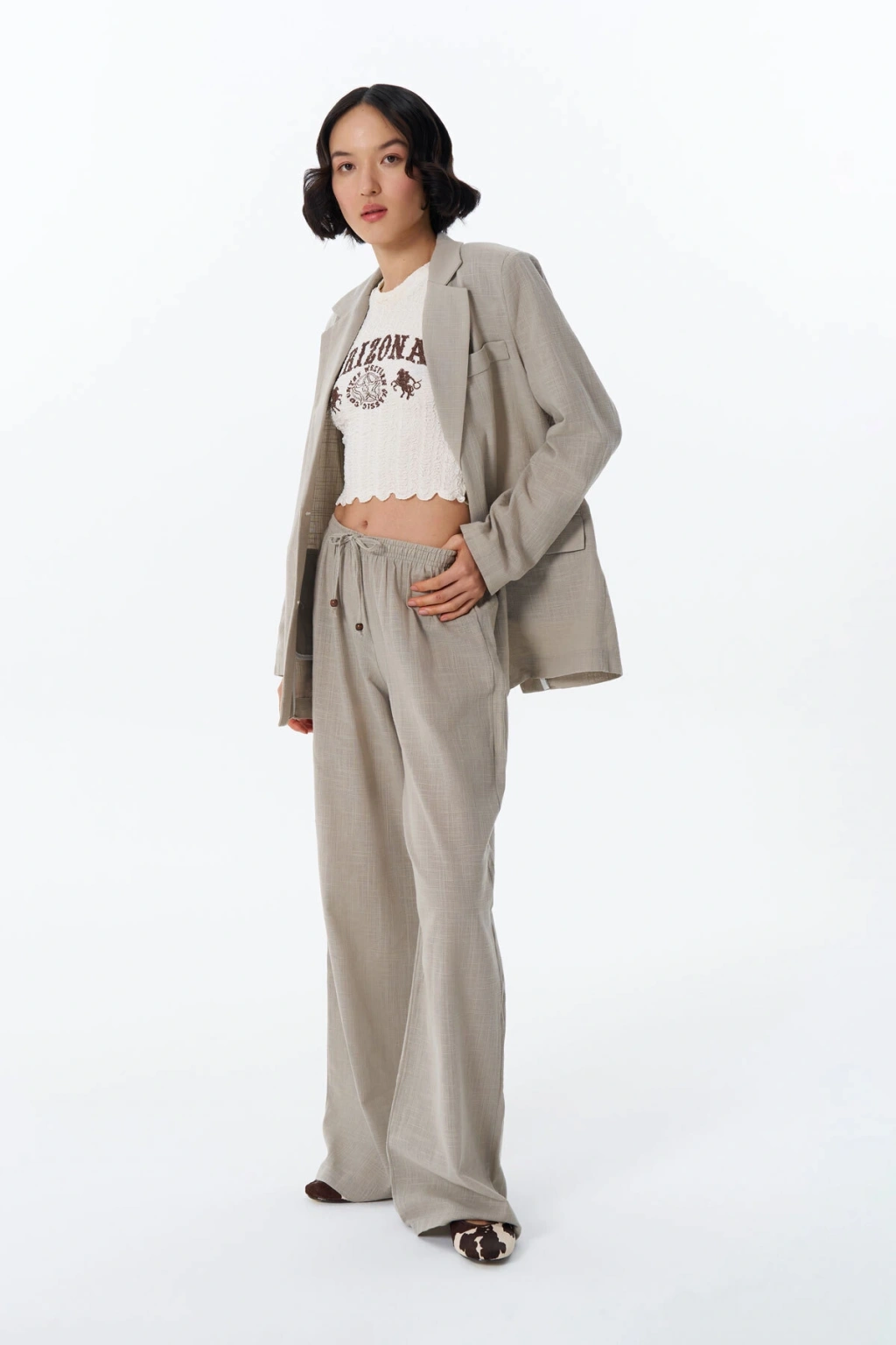 Lastİklİ yüksek bel, ahşap boncuk detaylı bağcıklı, bol paça pantolon.