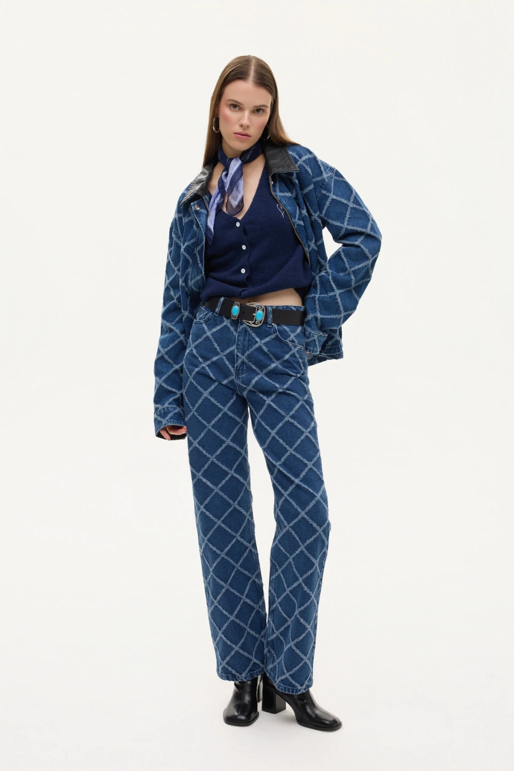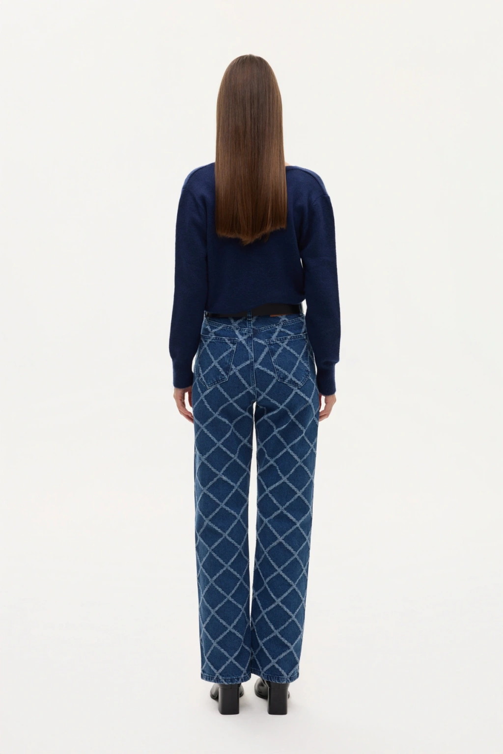 Yüksek bel, düz paça, baklava desenlİ kumaştan, ceplİ, fermuar ve düğme kapamalı, bol paça kot pantolon.