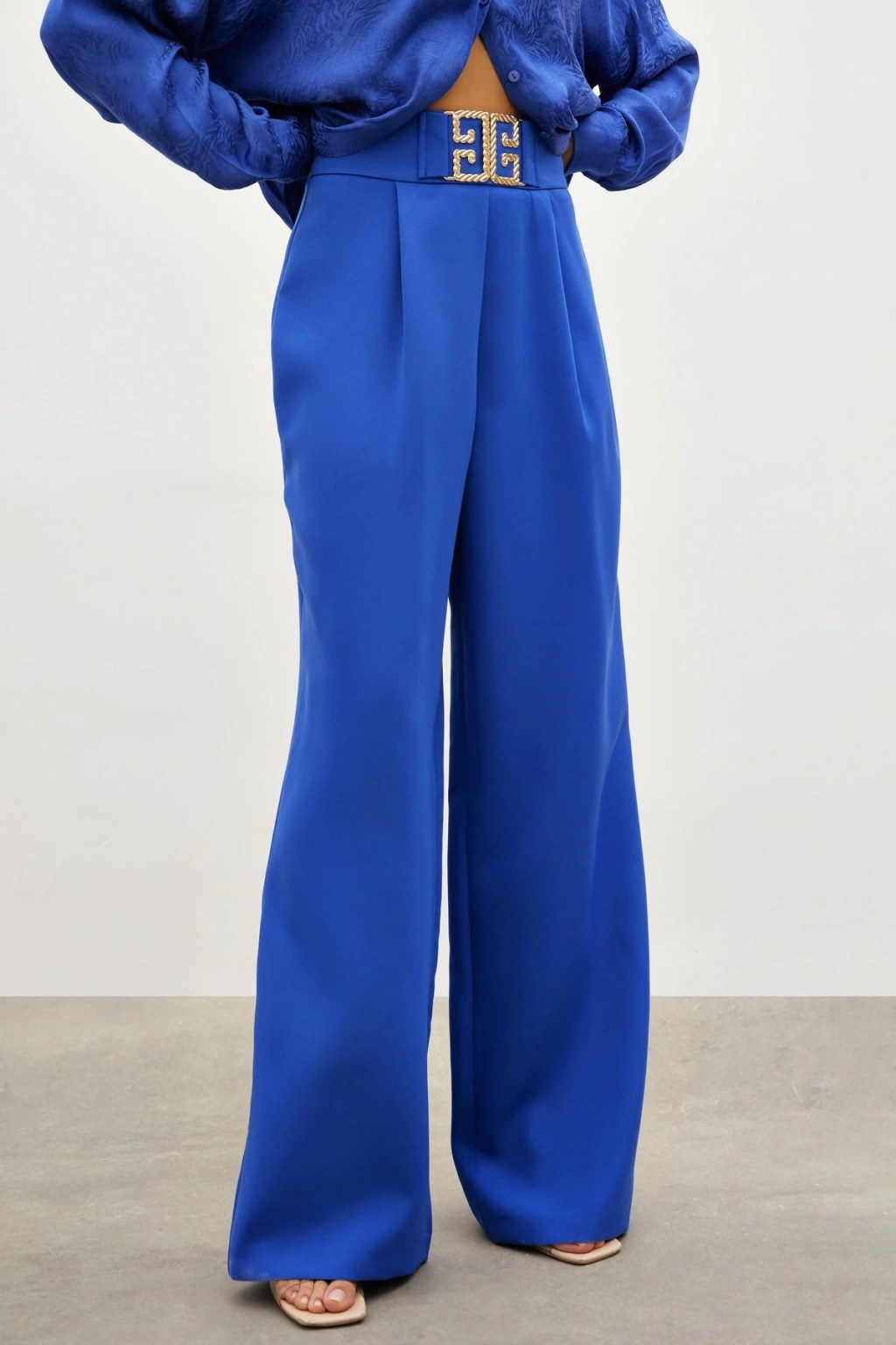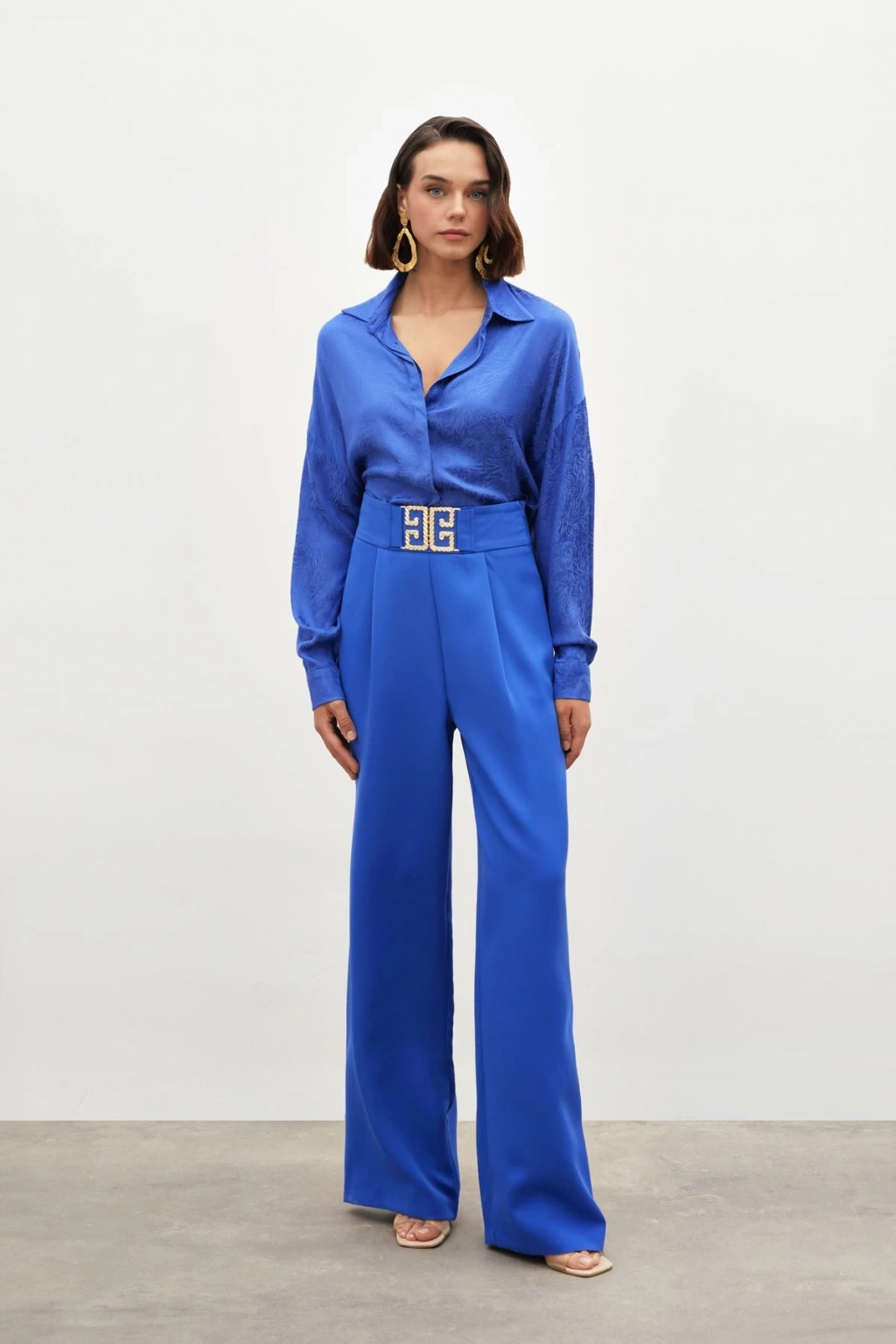 Bel Aksesuarlı Bol Paça Pantolon - SAX MAVİ