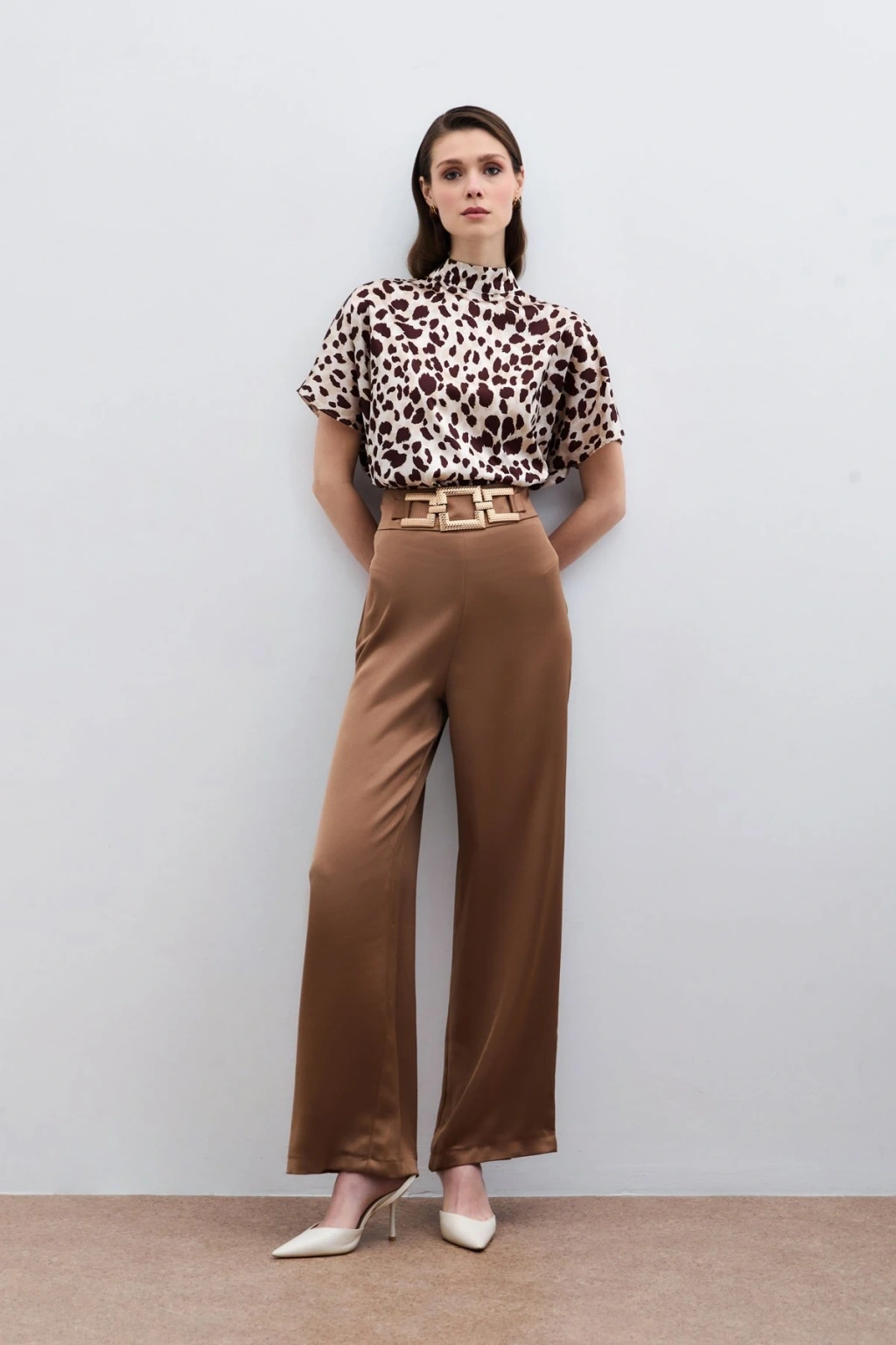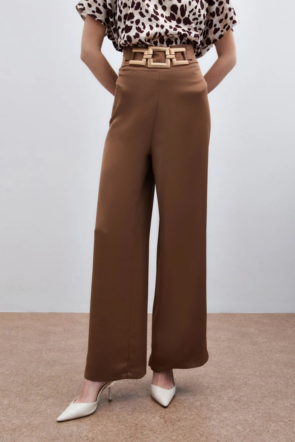 Bel Kemerli Saten Krep Pantolon - Camel