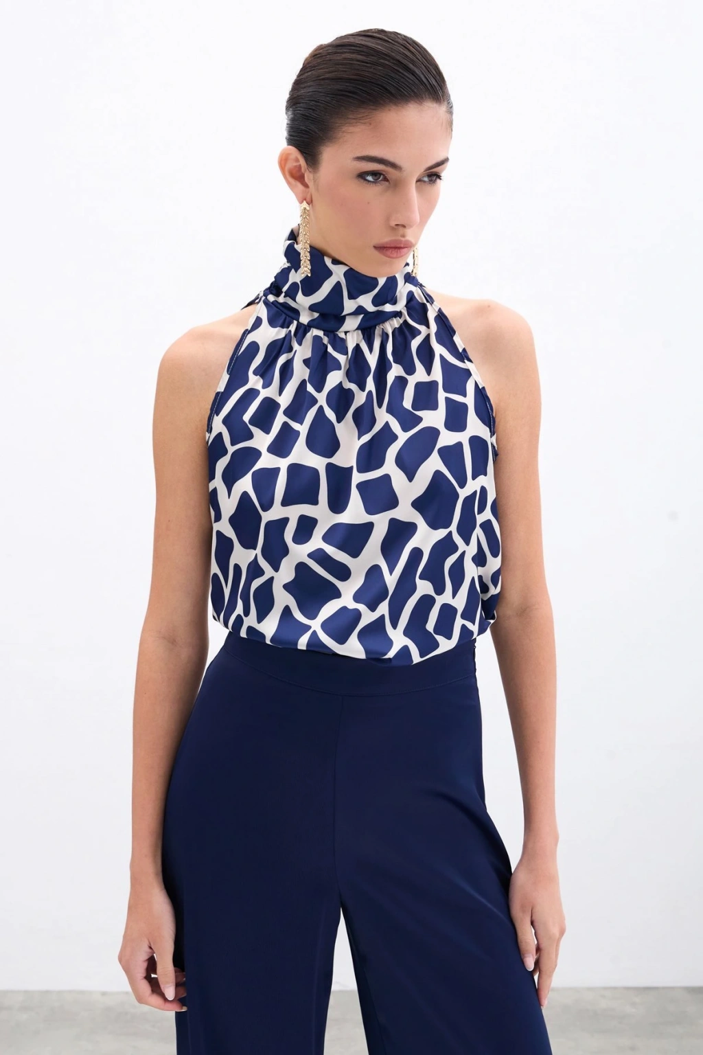 Boğazlı Kolsuz Bluz - Bej-Lacivert