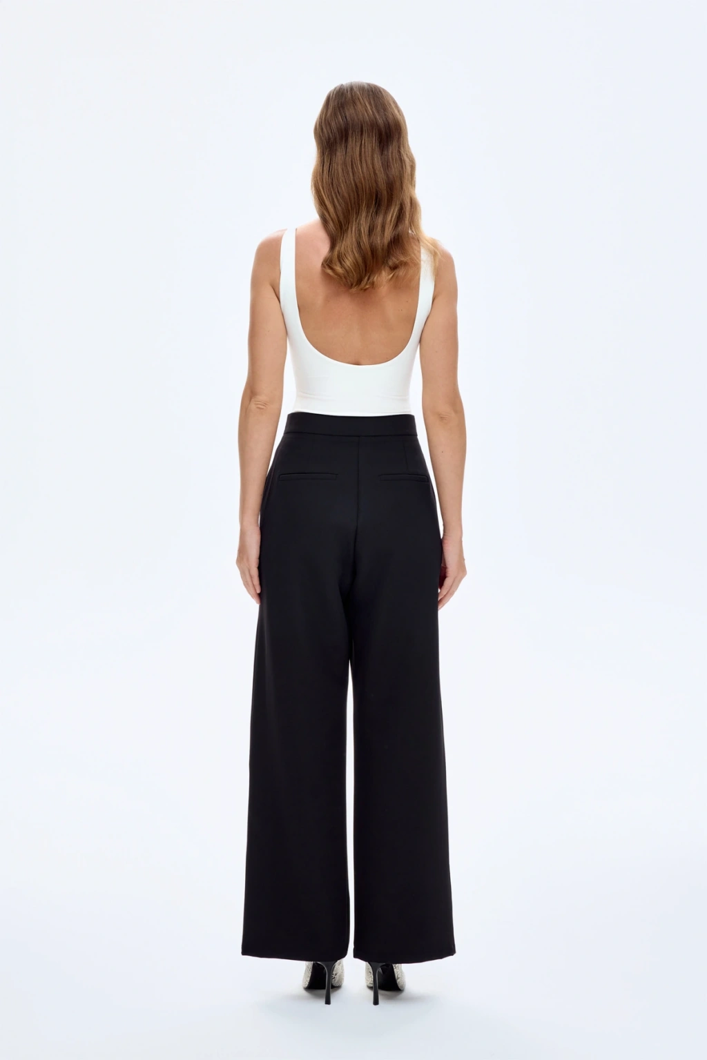 Düz kesİm, yüksek bel, yan ceplİ, fermuarlı ve kanca kapamalı, pİle detaylı, uzun boy, bol paça kumaş pantolon.