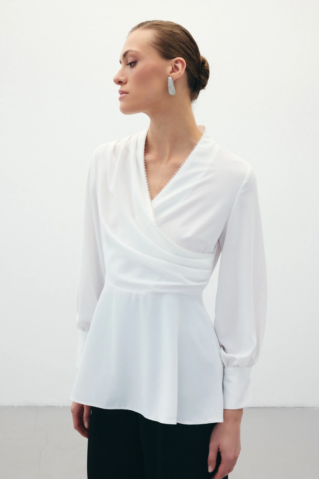 Boncuklu Yaka Kruvaze Bluz - Ekru