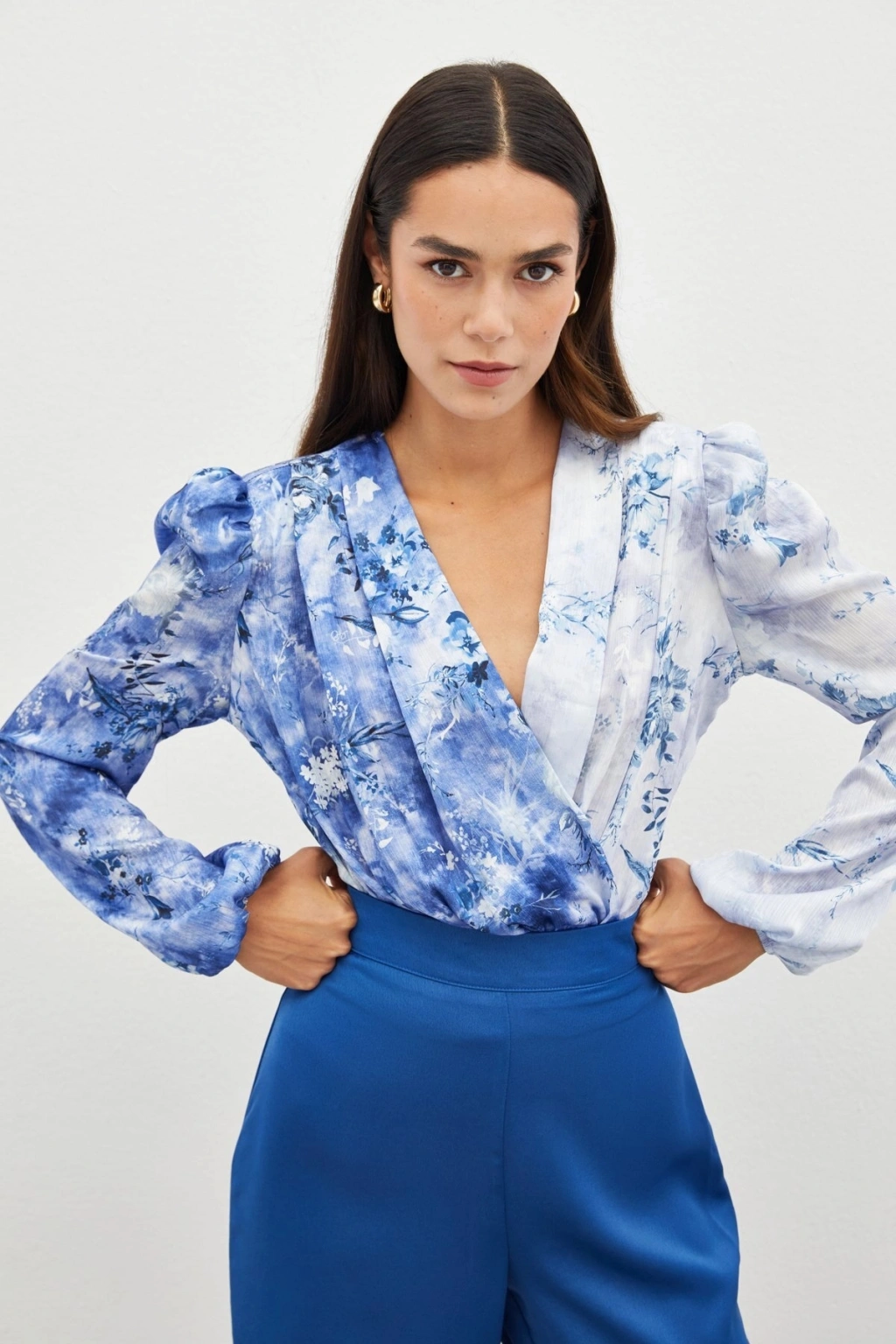 Çiçek Desenli Bodysuit Bluz - İNDİGO