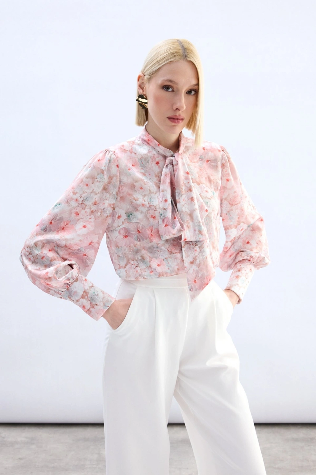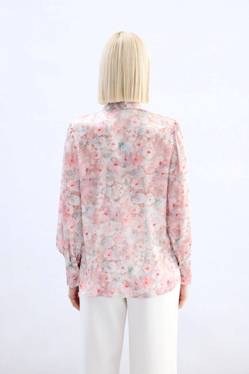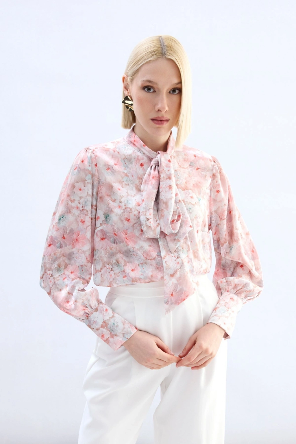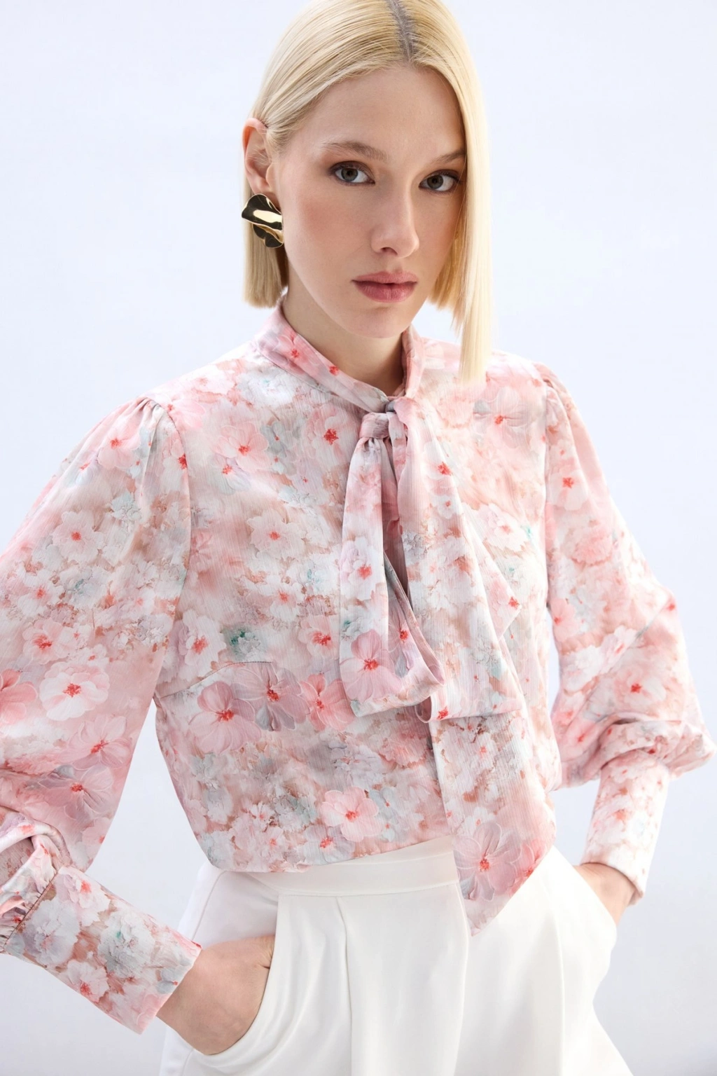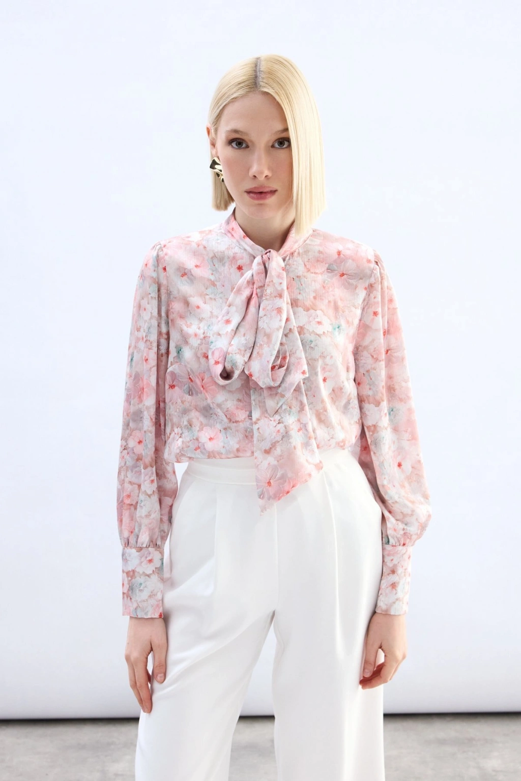Çiçek Desenli Fularlı Gömlek - Pudra