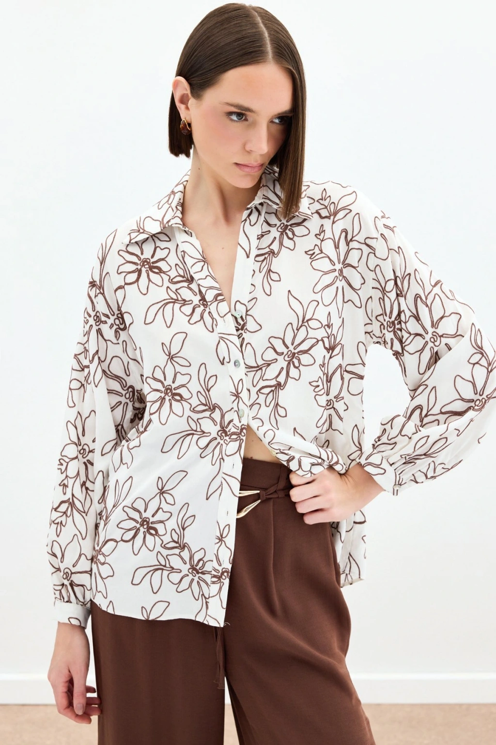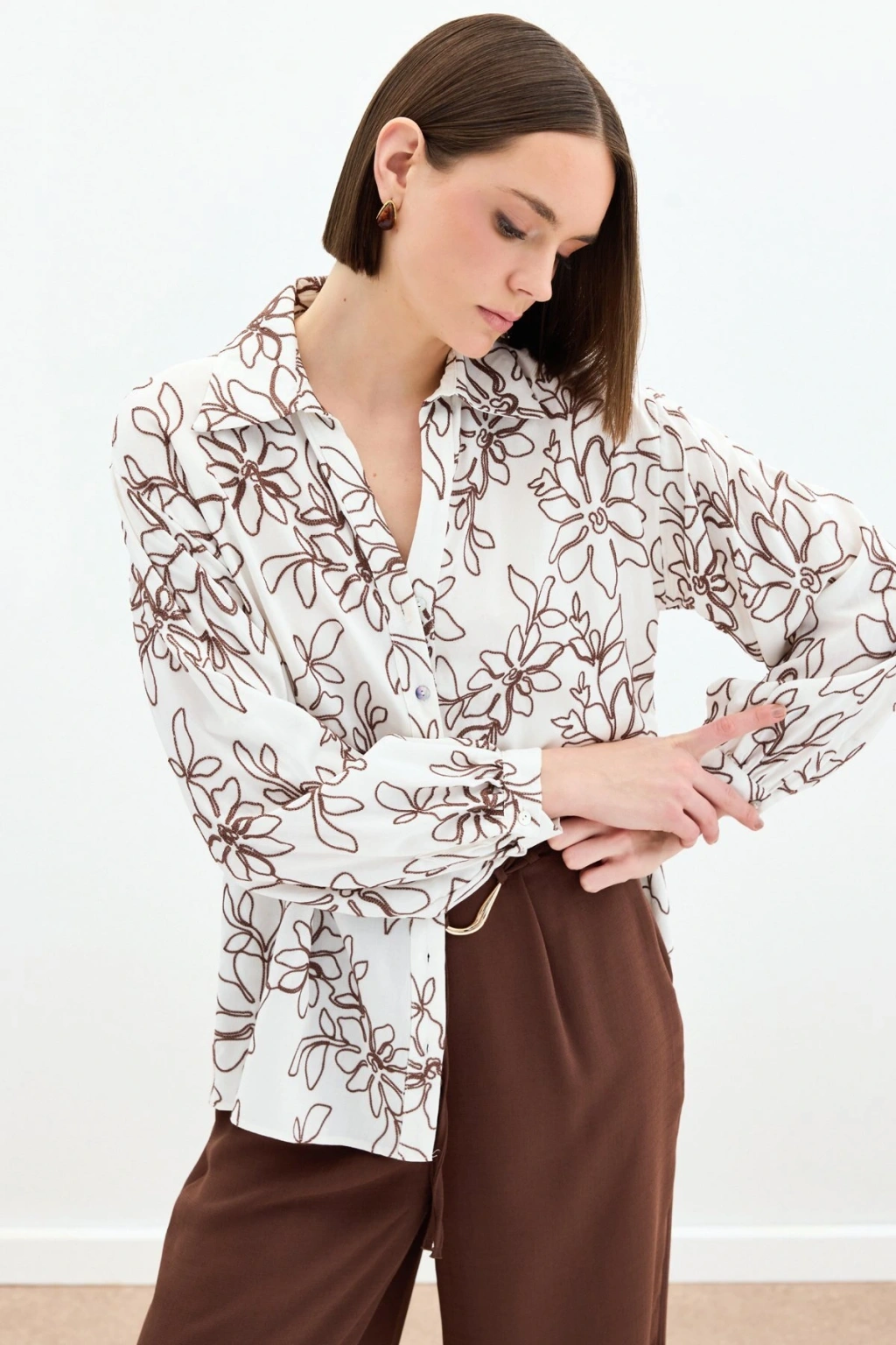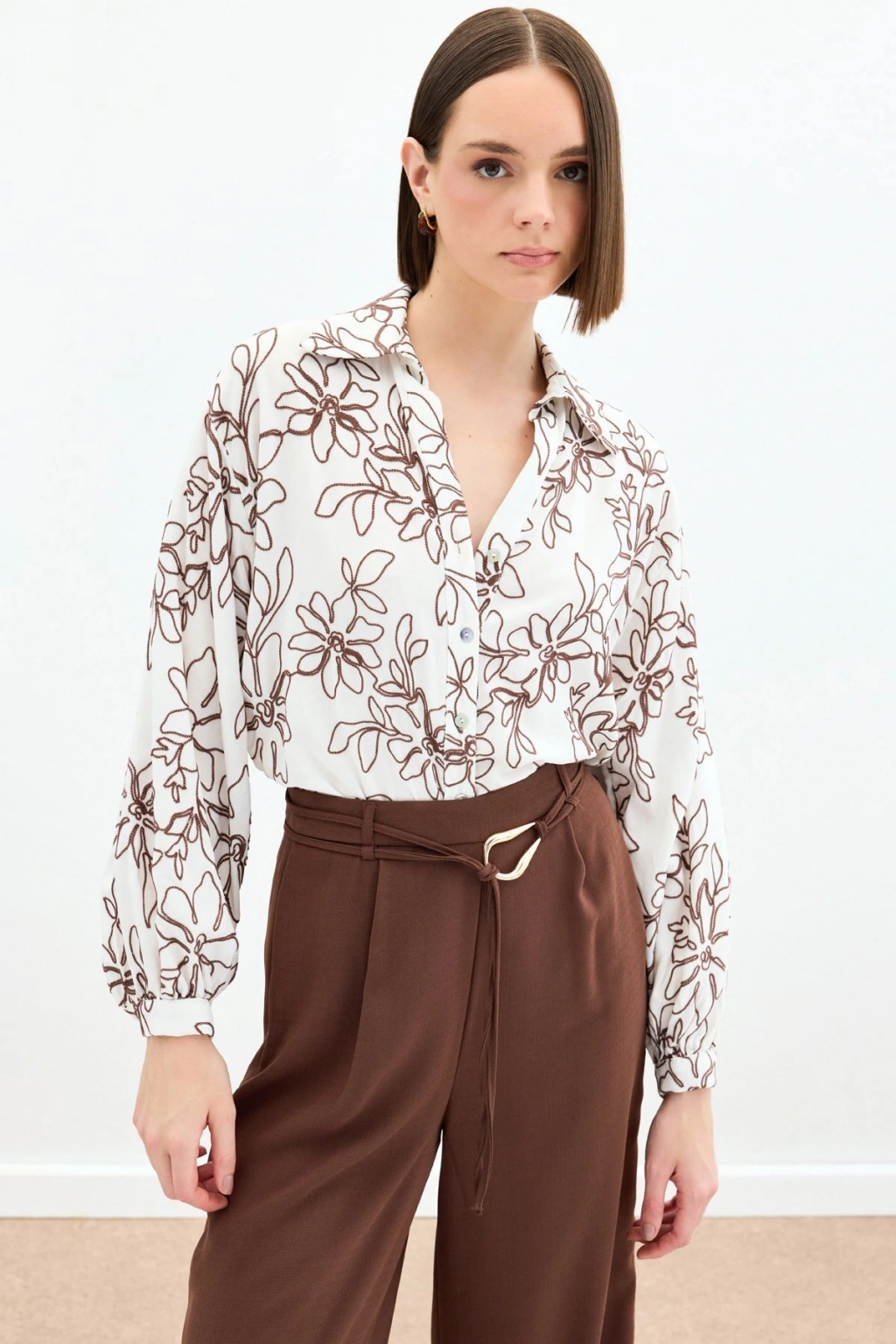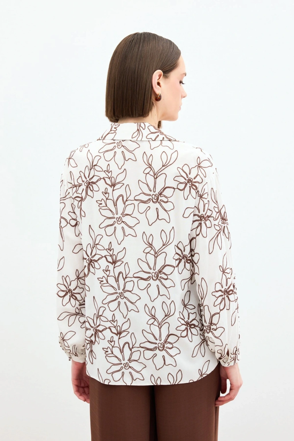Çiçek Nakışlı Viskon Gömlek - Kahve
