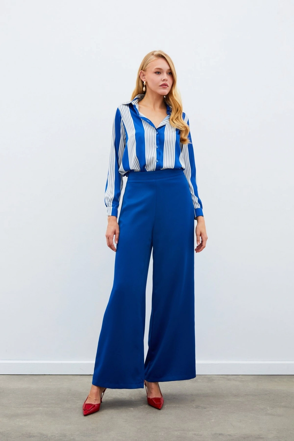 Şal Desen Kolu Katlamalı Gömlek - Mavi
