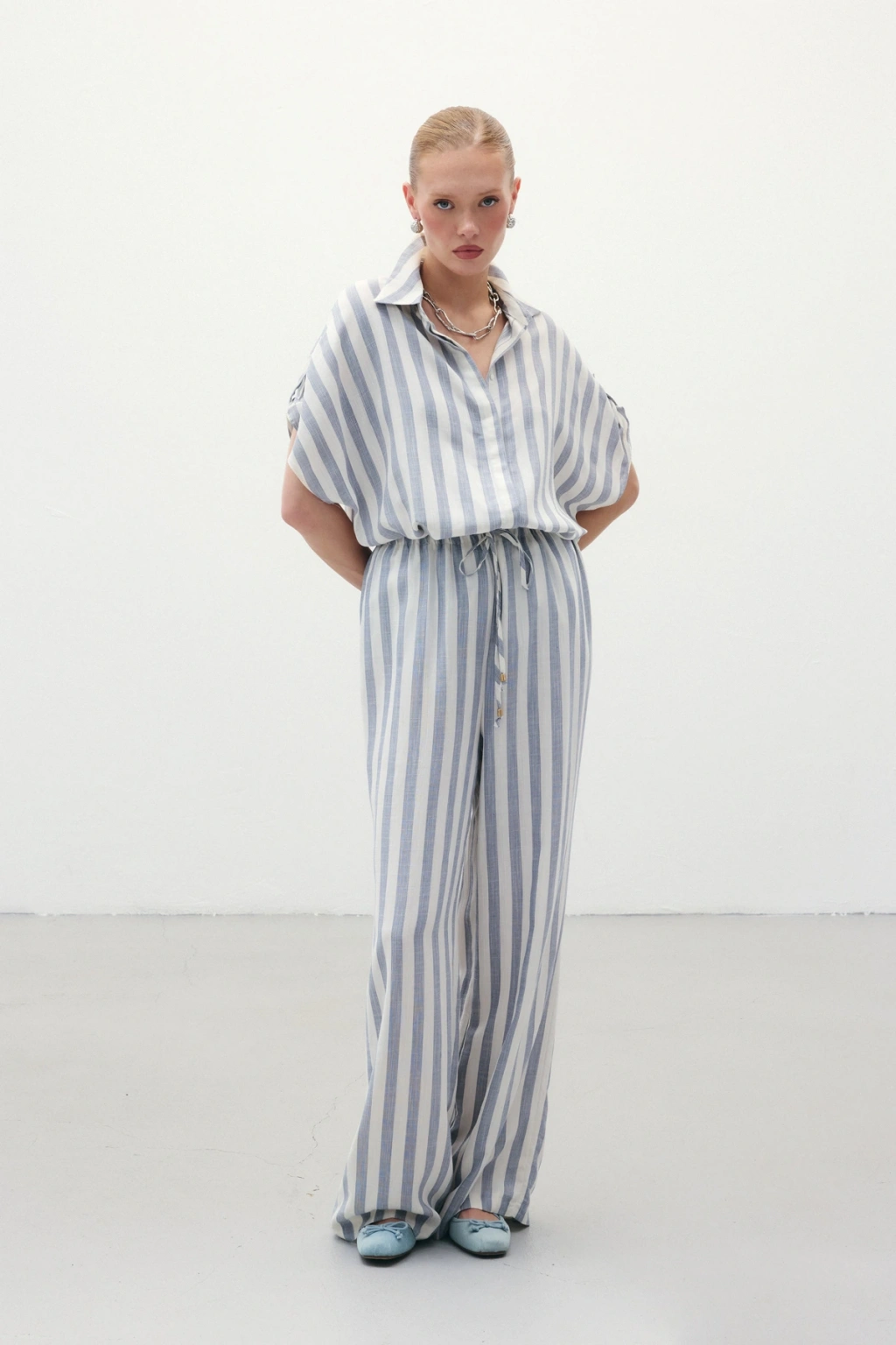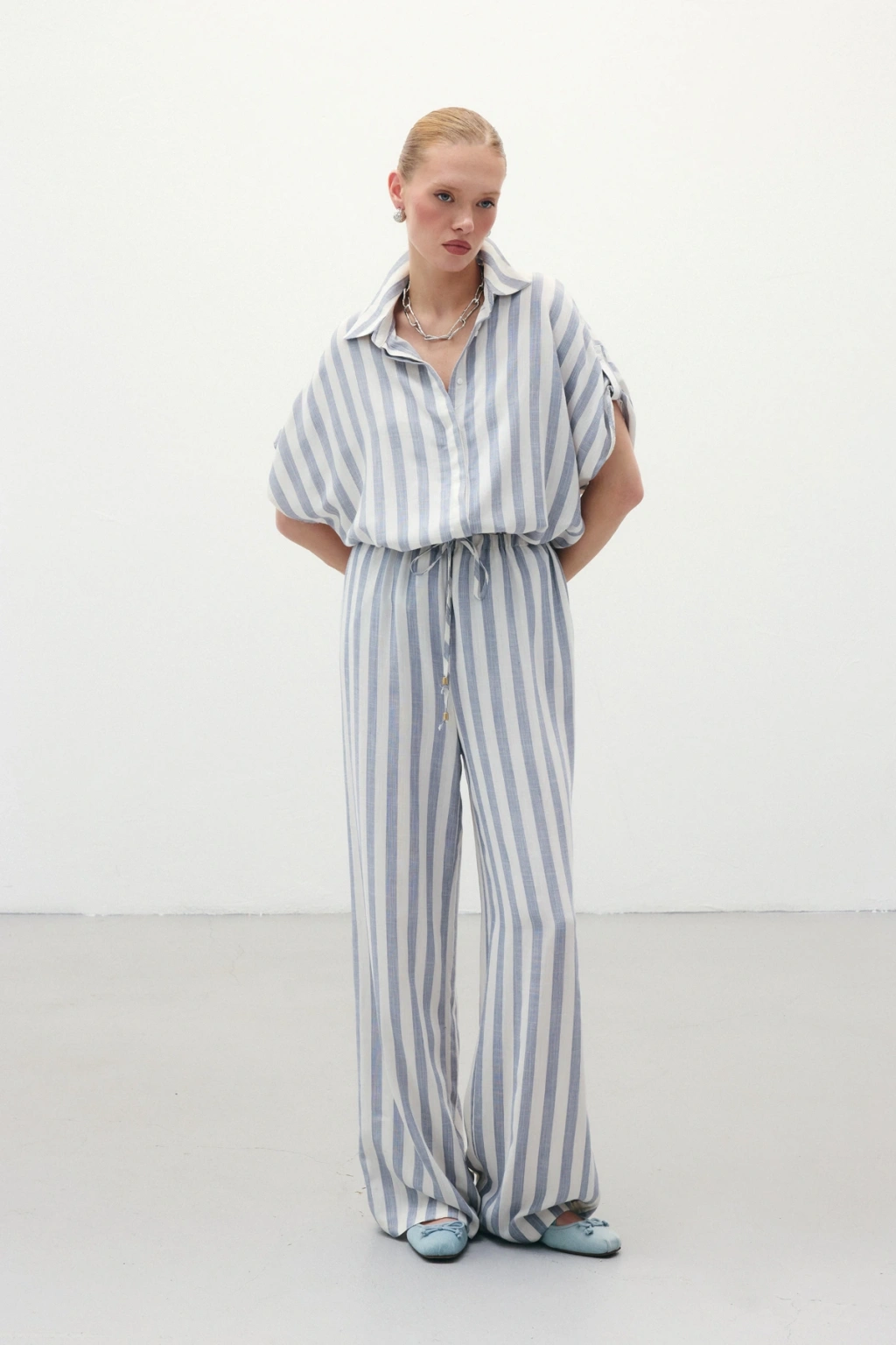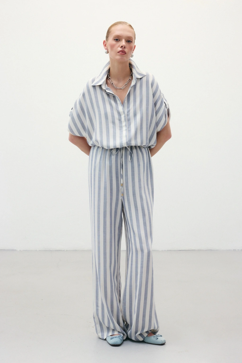 Çizgili Keten Karışımlı Pantolon - Lacivert