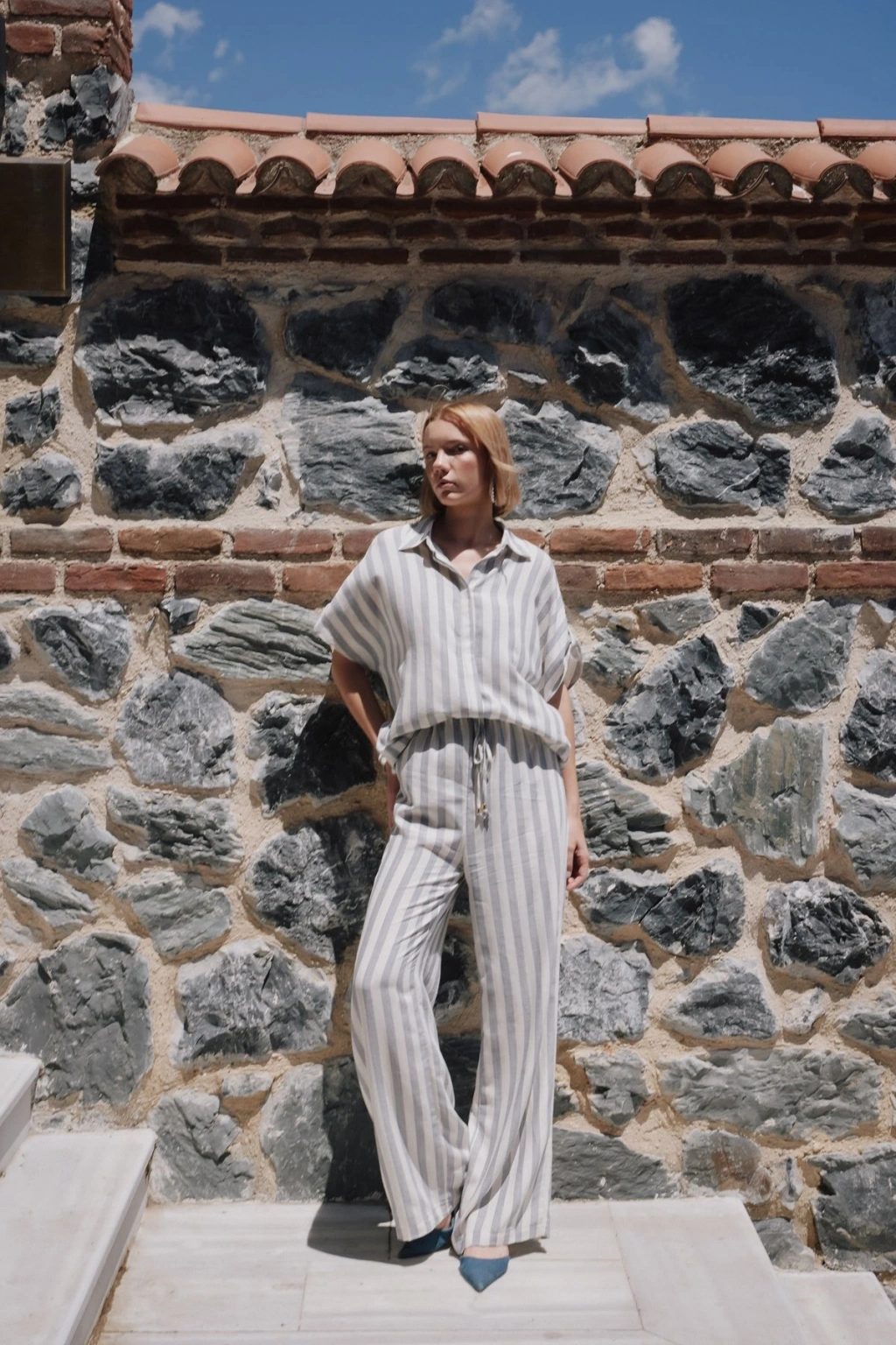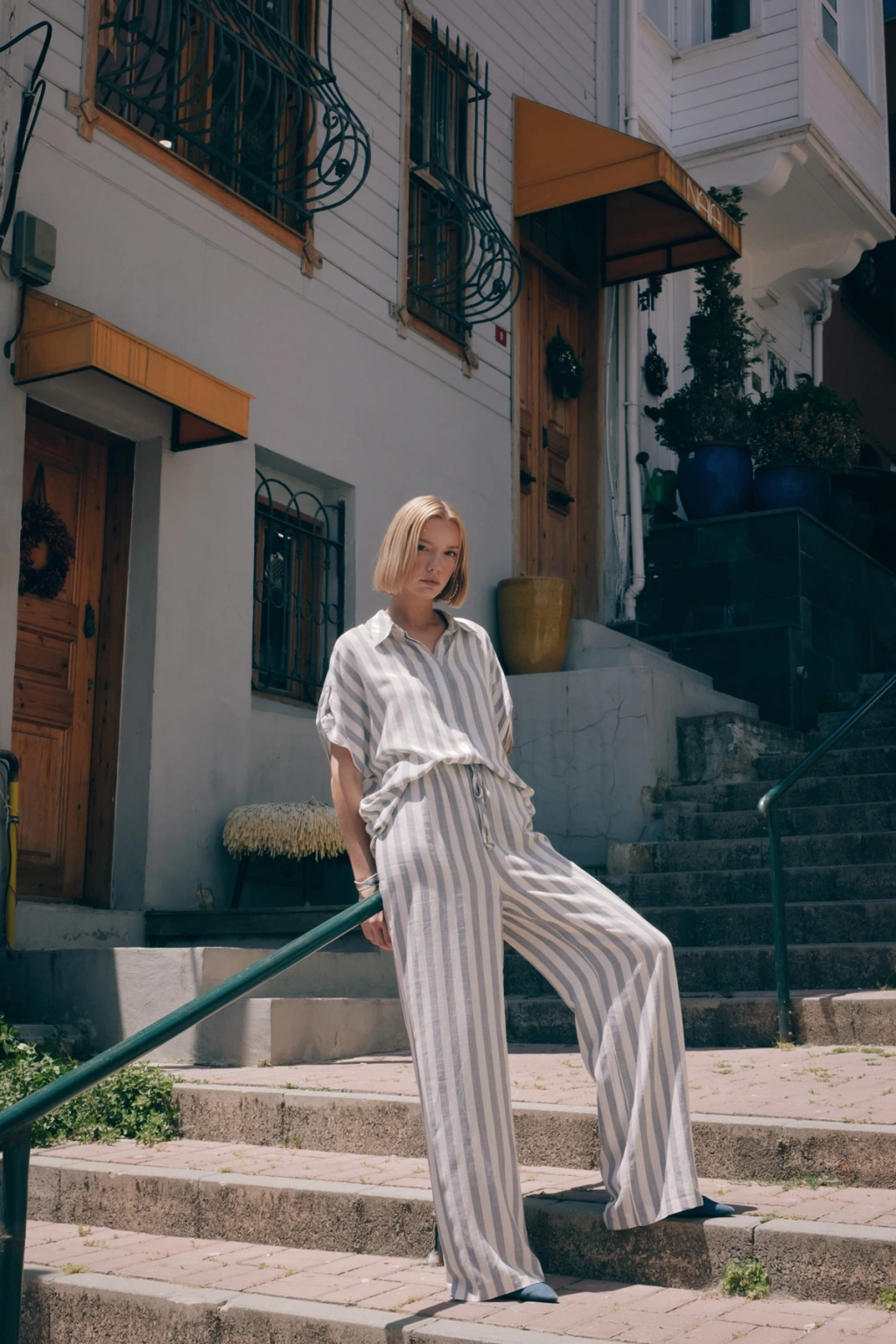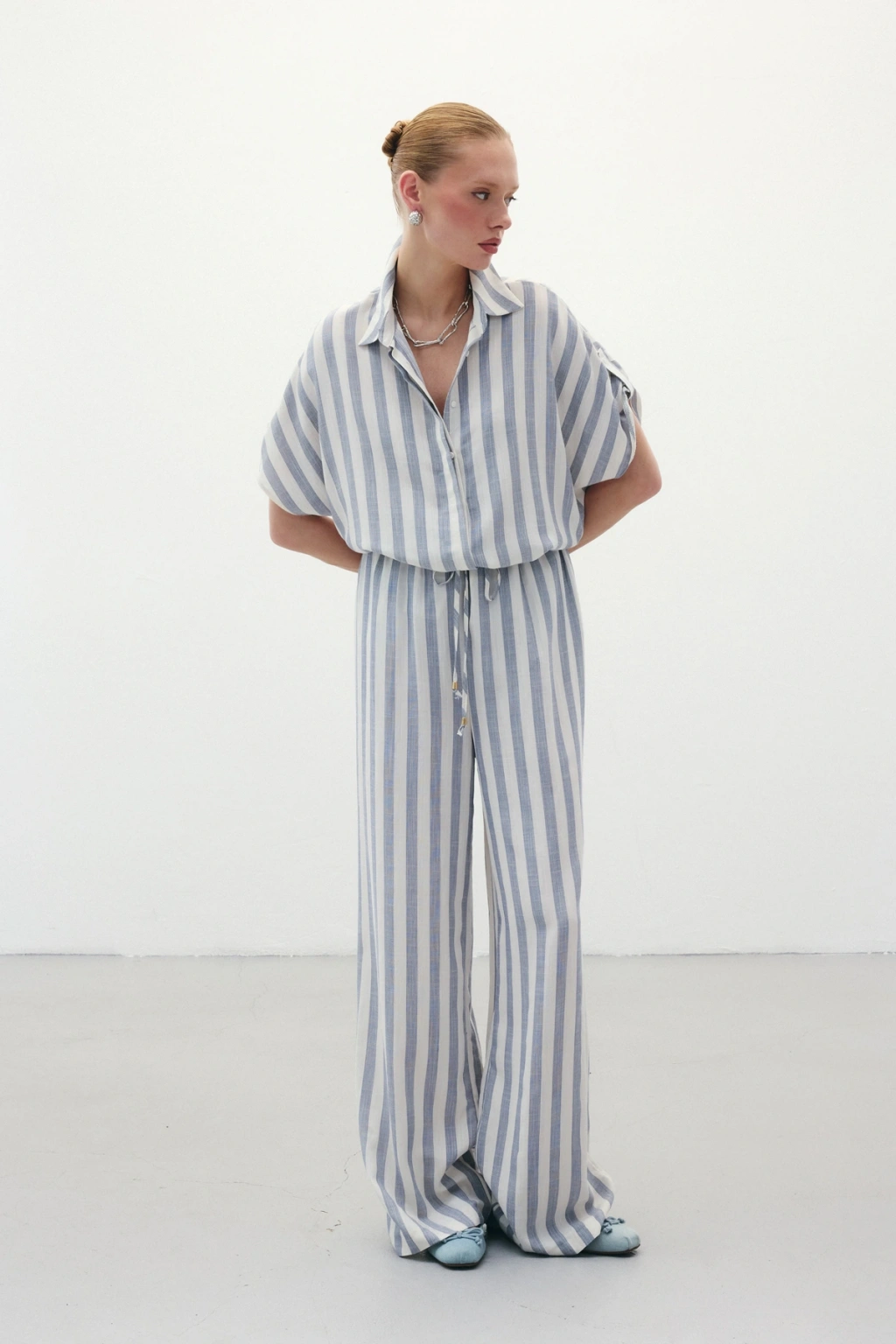 Çizgili Keten Karışımlı Pantolon - Lacivert