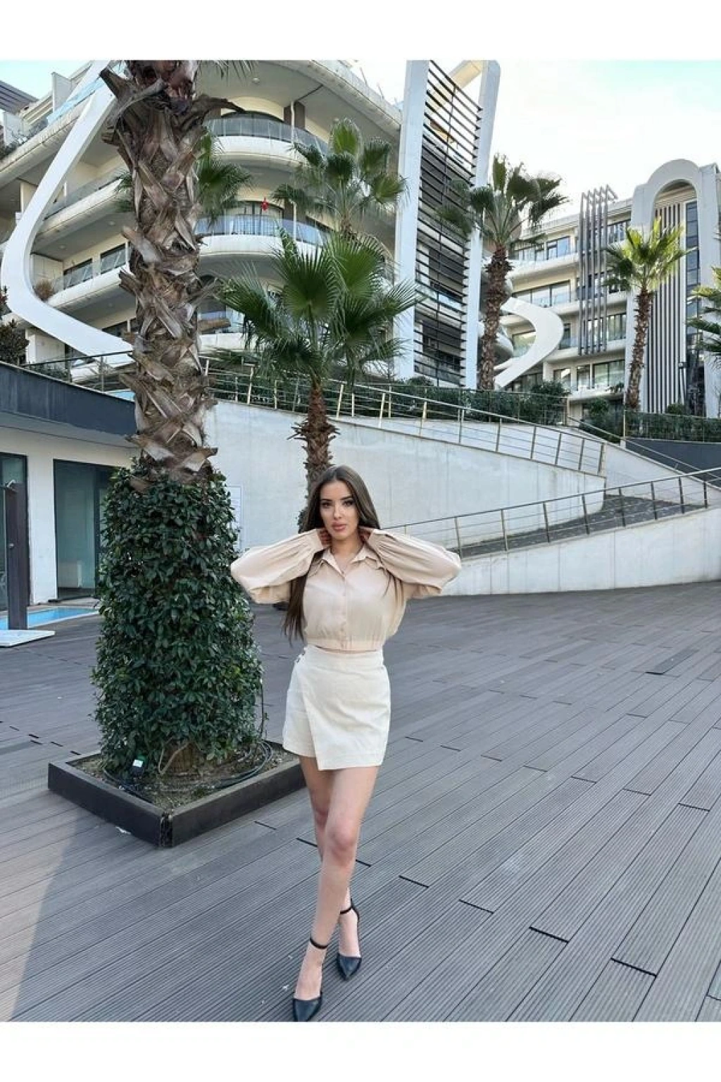 Dik Yaka Şifon Kol Detaylı Bluz - Bej
