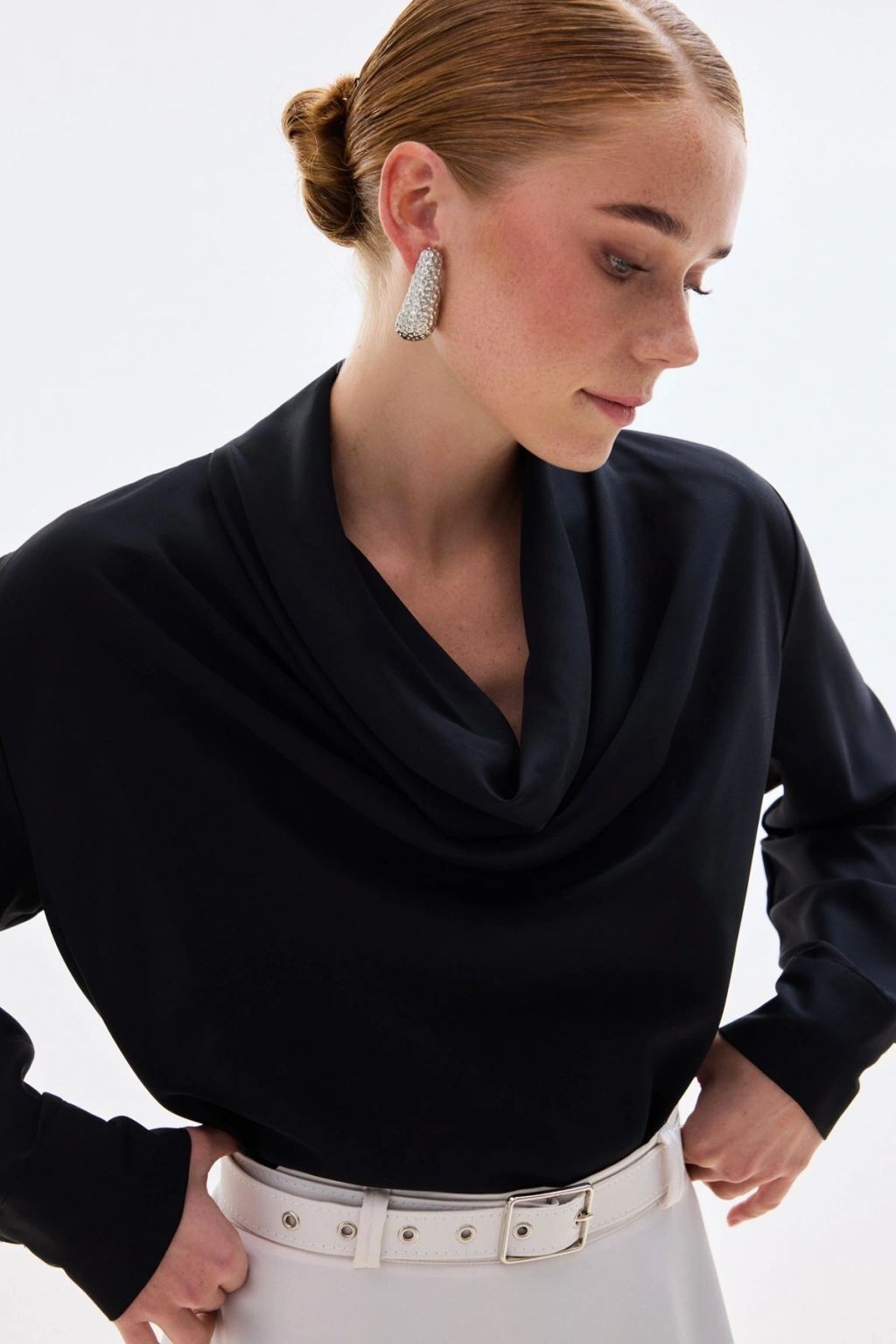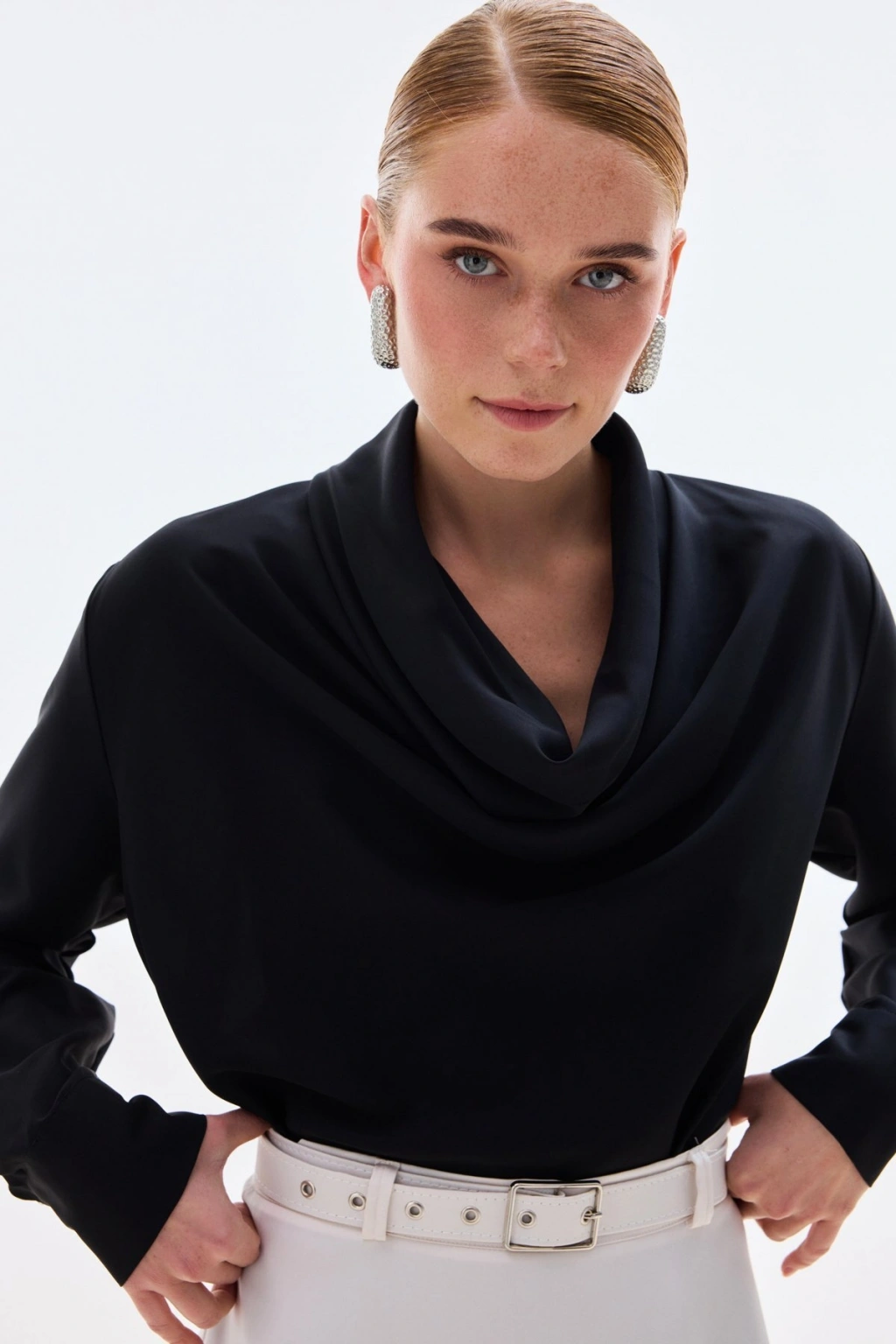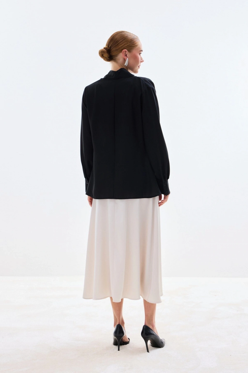 Anvelop Yaka Bağcıklı Tül Bluz Siyah