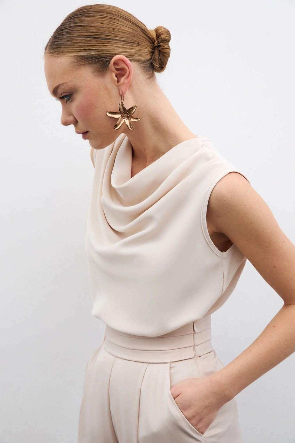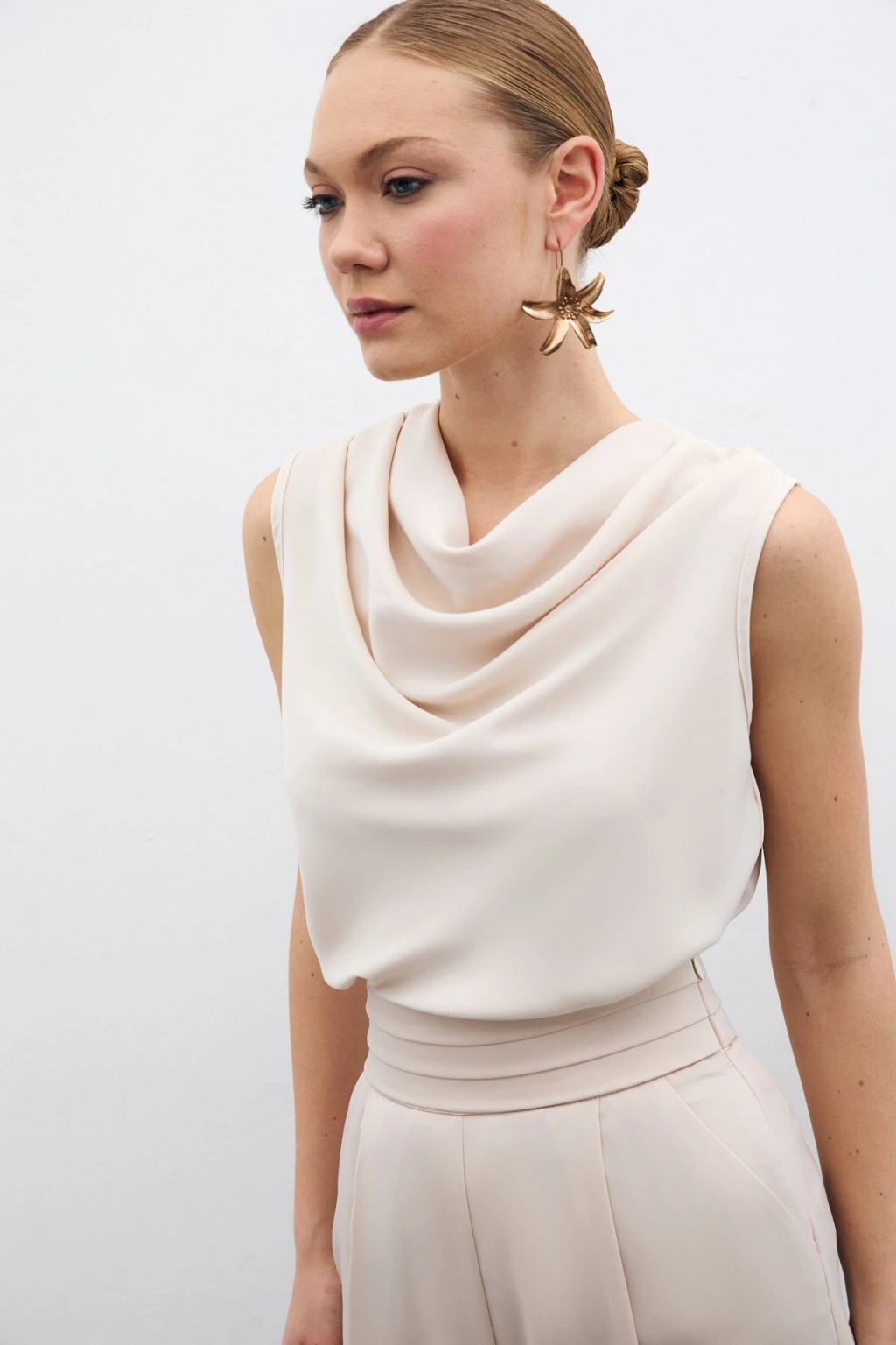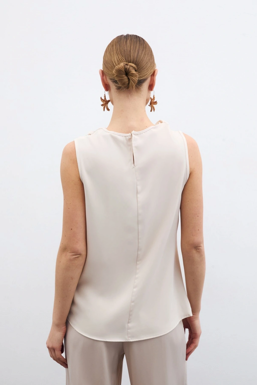 Dik Yaka Şifon Kol Detaylı Bluz - Bej