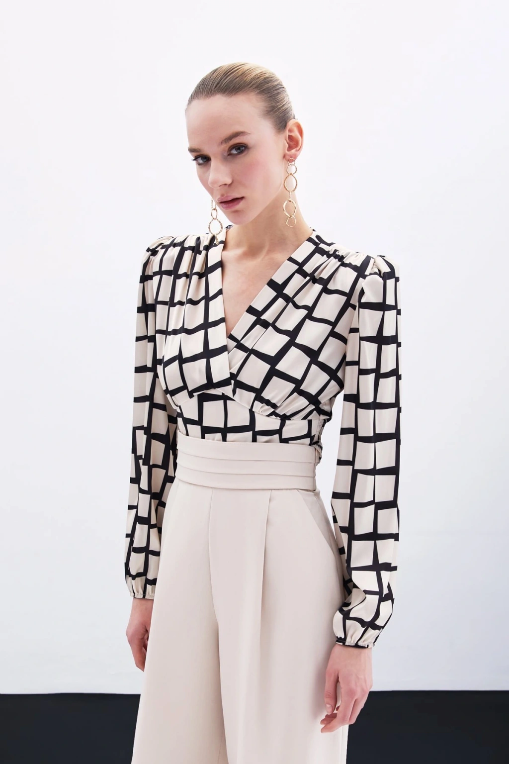 Dik Yaka Şifon Kol Detaylı Bluz - Bej