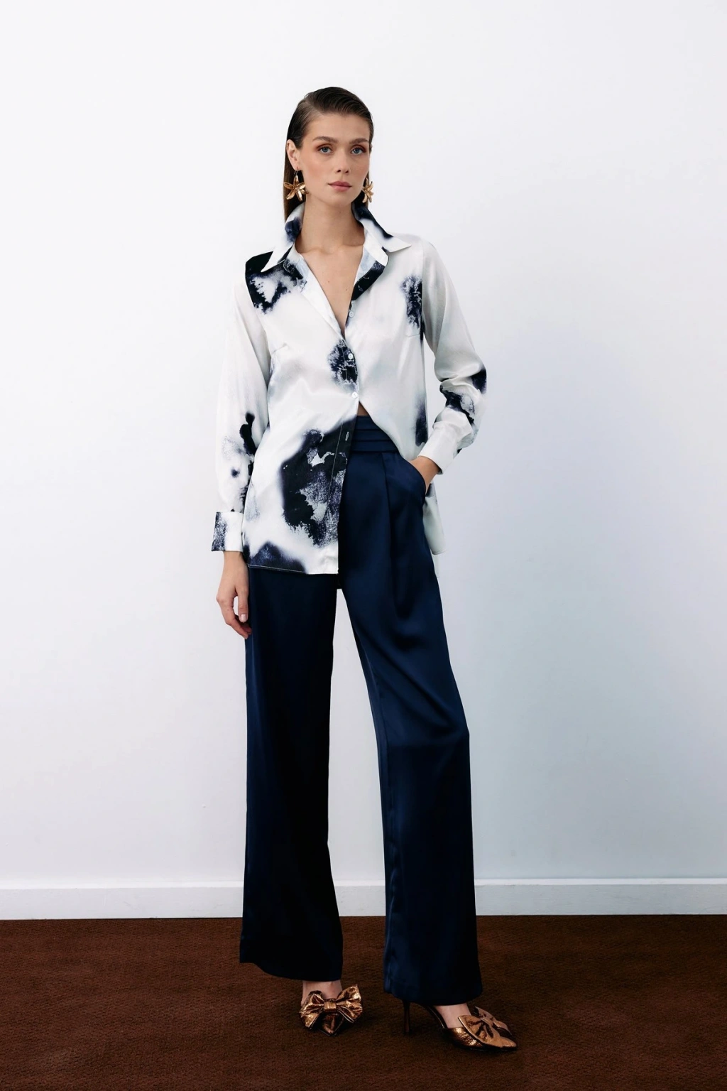 Desenli Fular Yaka Gömlek - Kahve