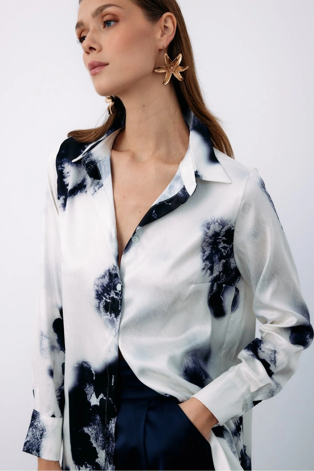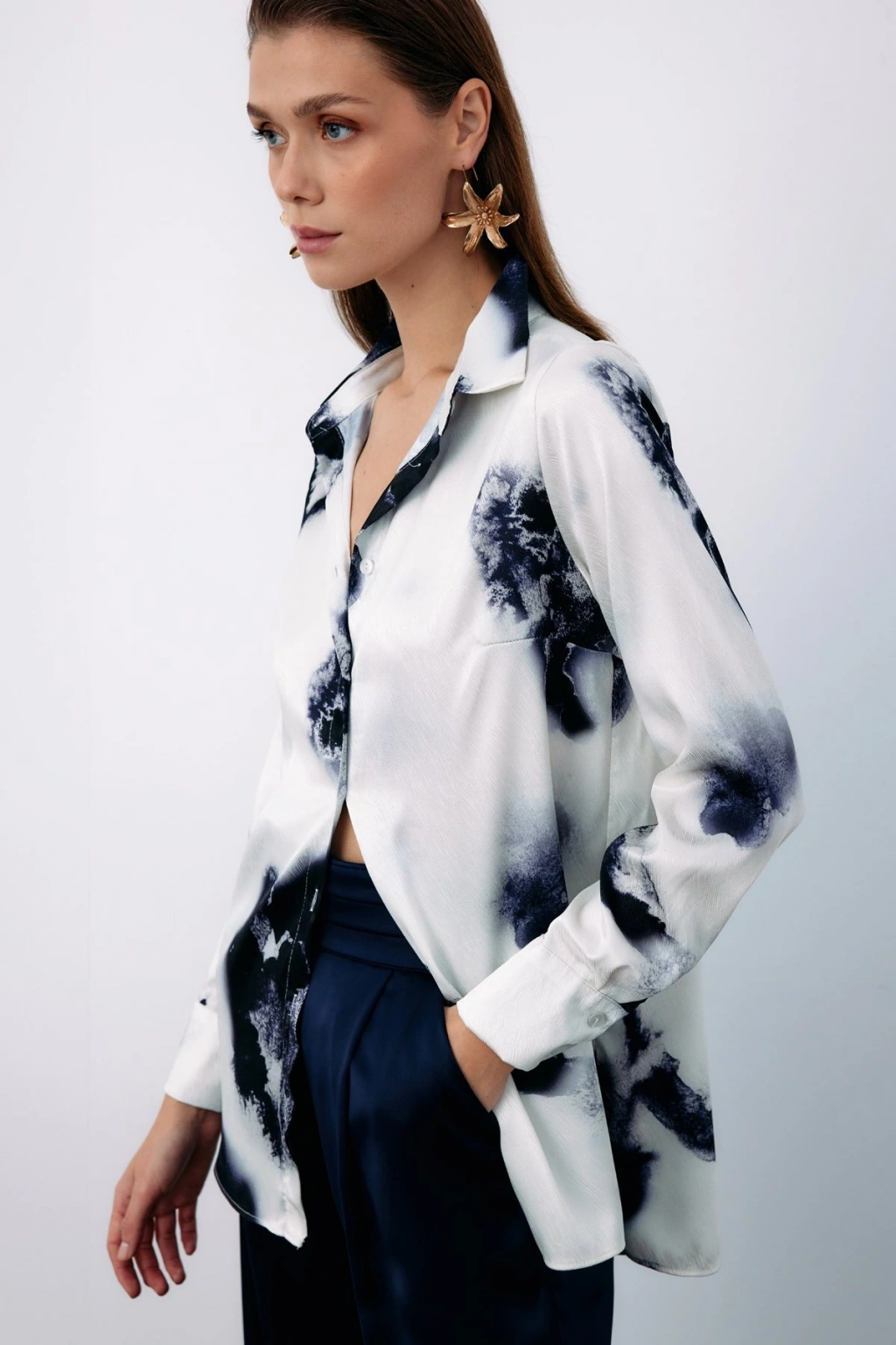 Çiçek Desenli Gömlek - SAX MAVİ