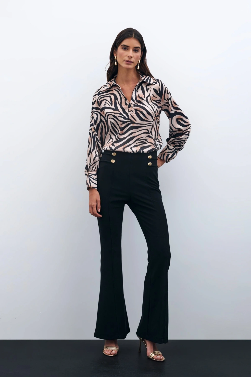 Dik Yaka Şifon Kol Detaylı Bluz - Bej