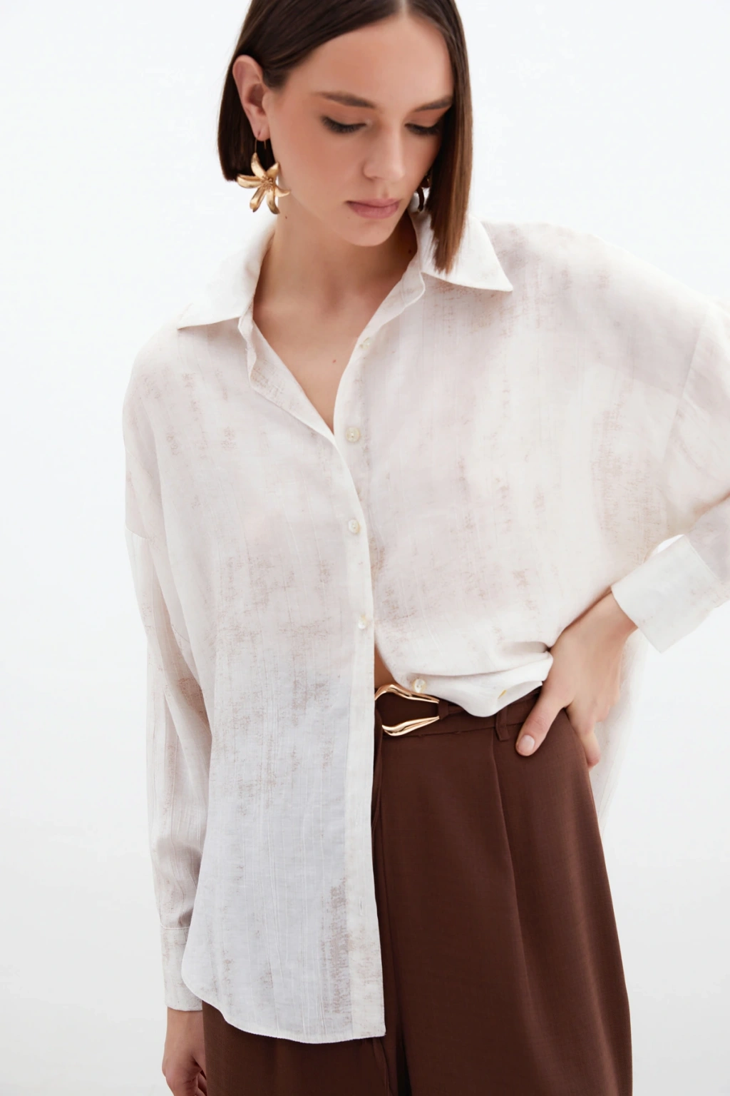 Aksesuarlı Klasik Gömlek - Ekru