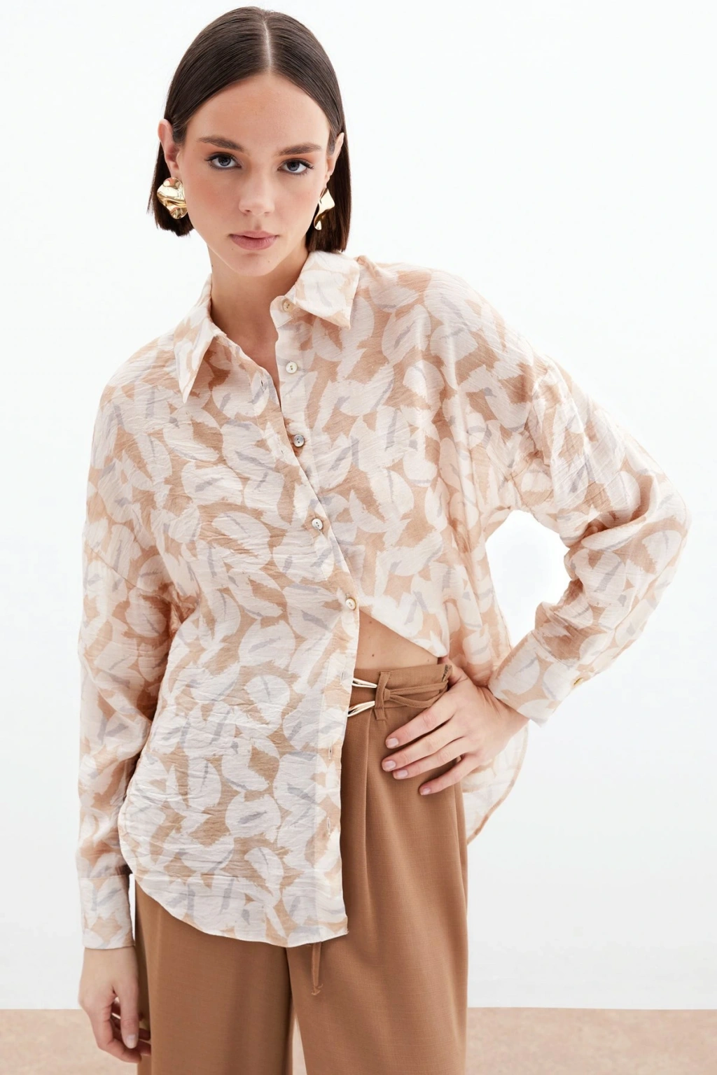Leopar Desenli Klasik Gömlek - Taba
