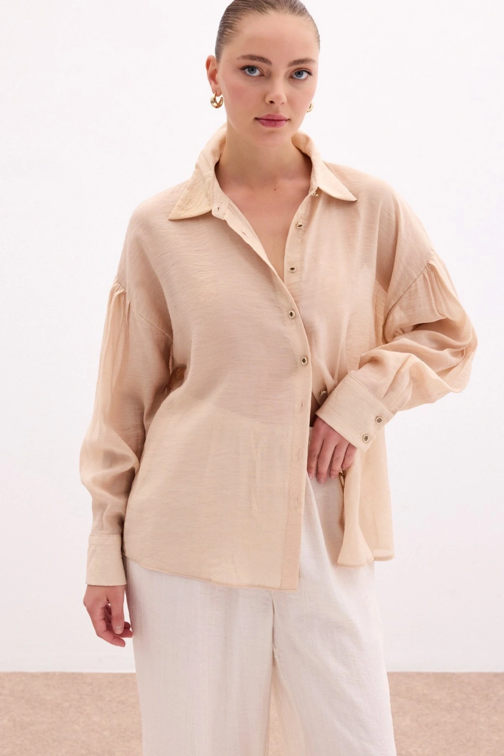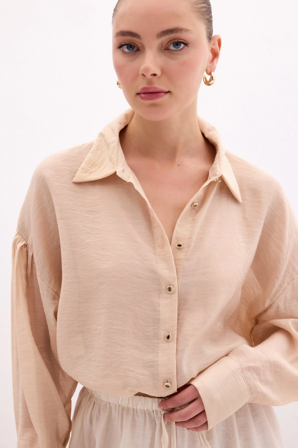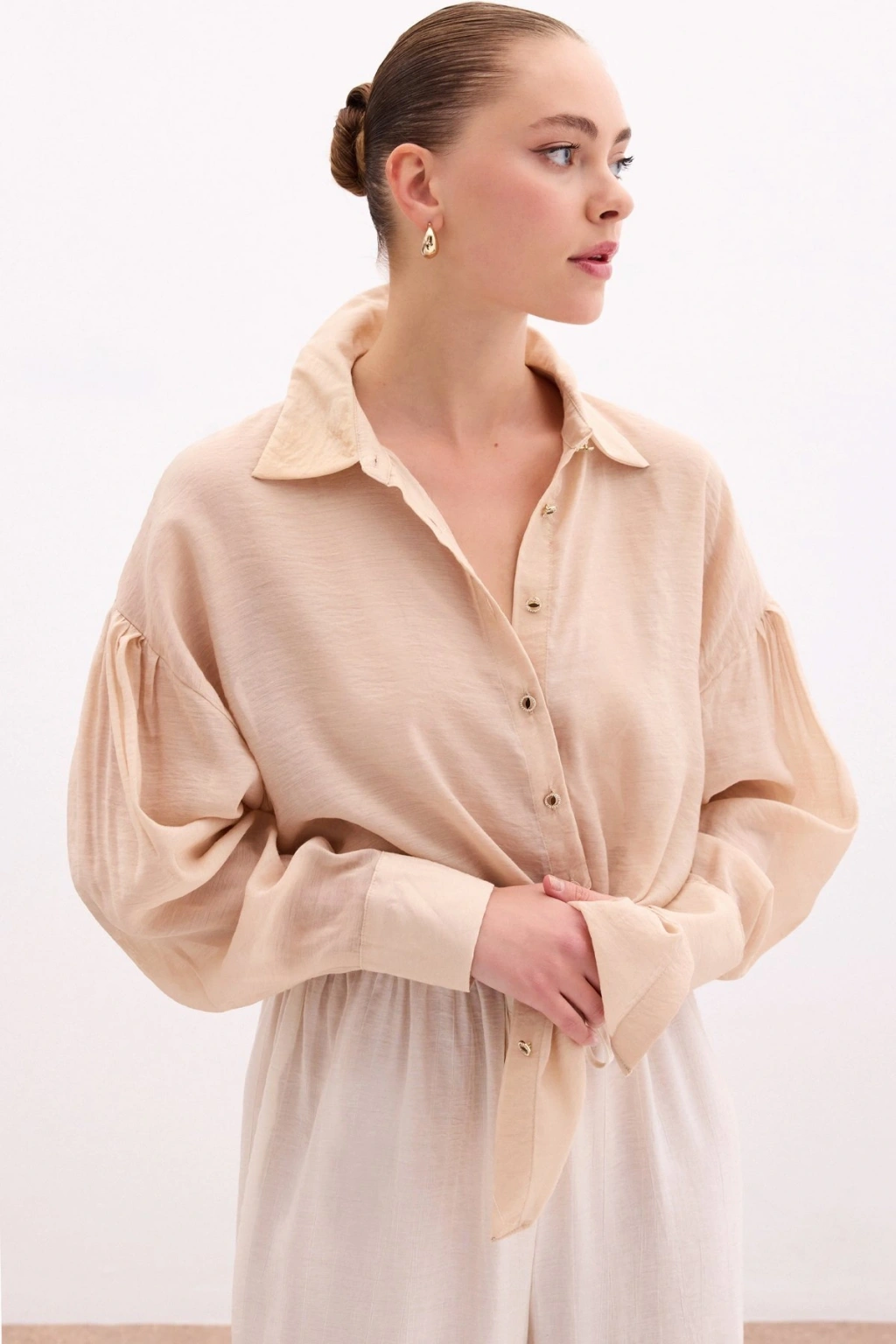 Düğme Aksesuarlı İnce Gömlek - Bej