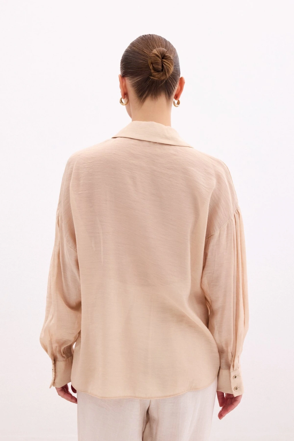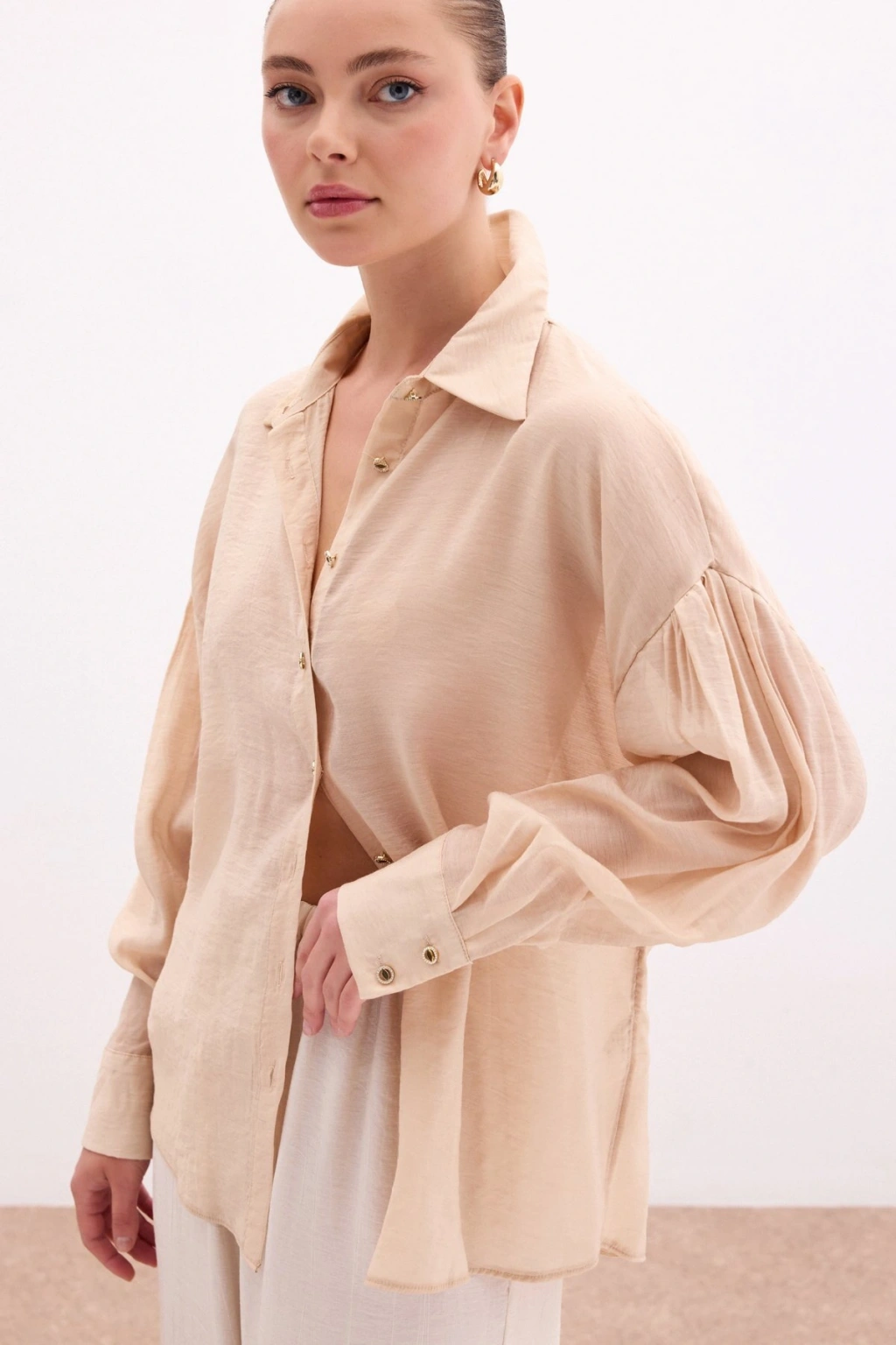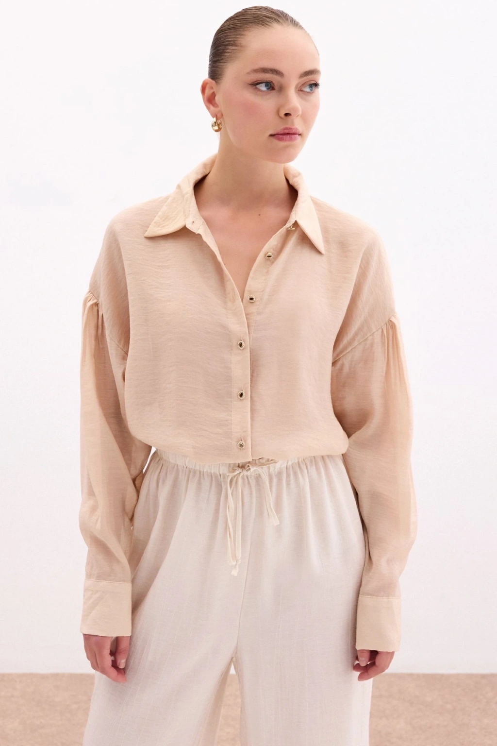 Düğme Aksesuarlı İnce Gömlek - Bej