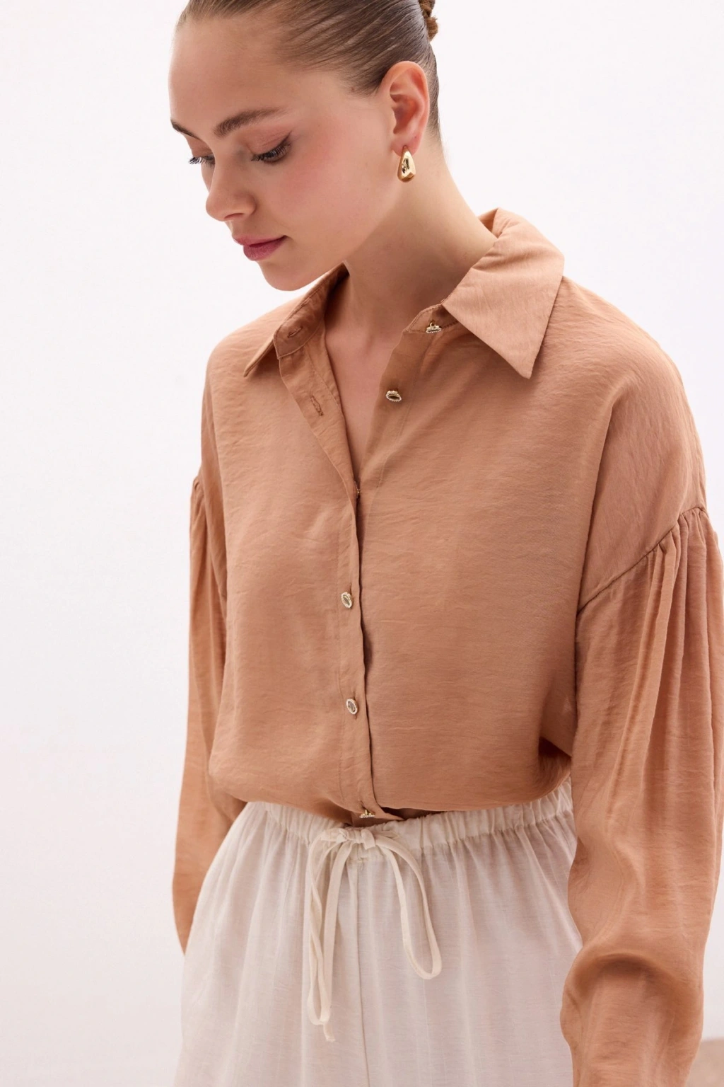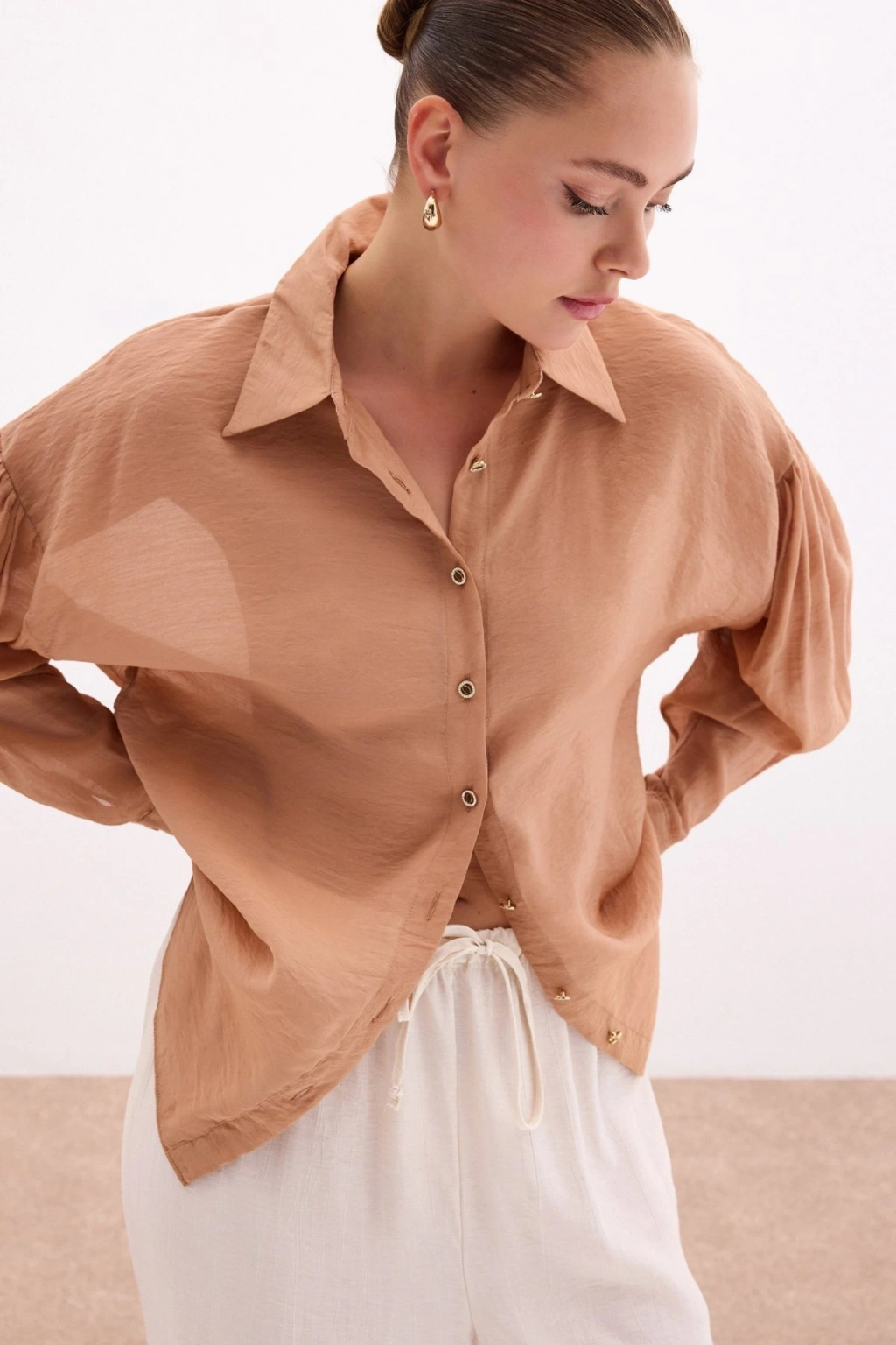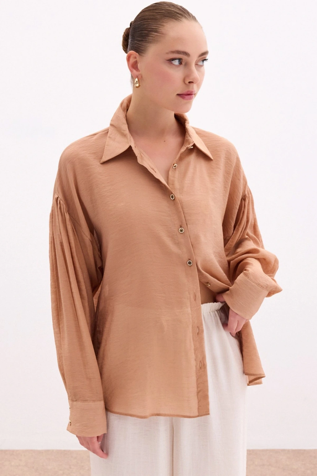 Düğme Aksesuarlı İnce Gömlek - Camel