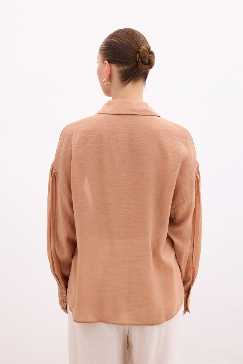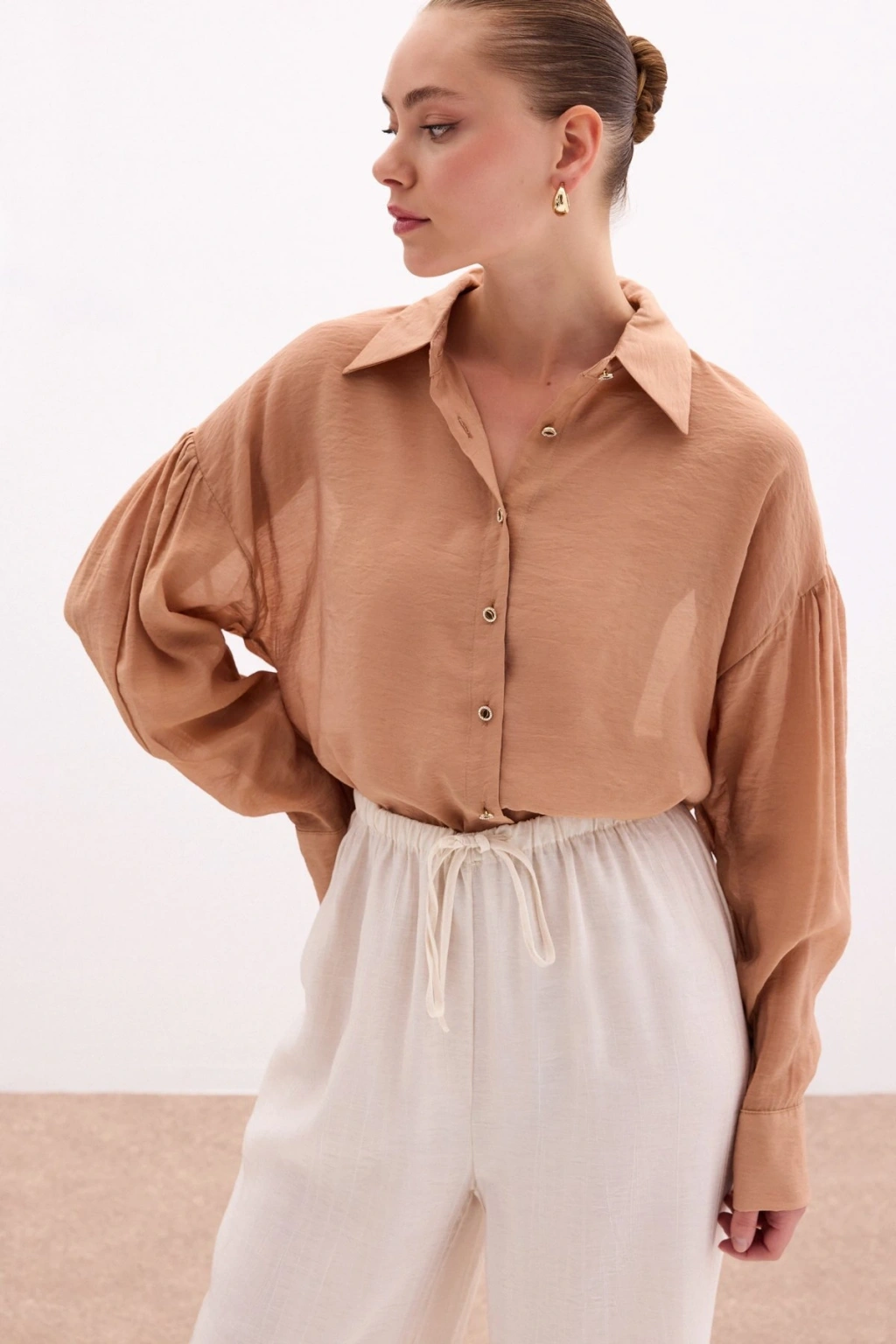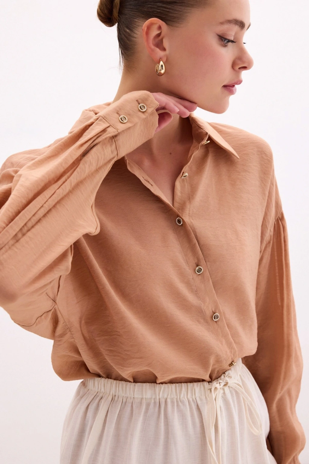 Düğme Aksesuarlı İnce Gömlek - Camel