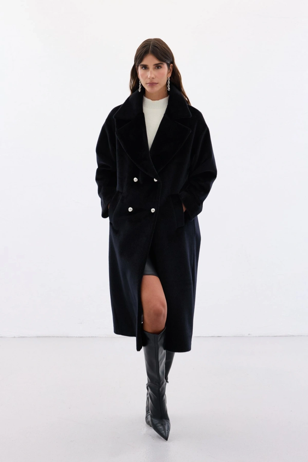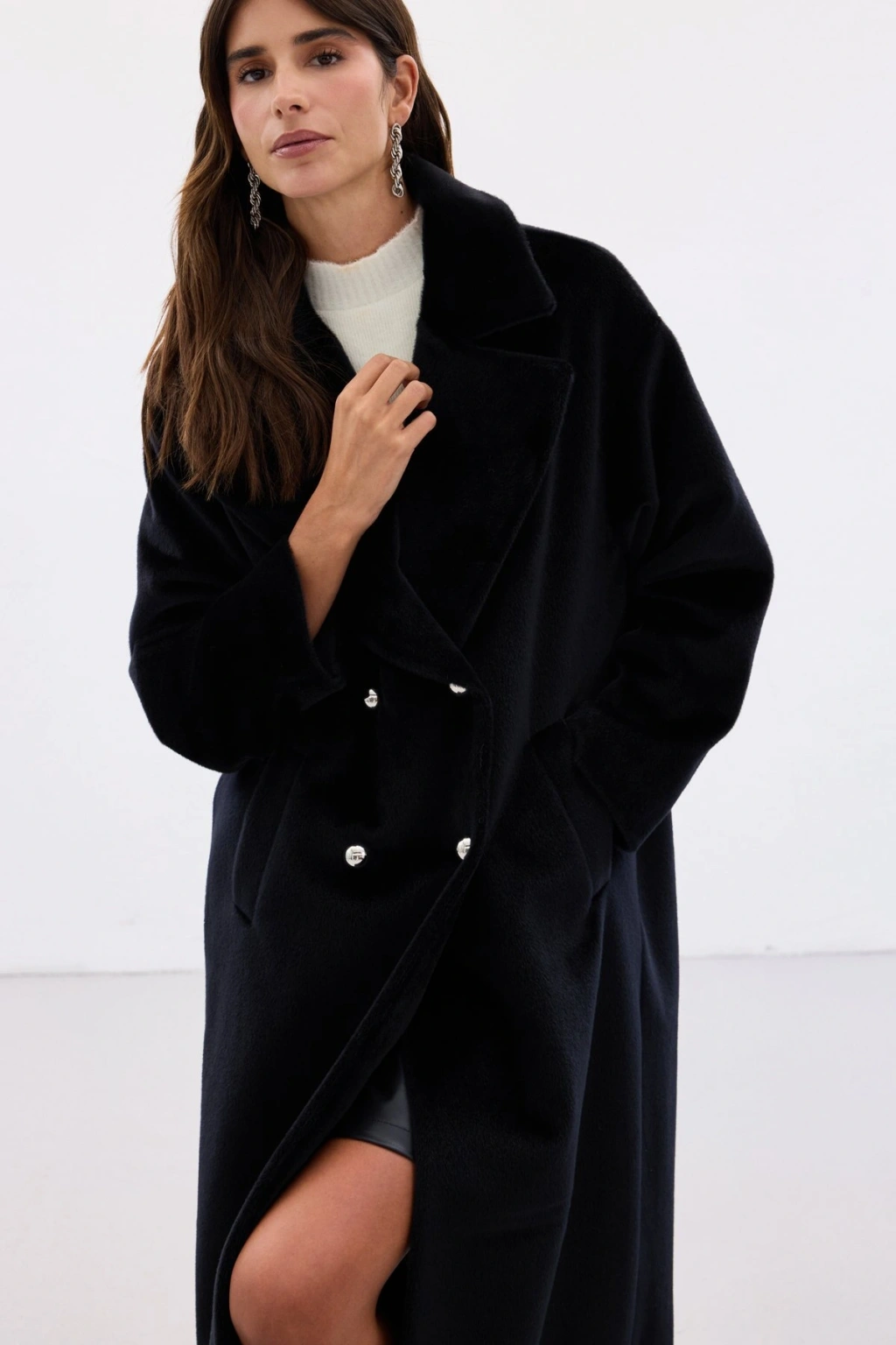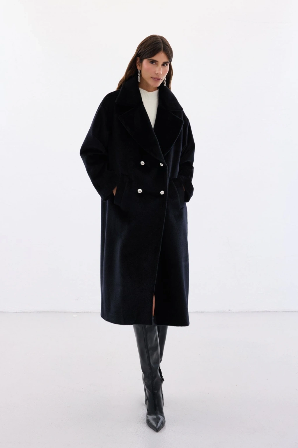 Düğme Detaylı Uzun Kaban - Siyah