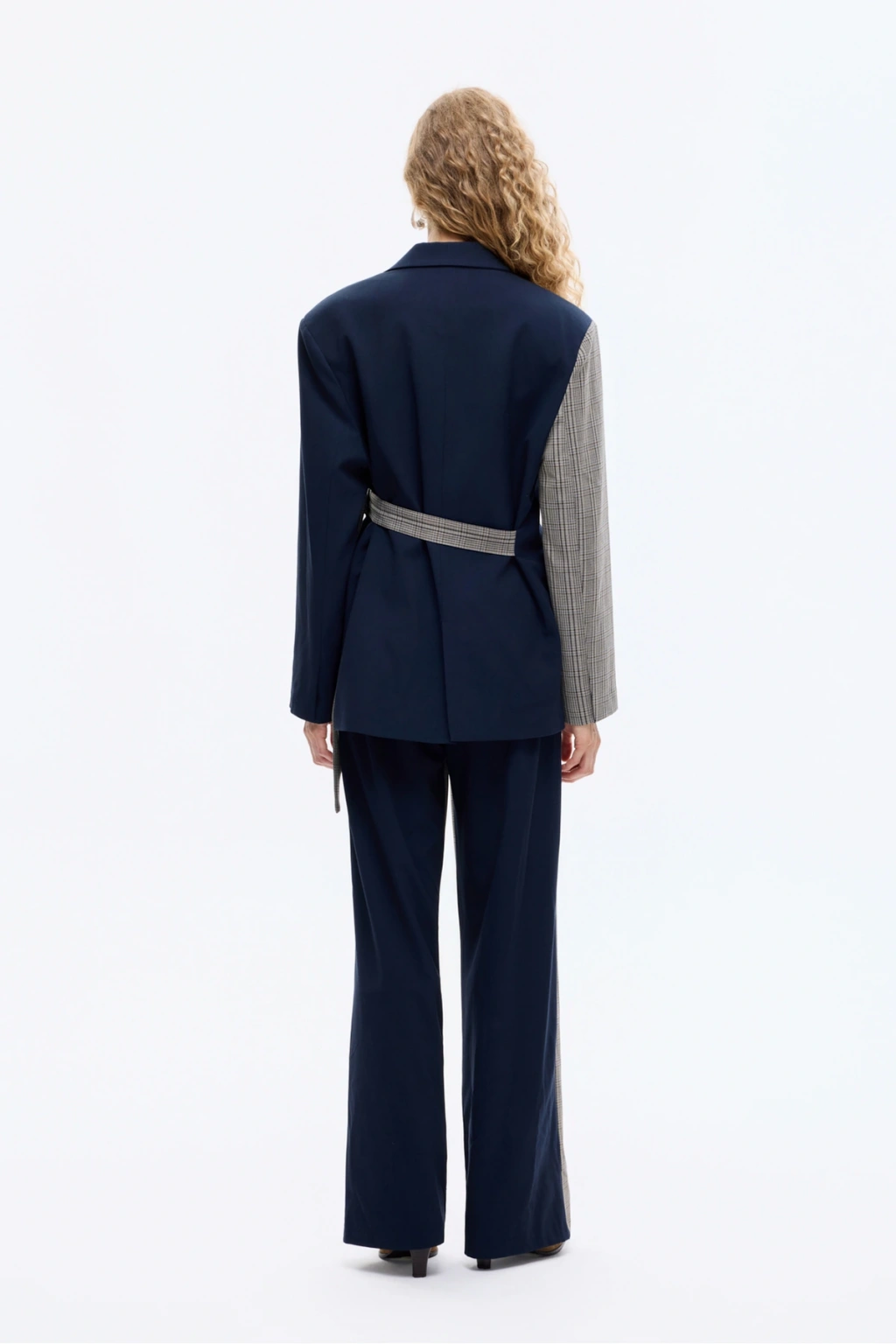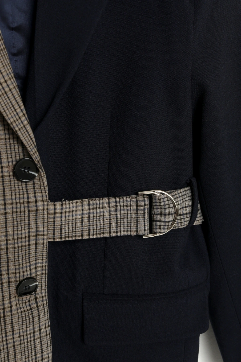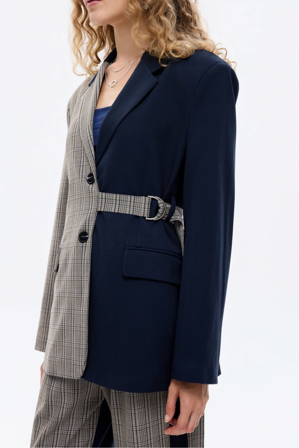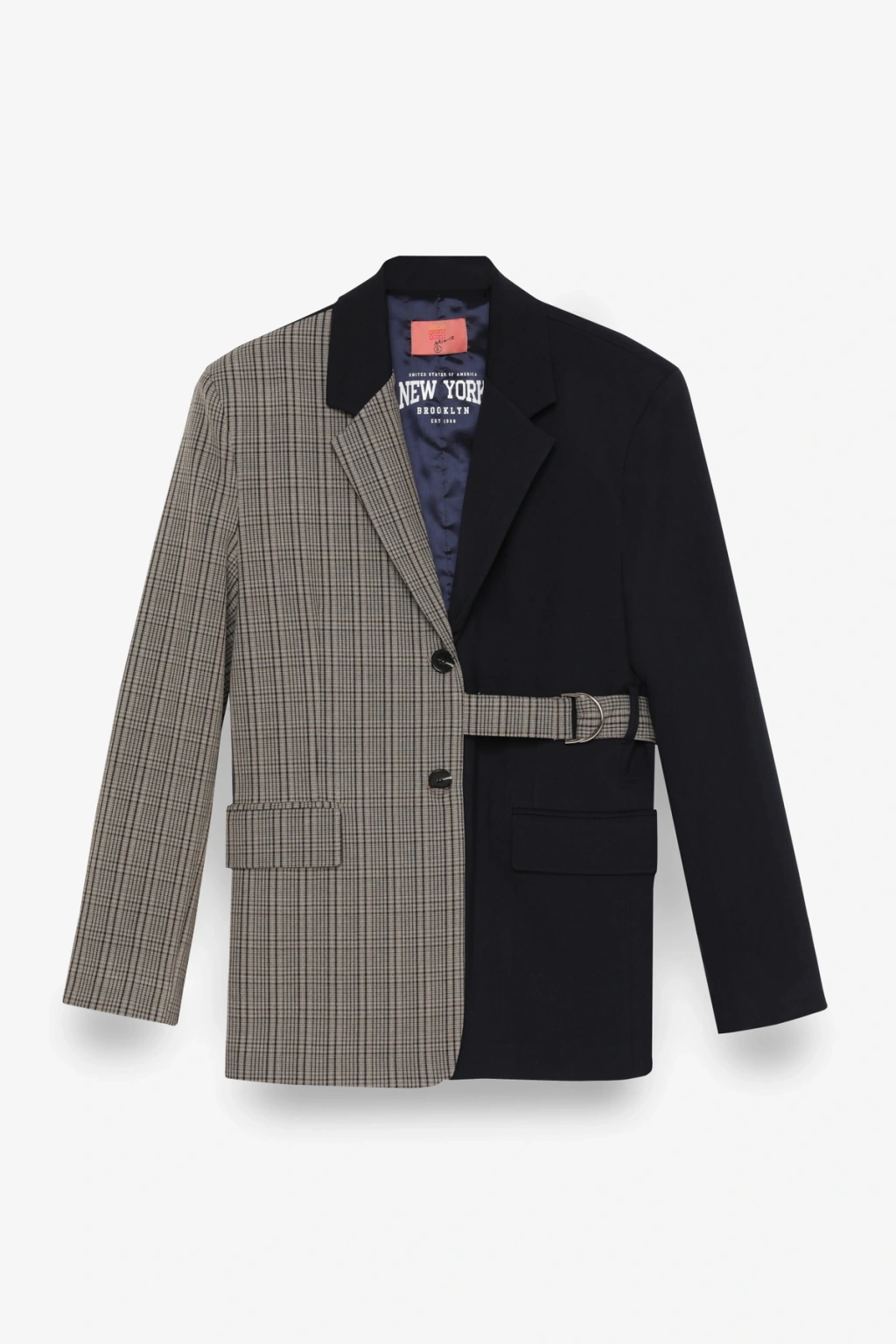 İçİ astarlı yazı detaylı, yarısı düz, yarısı ekose desenlİ kumaştan tasarlanmış, kuşak kemer detaylı, çİft cep kapaklı, düğme kapamalı, uzun kollu, oversİze blazer ceket.