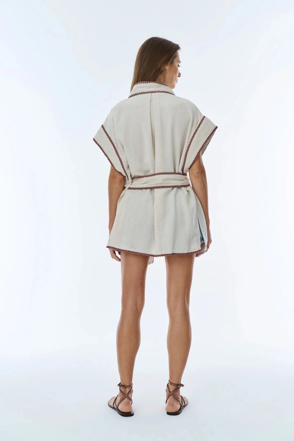 İşleme Detaylı Bağlamalı Keten Kimono Naturel