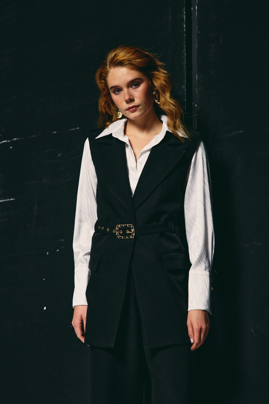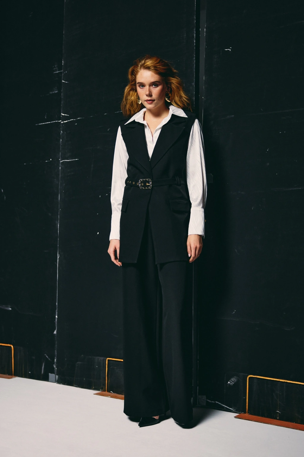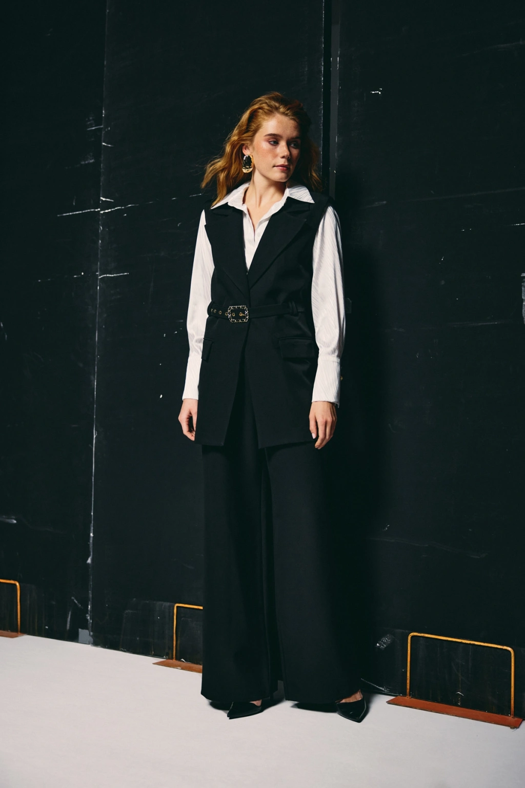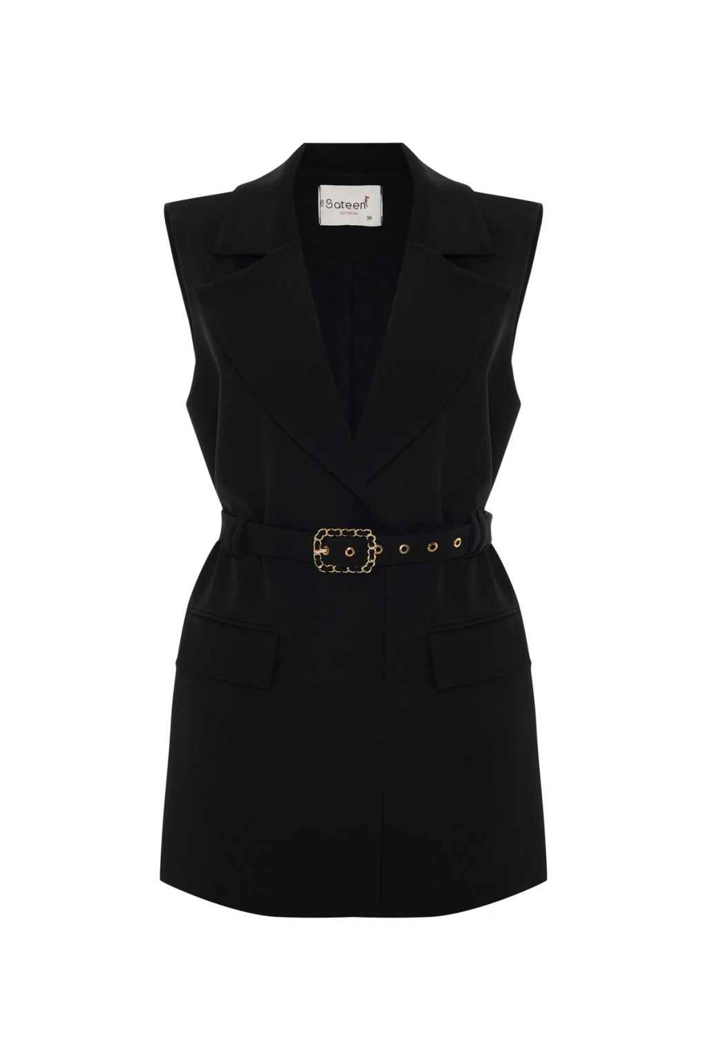 Omuz Aksesuarlı Kuşaklı Yelek - Siyah