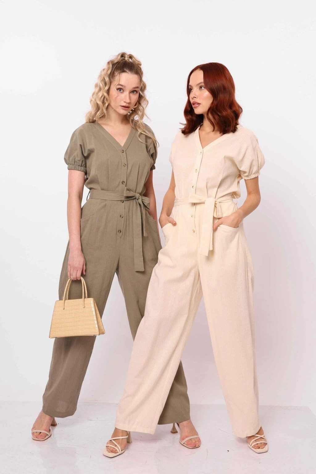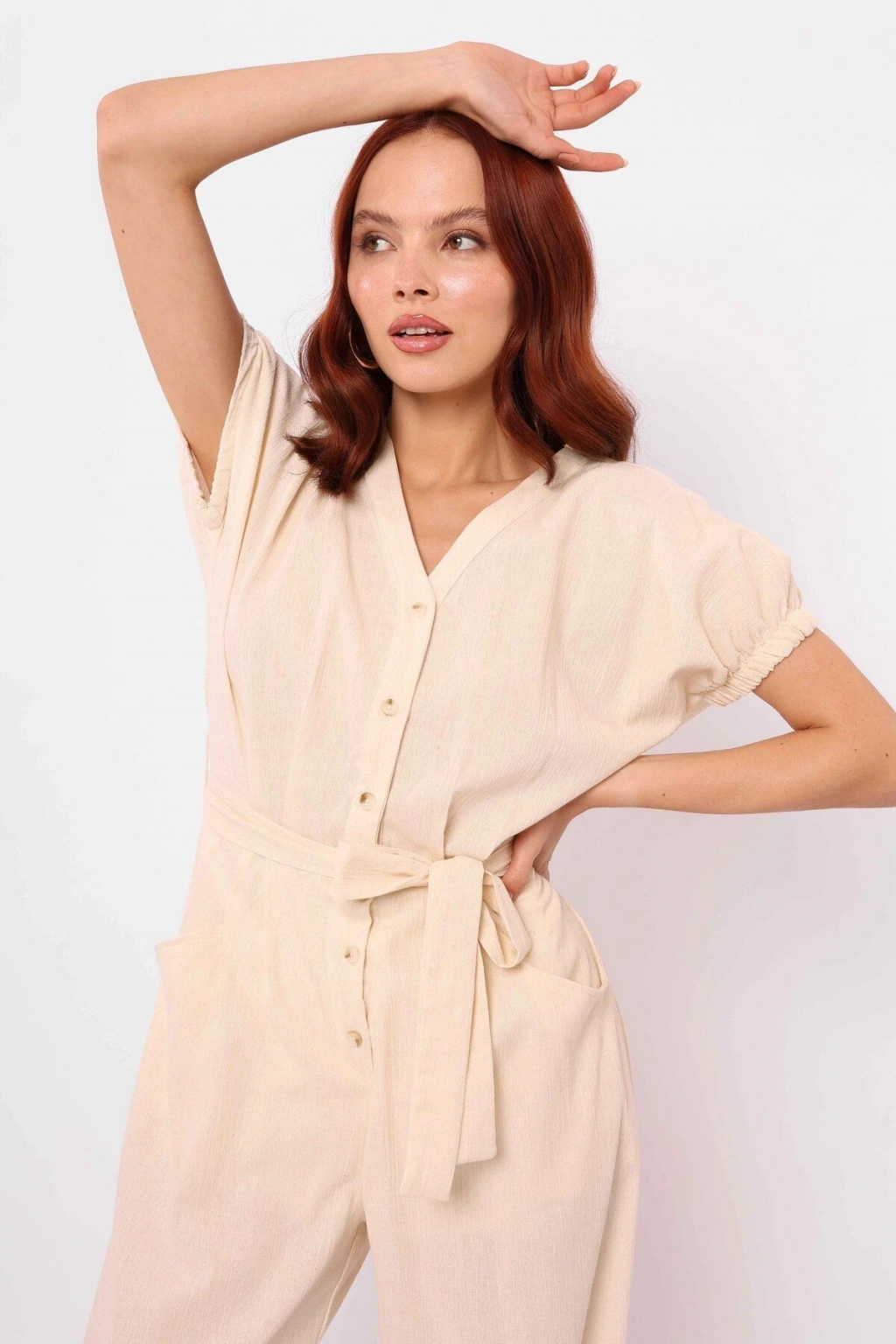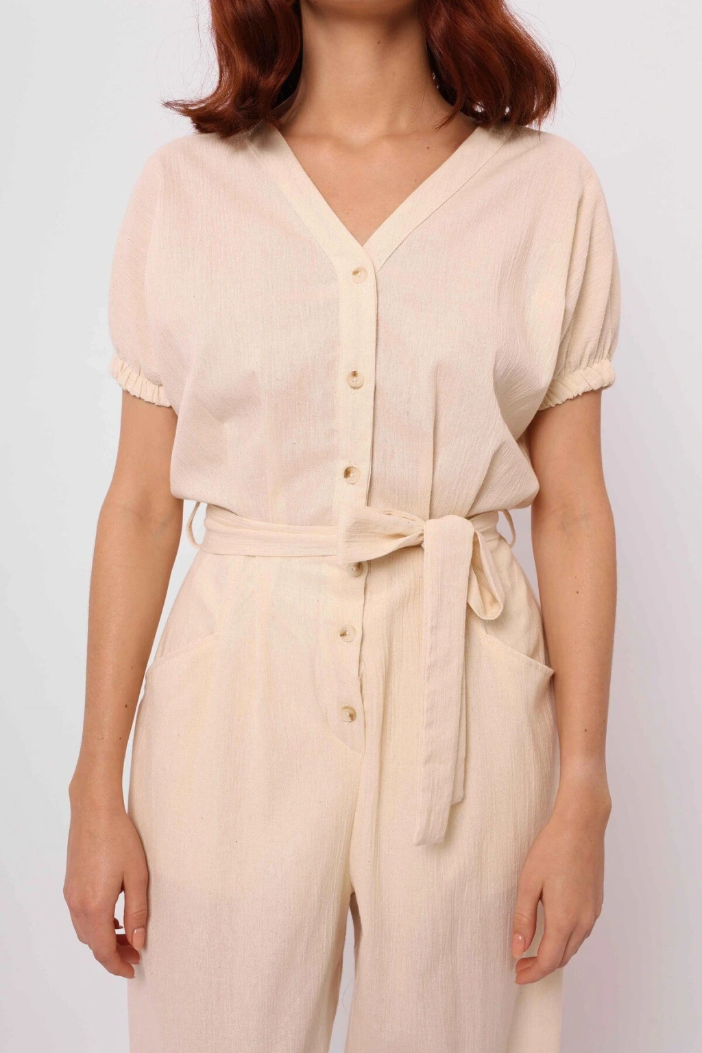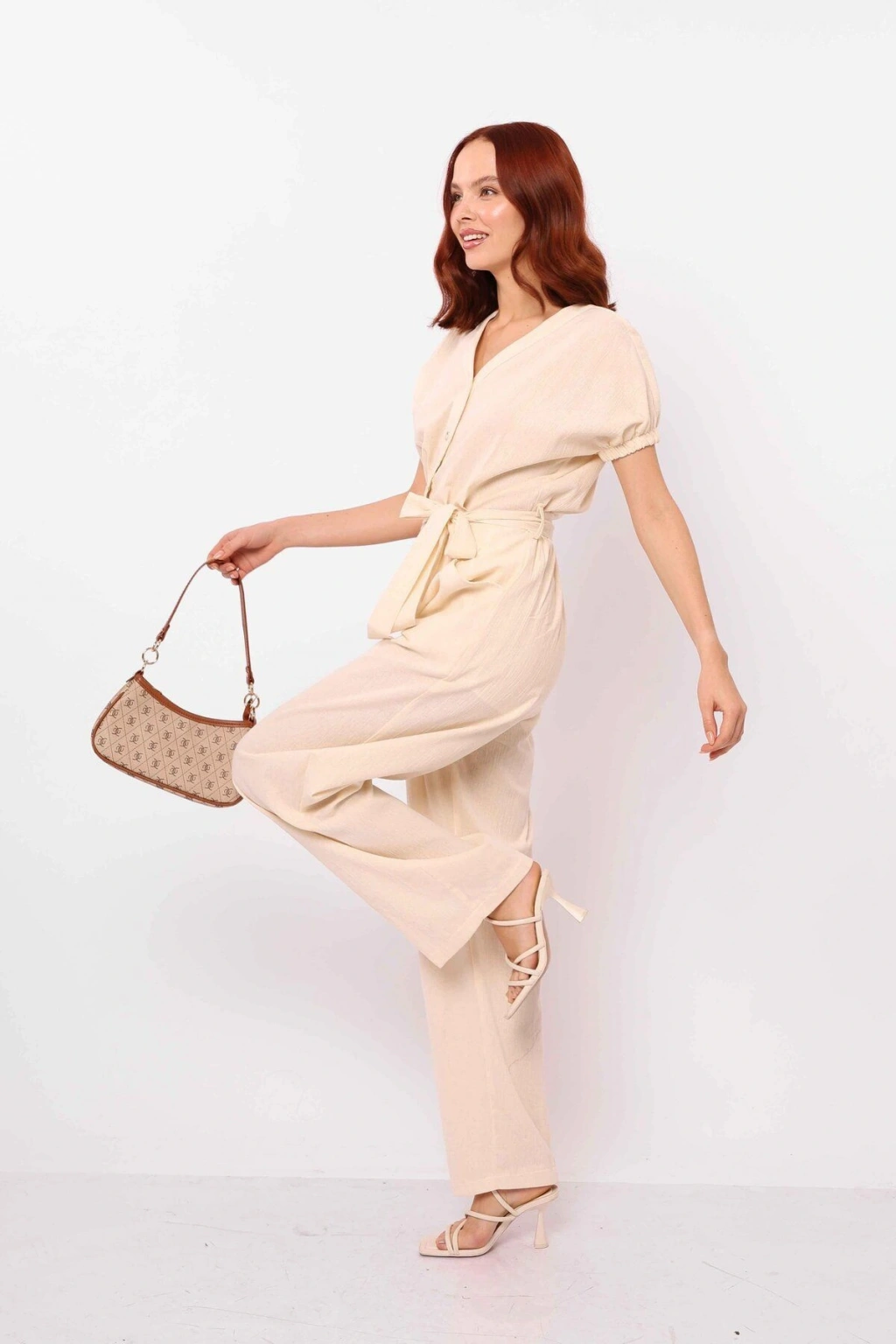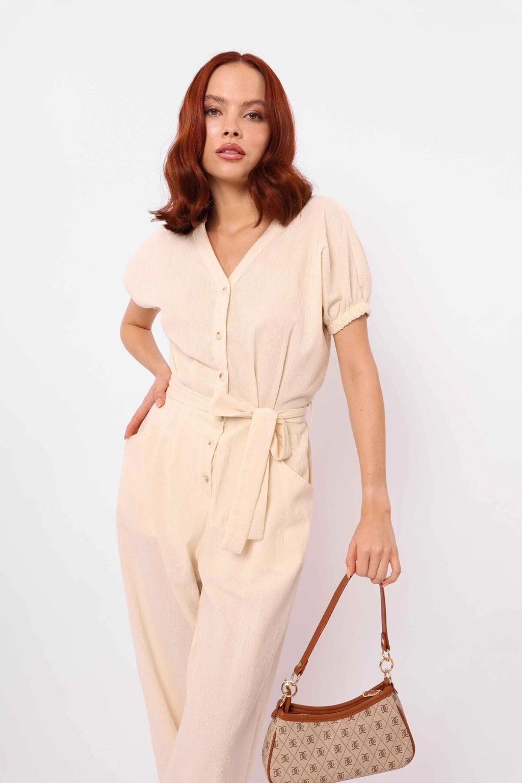Kemer Aksesuarlı V Yaka Tulum Naturel