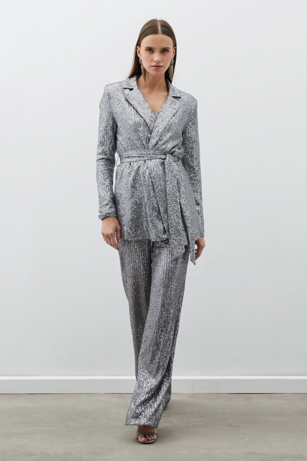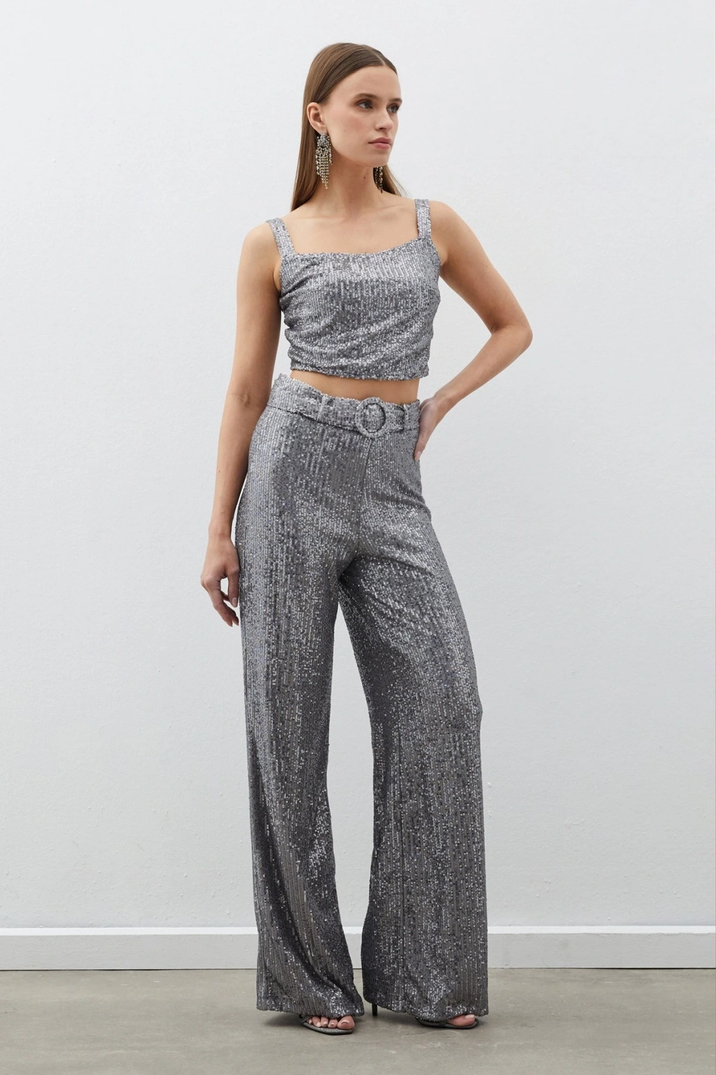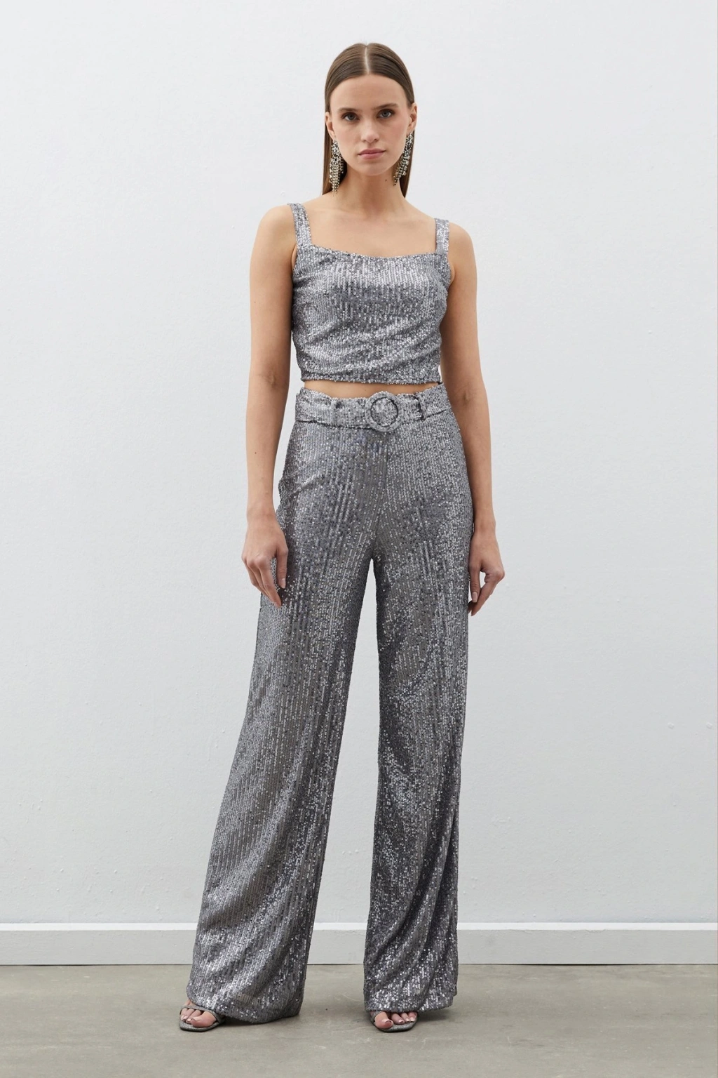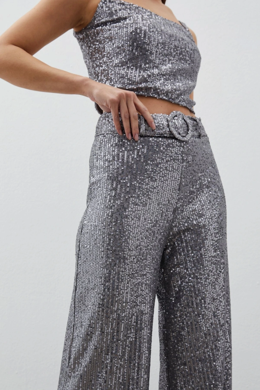 Kemerli Payet Pantolon - Gümüş