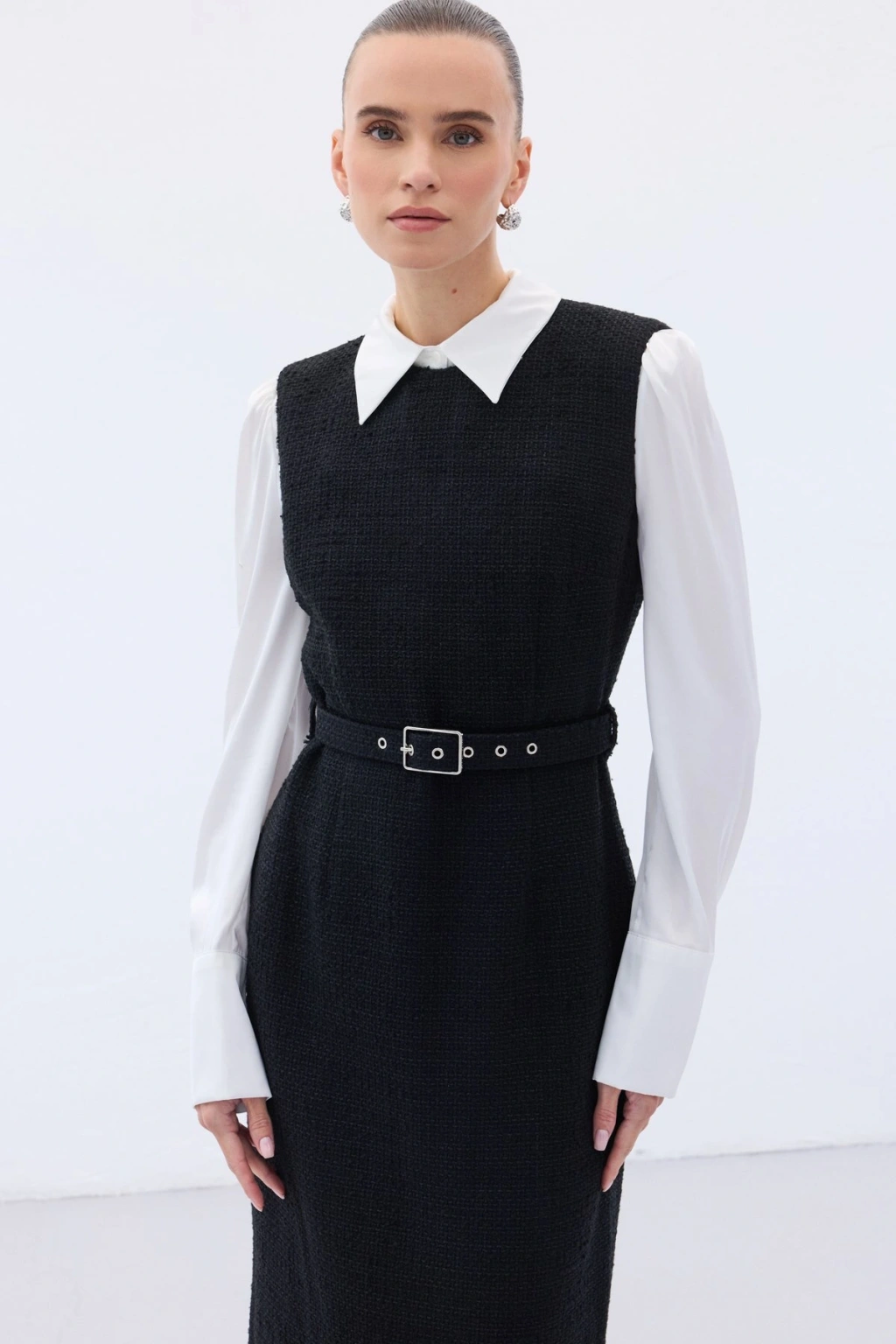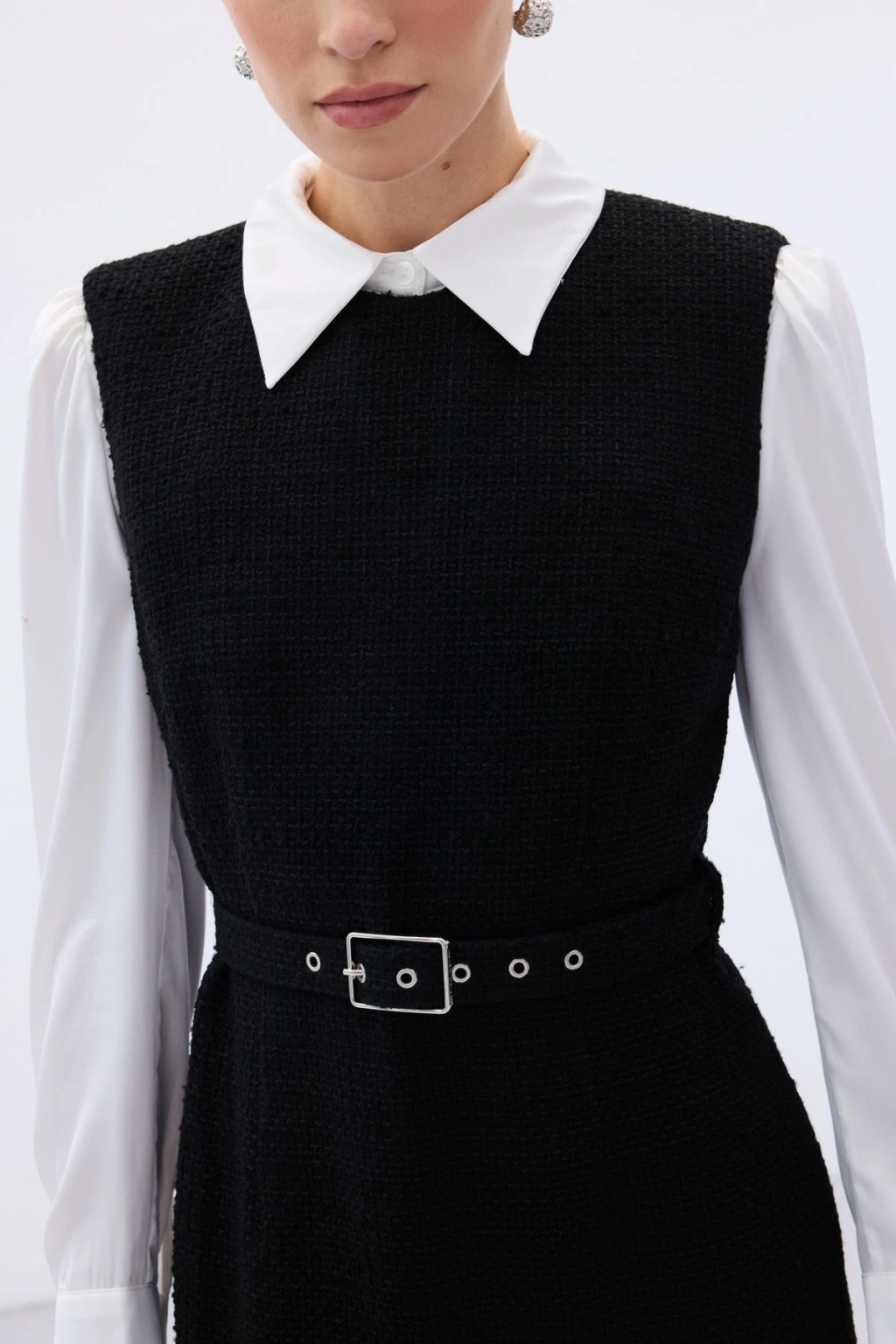 Kombine Kemerli Pileli Mini Elbise Ekru