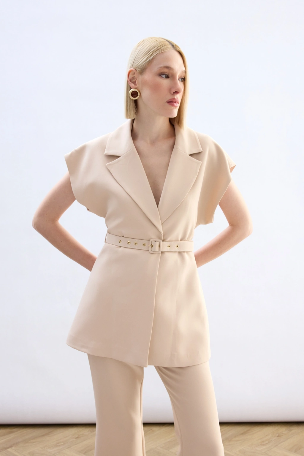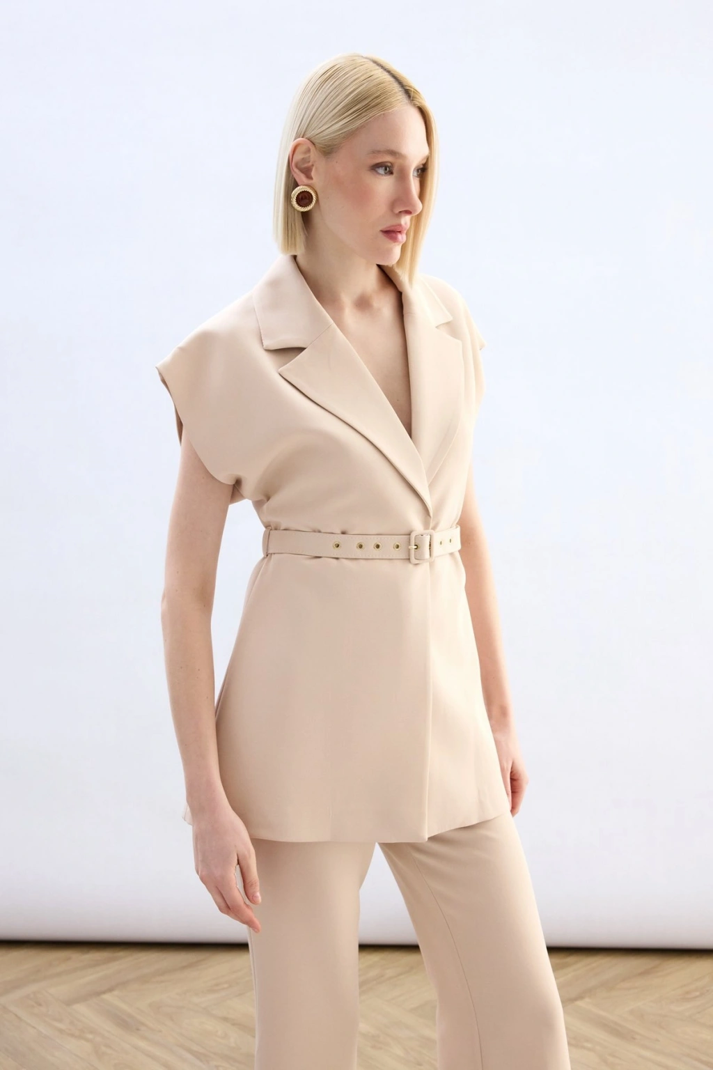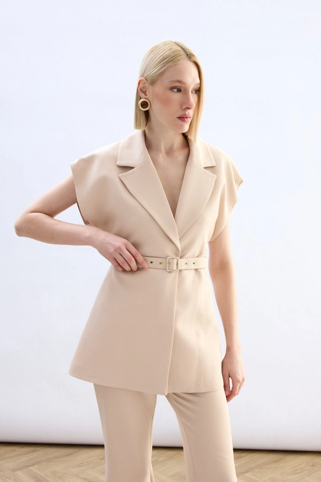 Omuz Aksesuarlı Kuşaklı Yelek - Ekru