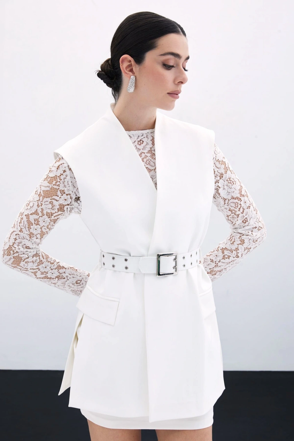 Kemerli Uzun Yelek - Ekru