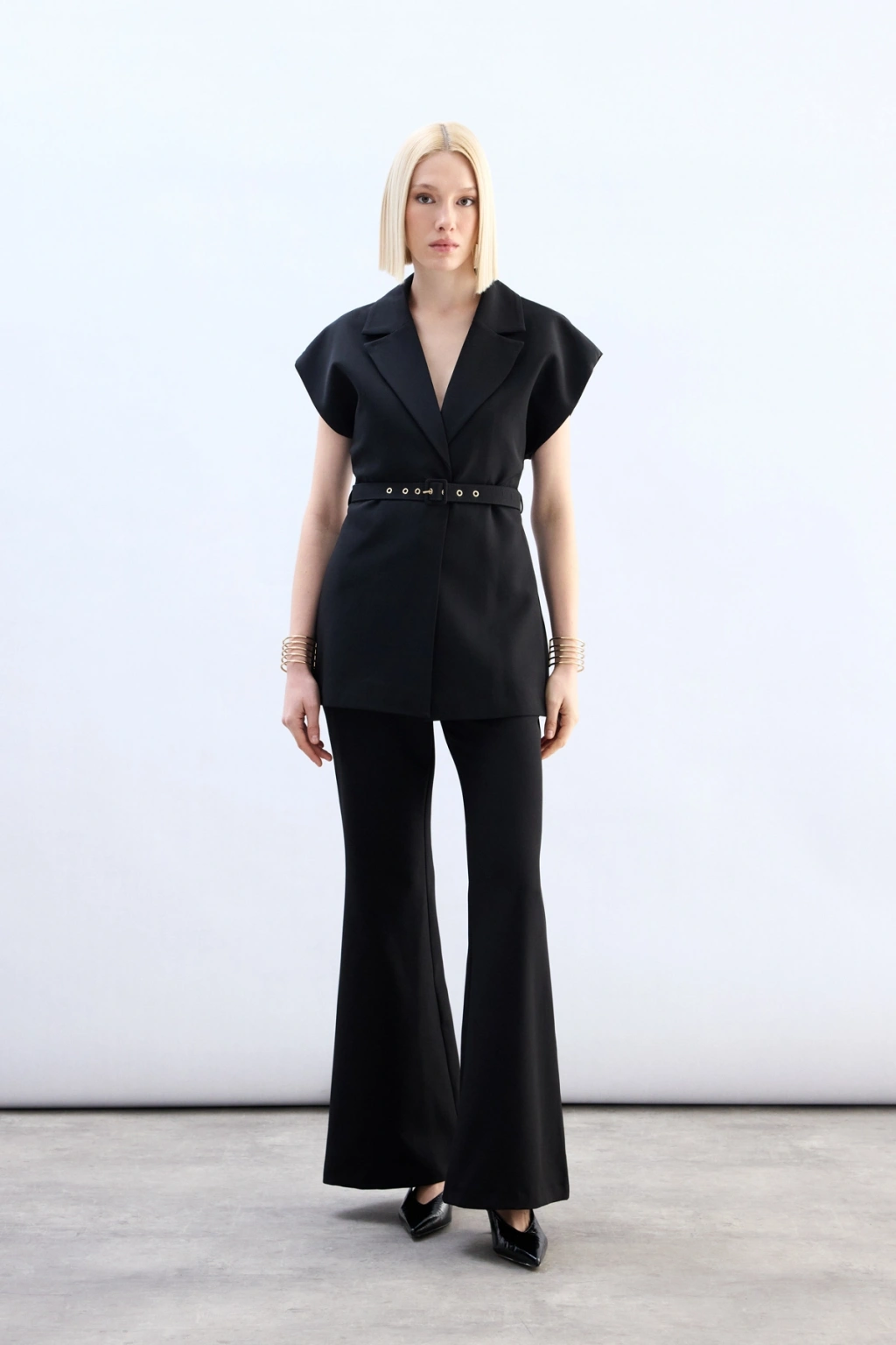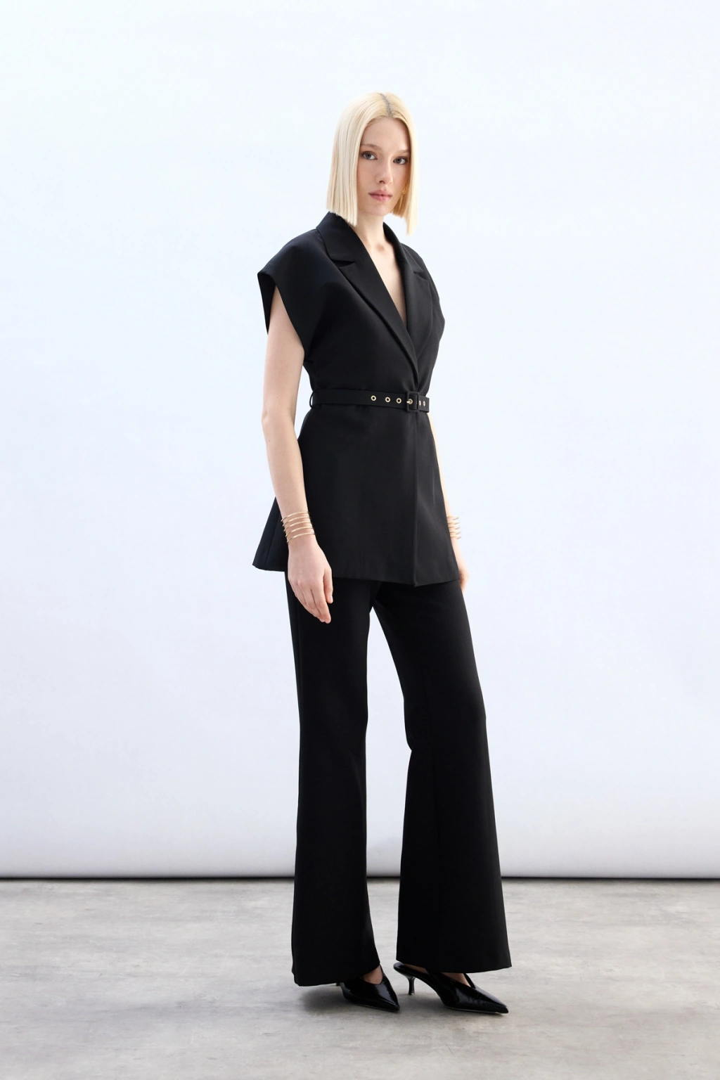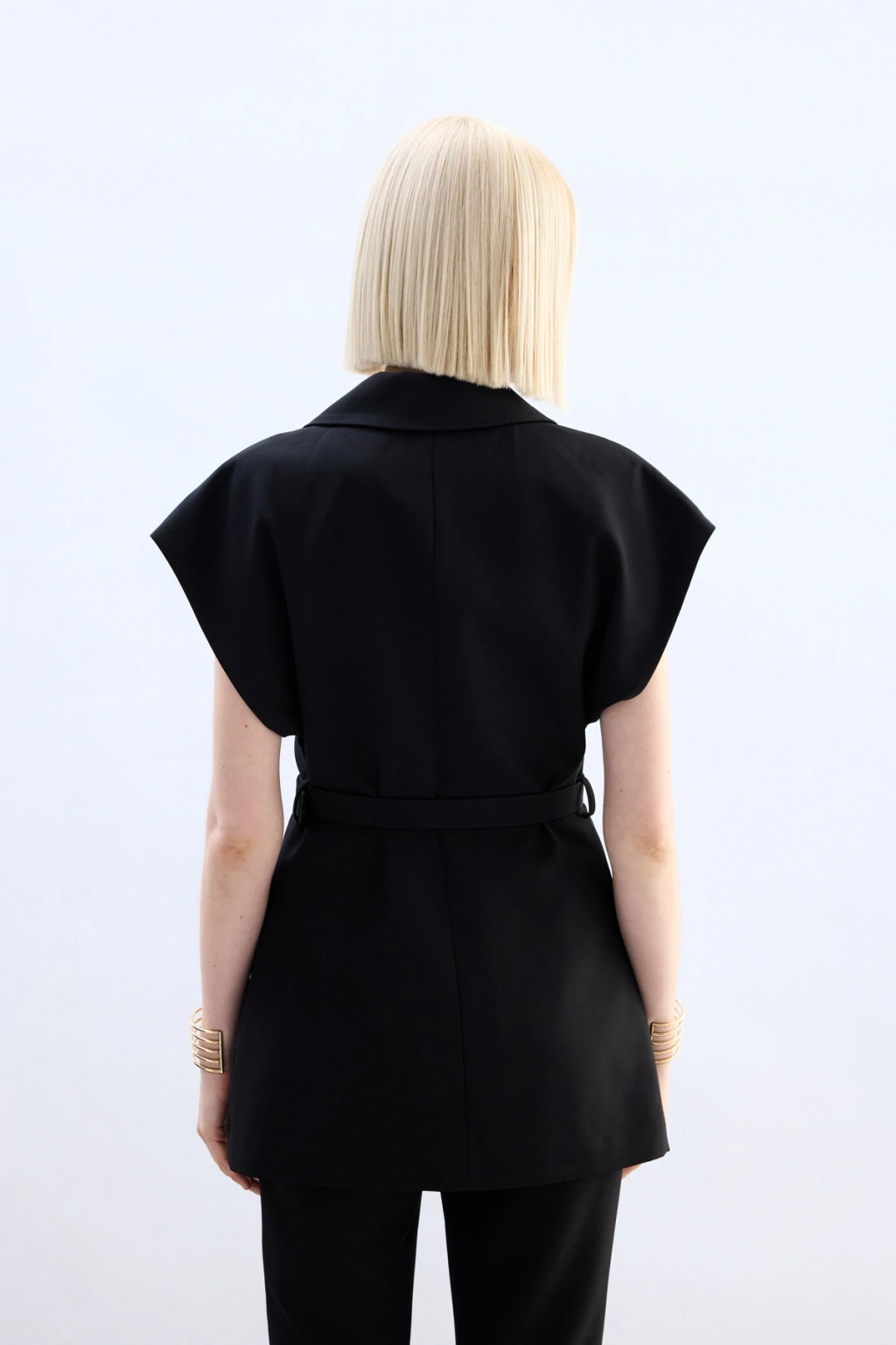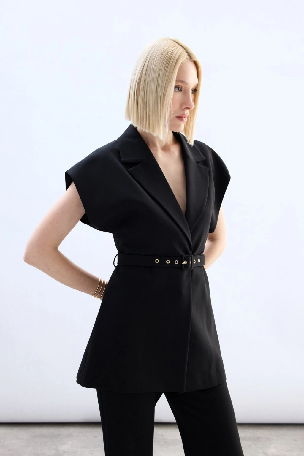 Omuz Aksesuarlı Kuşaklı Yelek - Siyah