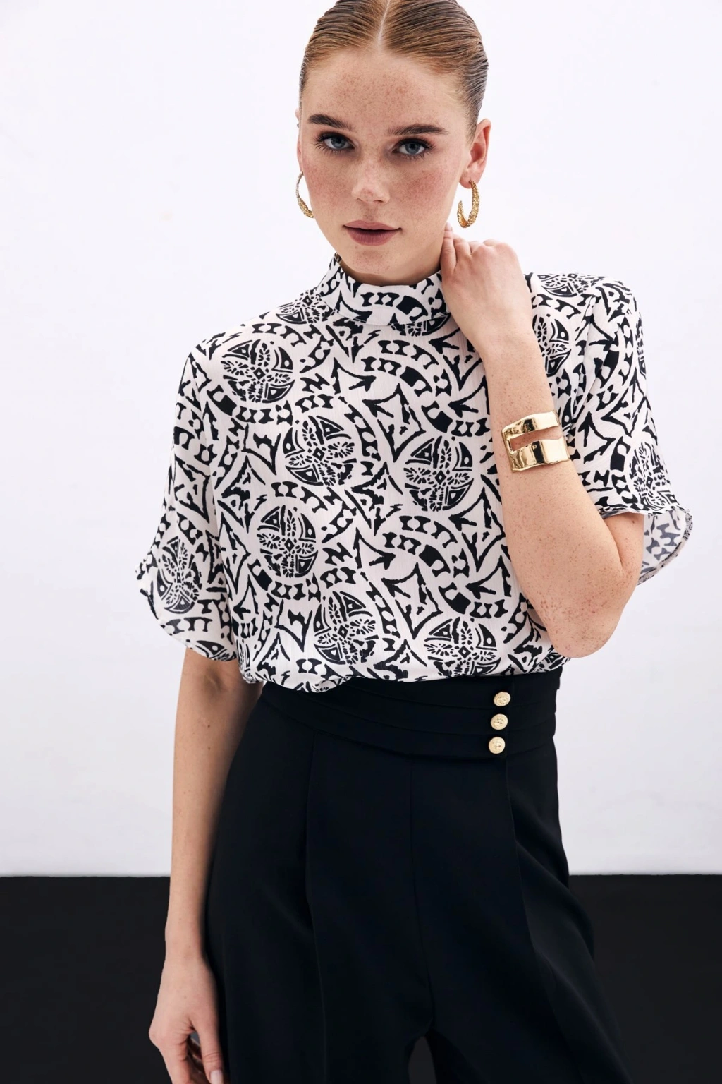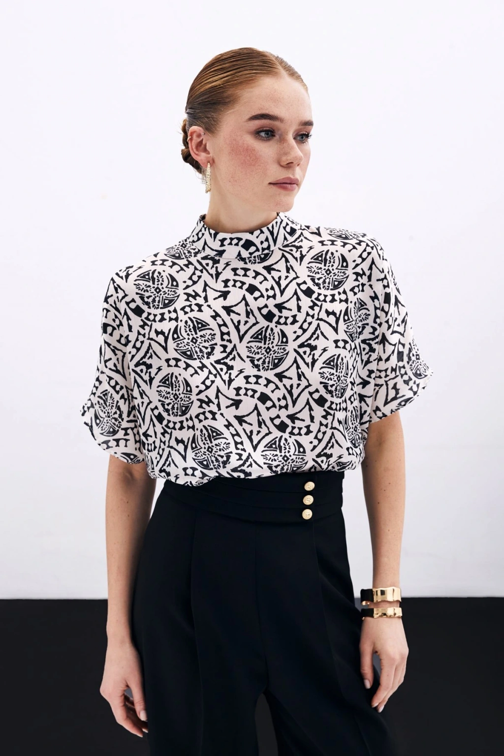 Kısa Kol Desenli Bluz - Ekru