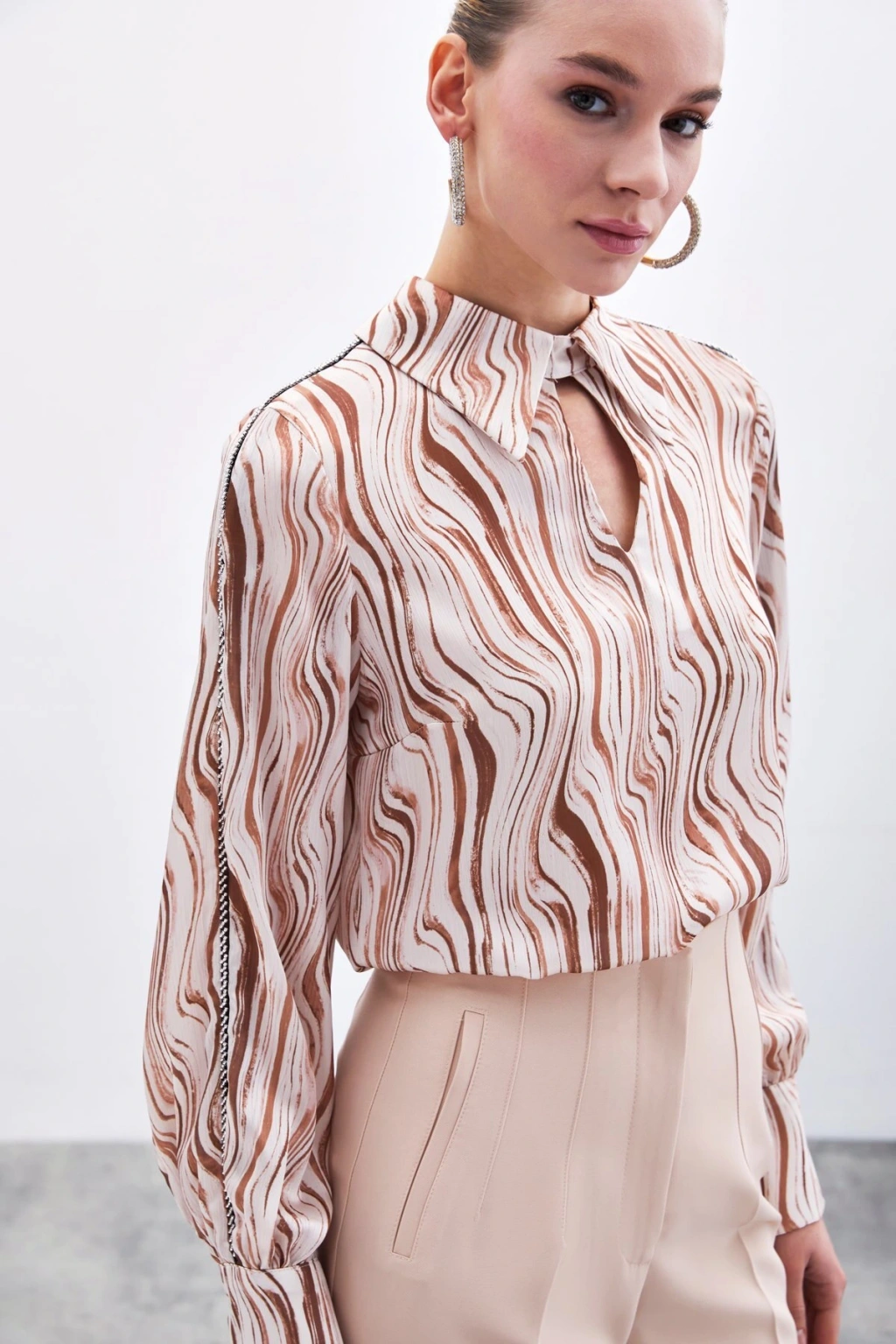 Kol Aksesuarlı Desenli Bluz - Camel