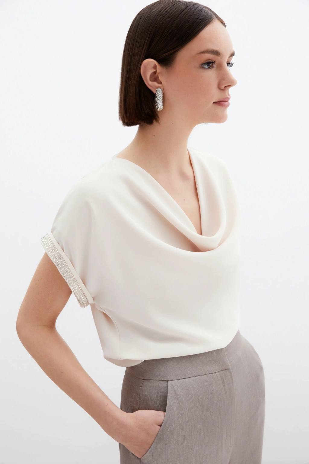 Dik Yaka Şifon Kol Detaylı Bluz - Bej