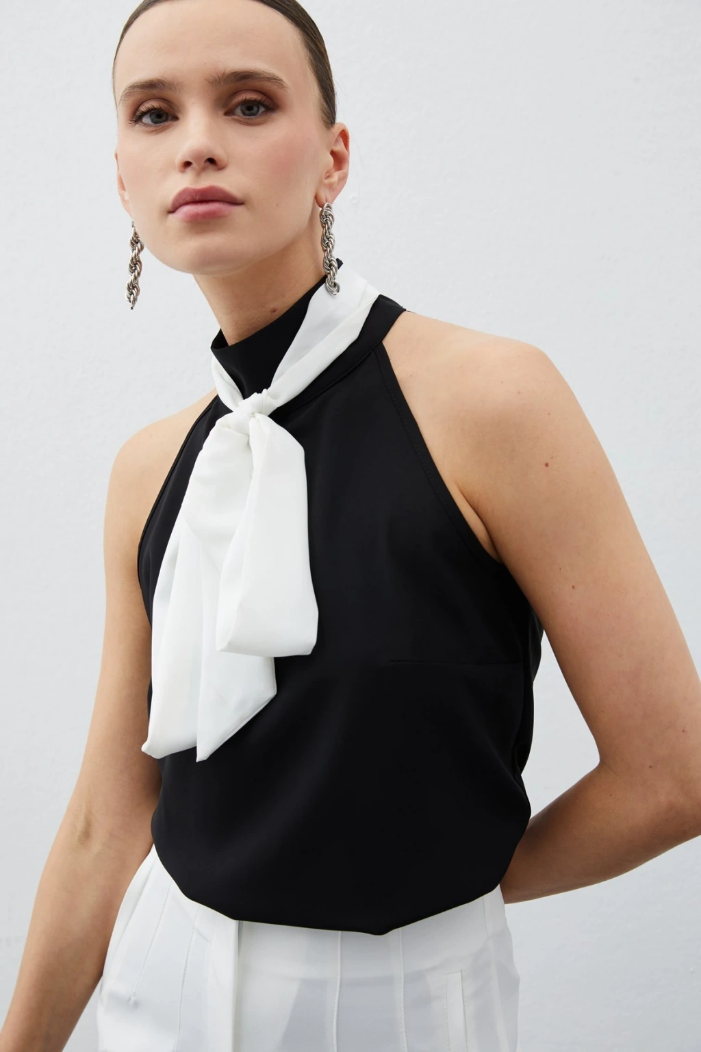Kontrast Fularlı Kolsuz Bluz - SİYAH