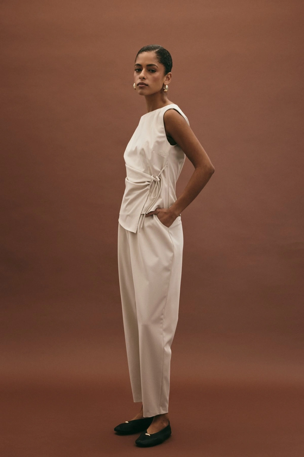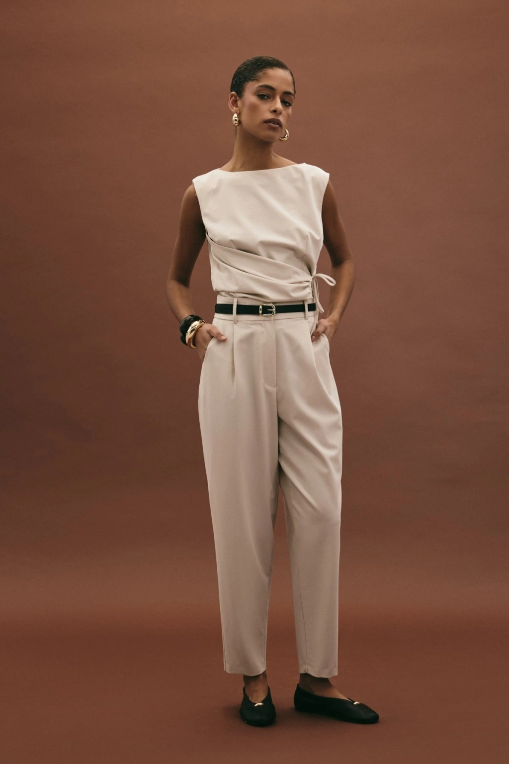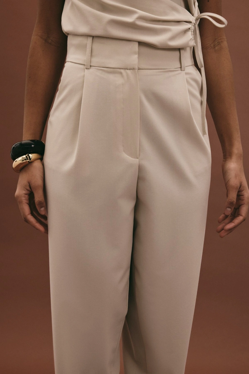 Yüksek Bel Önü Dikişli Beli Apoletli Düğmeli Boru Paça Kumaş Pantolon - Siyah