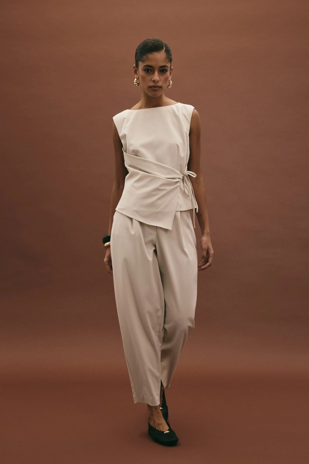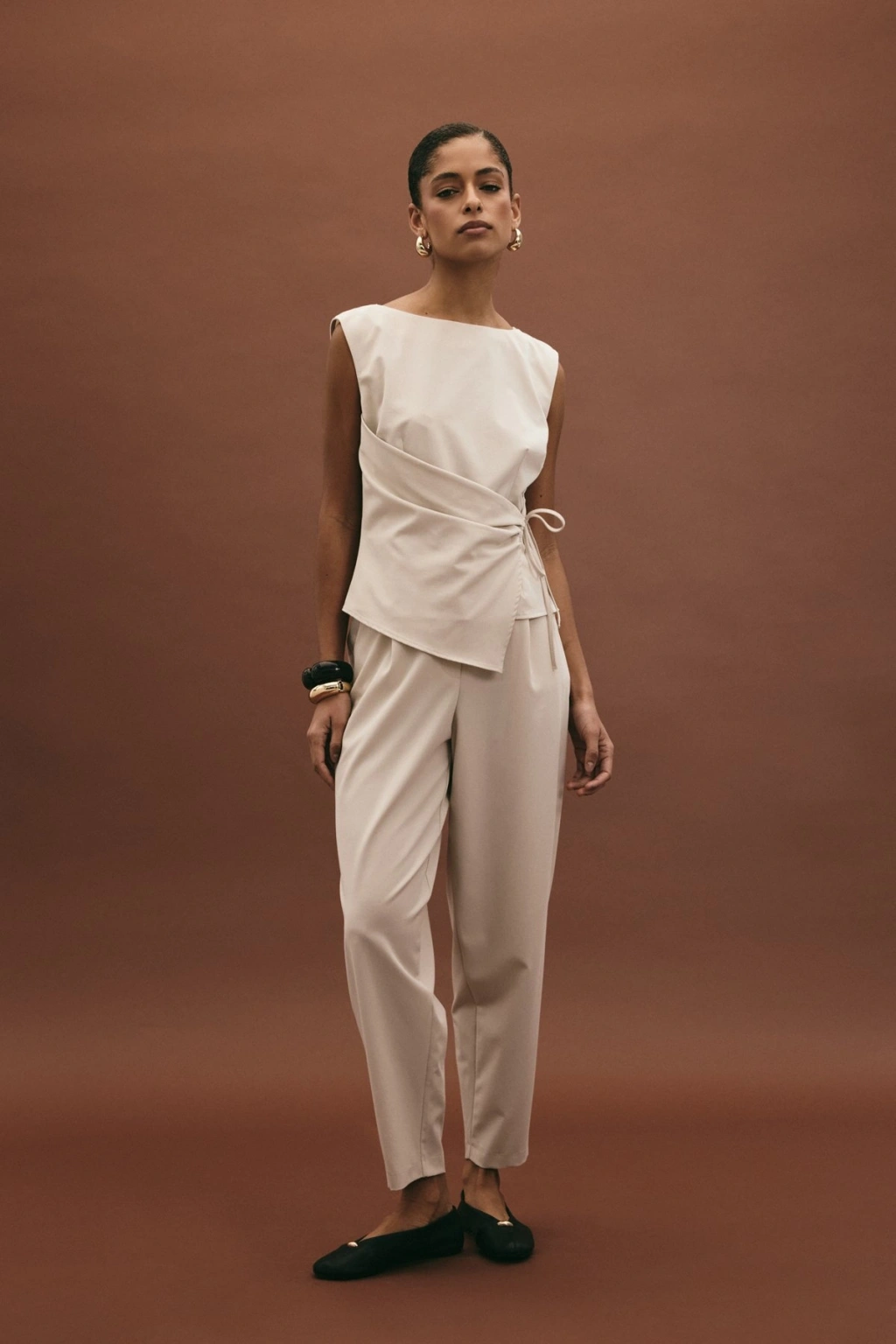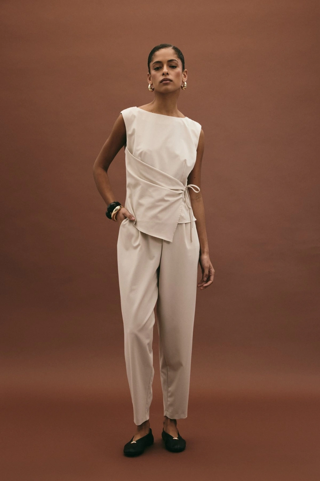 Yüksek Bel Önü Dikişli Beli Apoletli Düğmeli Boru Paça Kumaş Pantolon - Siyah