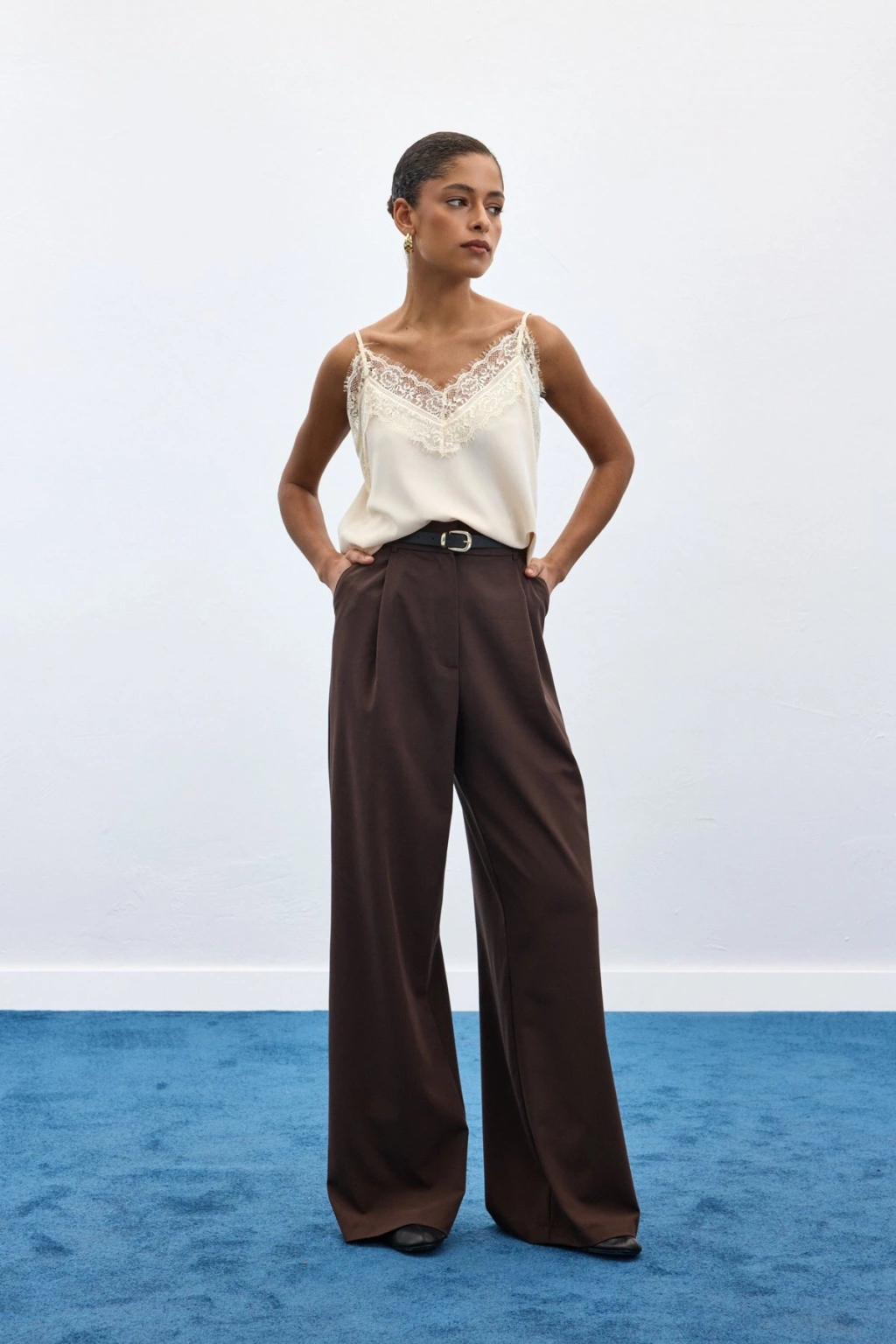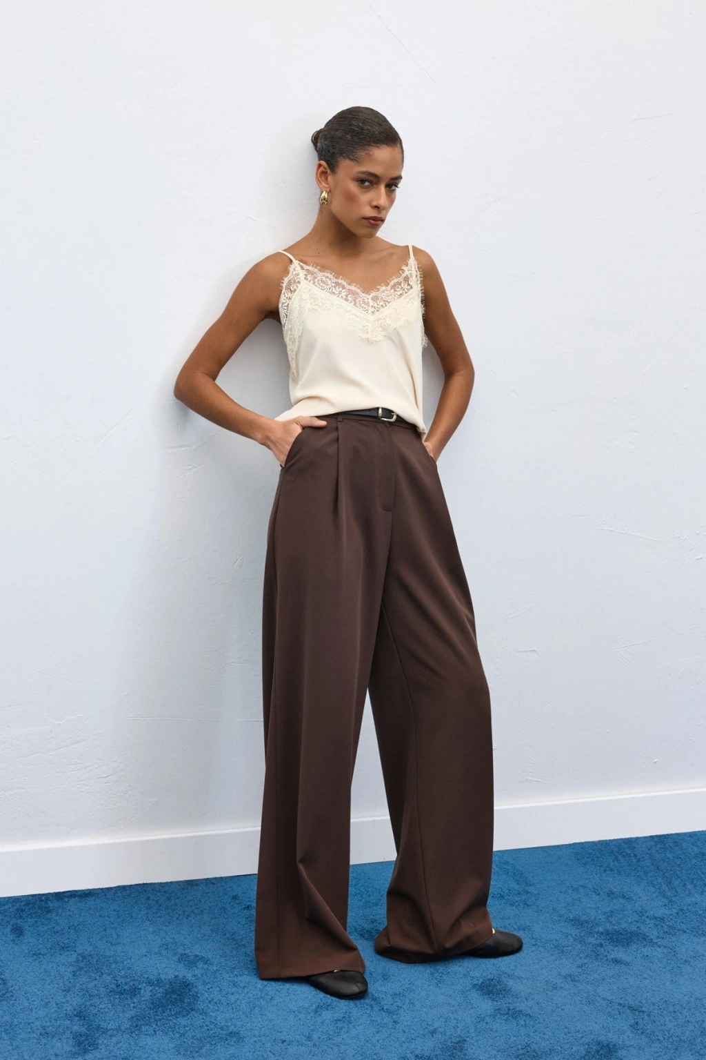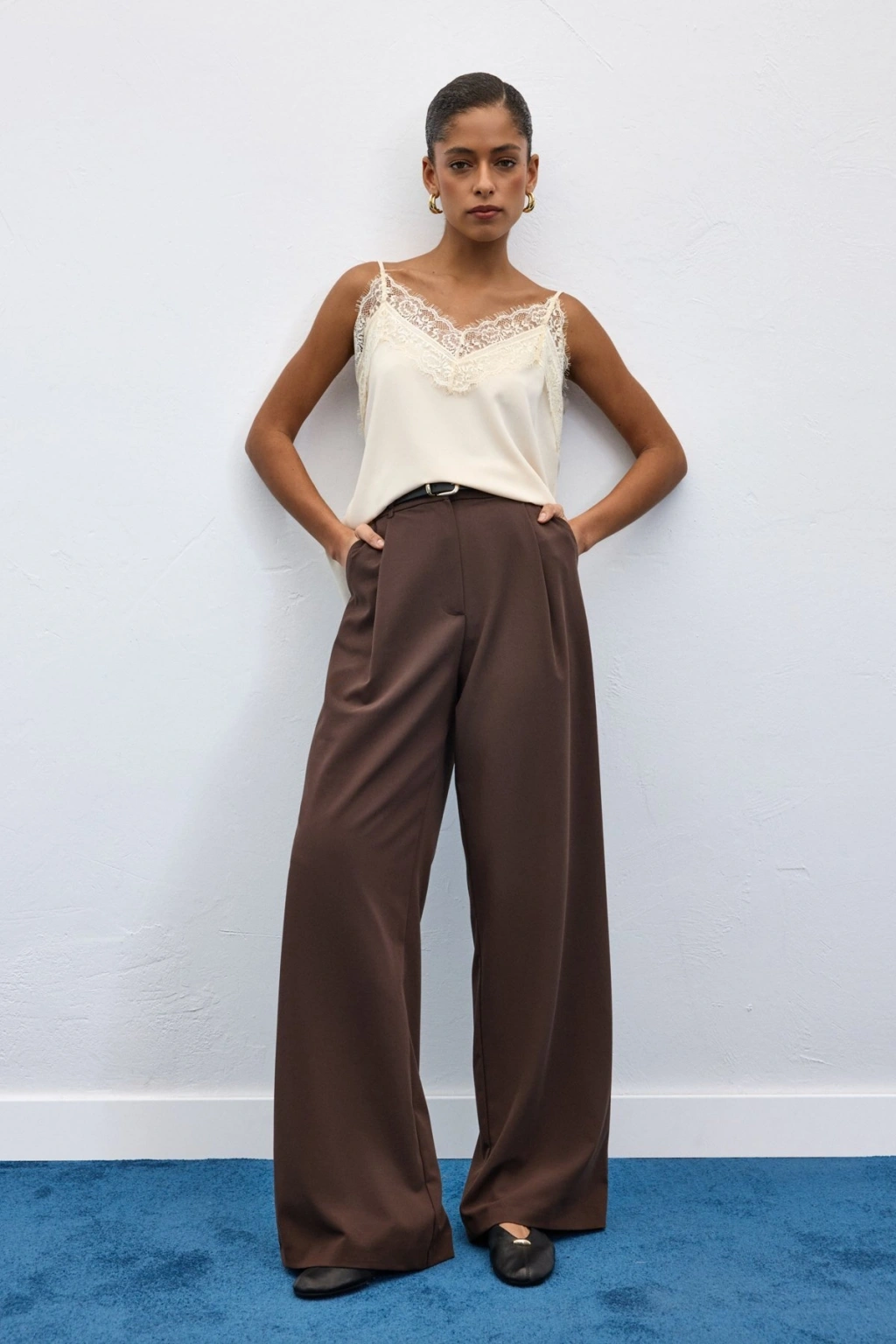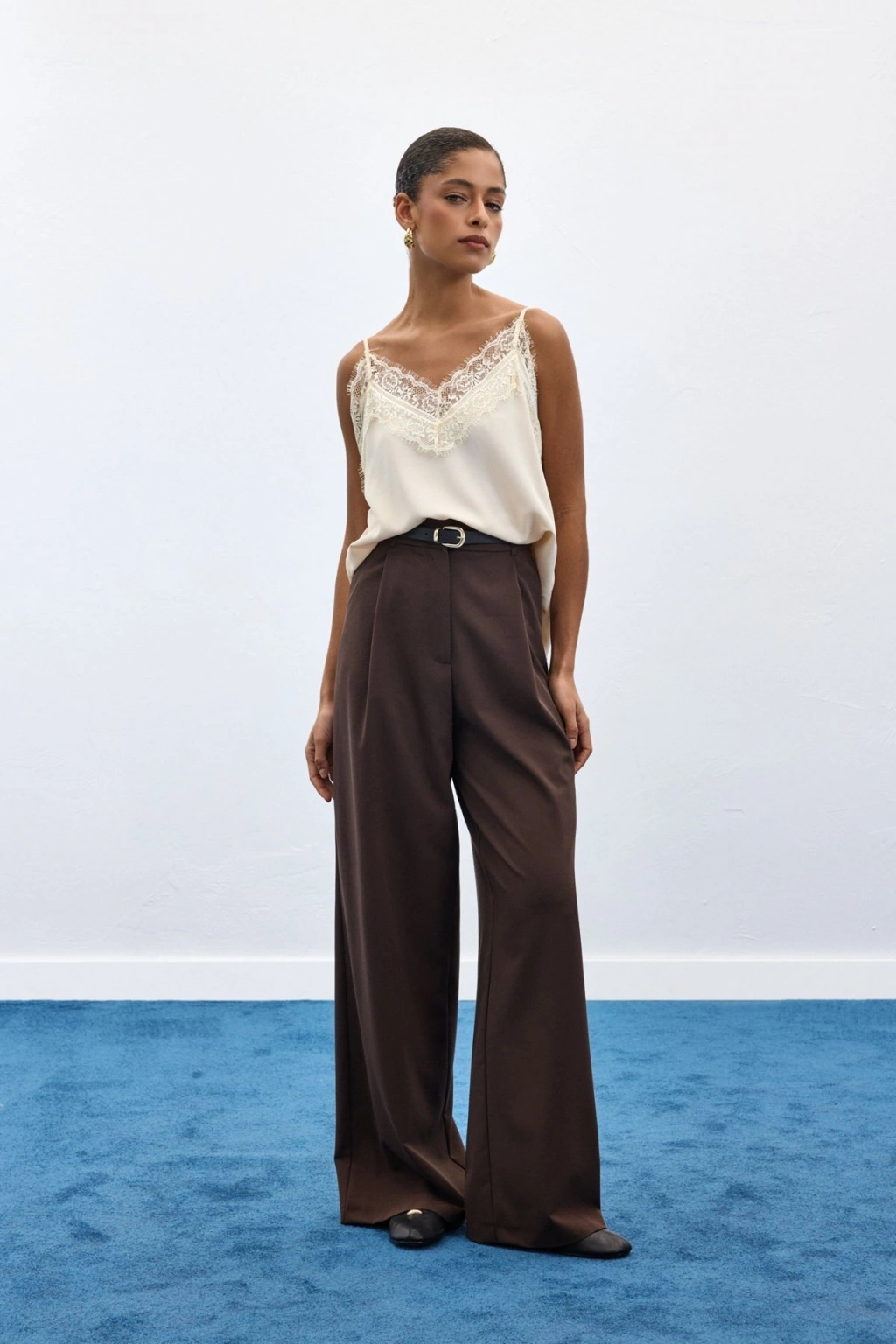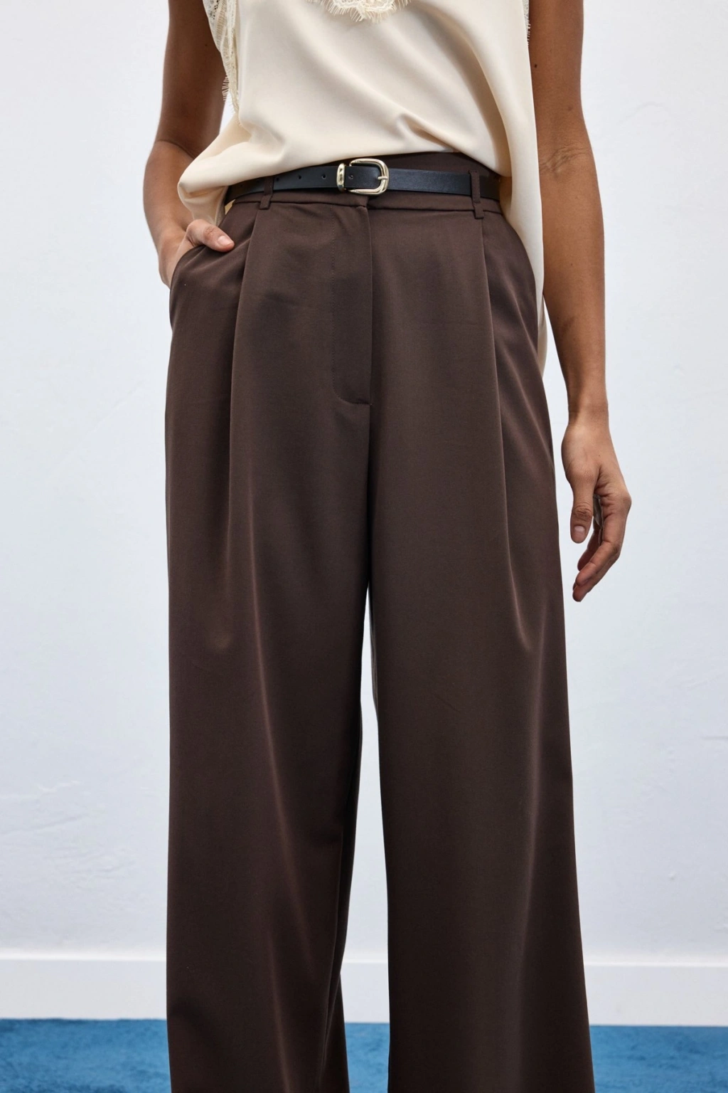 Yüksek Bel Önü Dikişli Beli Apoletli Düğmeli Boru Paça Kumaş Pantolon - Siyah